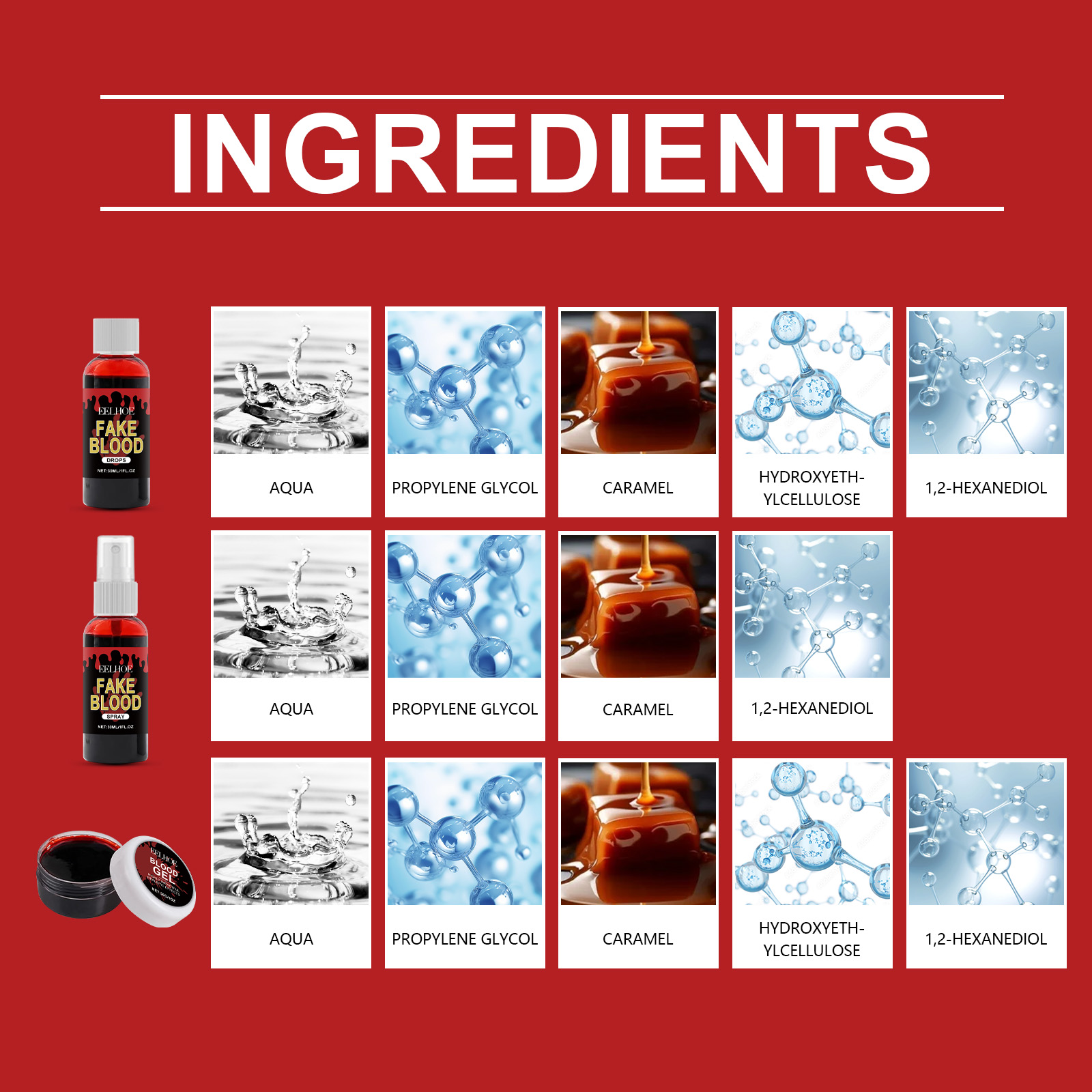 | 成分 | 血浆滴剂:羟乙基纤维素、1,2-己二醇,血浆喷雾:焦糖色、1,2-己二醇,血块:焦糖色、羟乙基纤维素 |