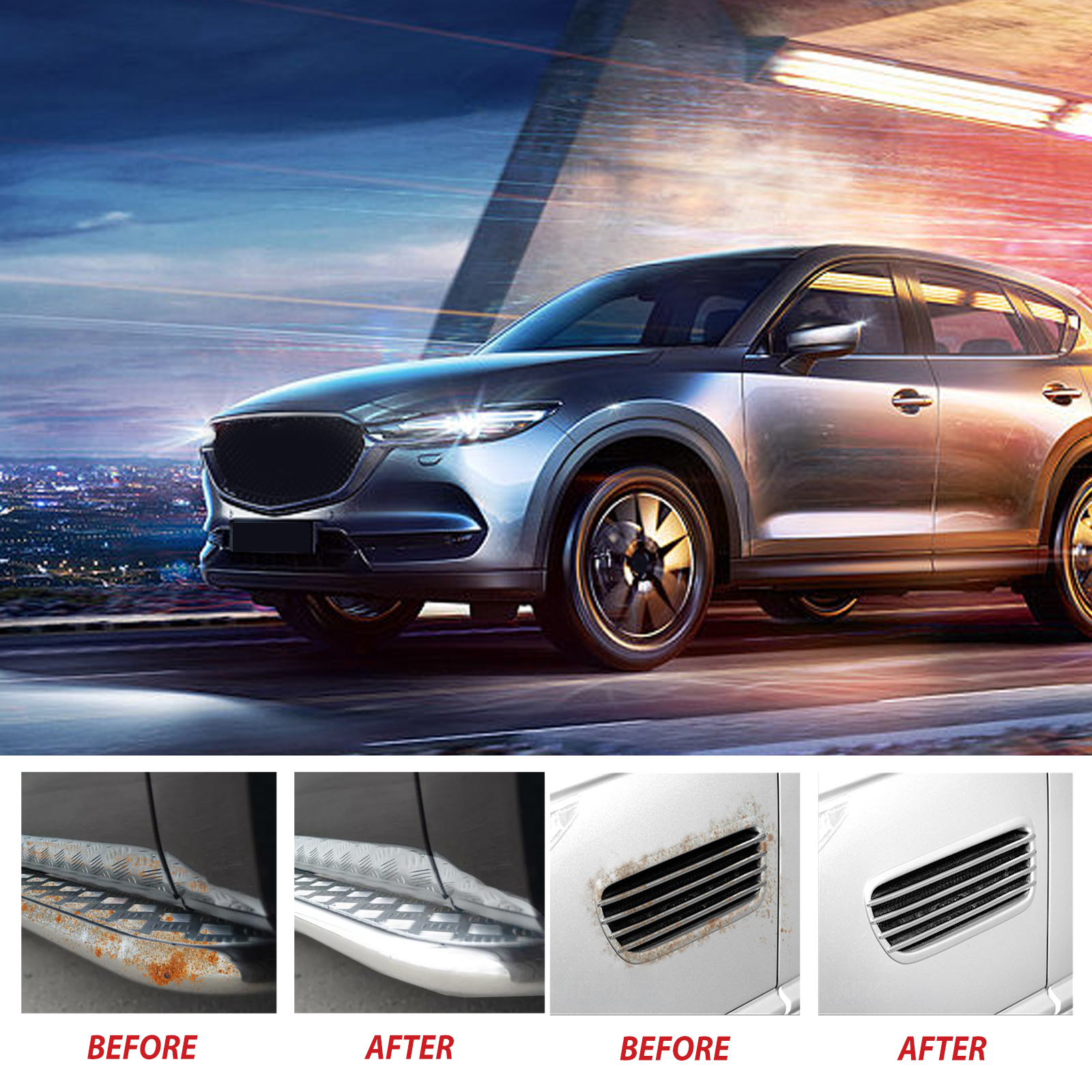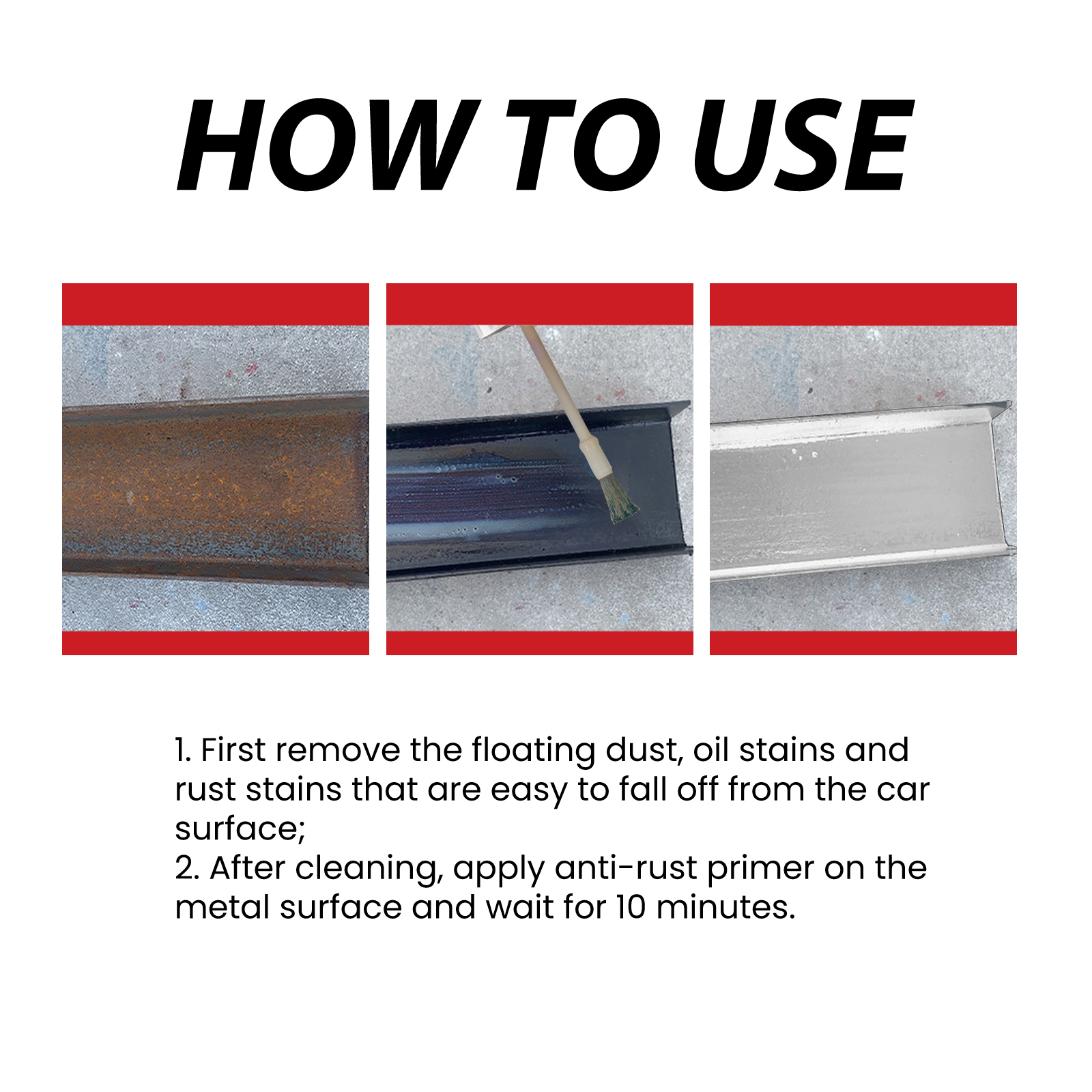 我们的汽车免除锈底漆含有环氧树脂、改性醇酸树脂、锌粉。它可以将铁锈转化为保护膜,在除锈的同时保护原表面。它的使用方法很简单:首先清除汽车表面易脱落的浮尘、油渍和锈渍,清洗完毕后,在金属表面涂上防锈底漆,等待10分钟即可。可以在表面形成保护膜,防刮痕,防酸雨,抗高温,持久保护。