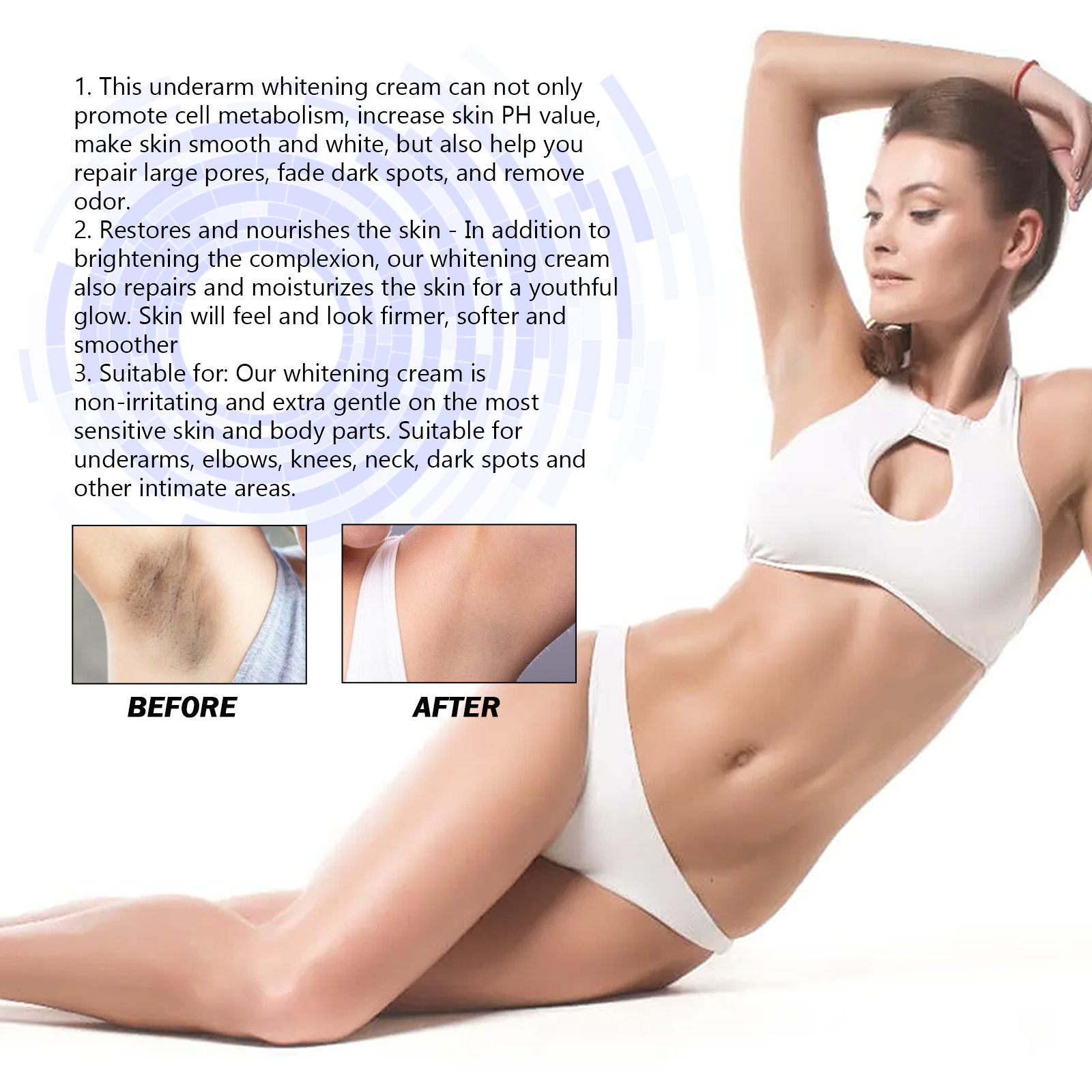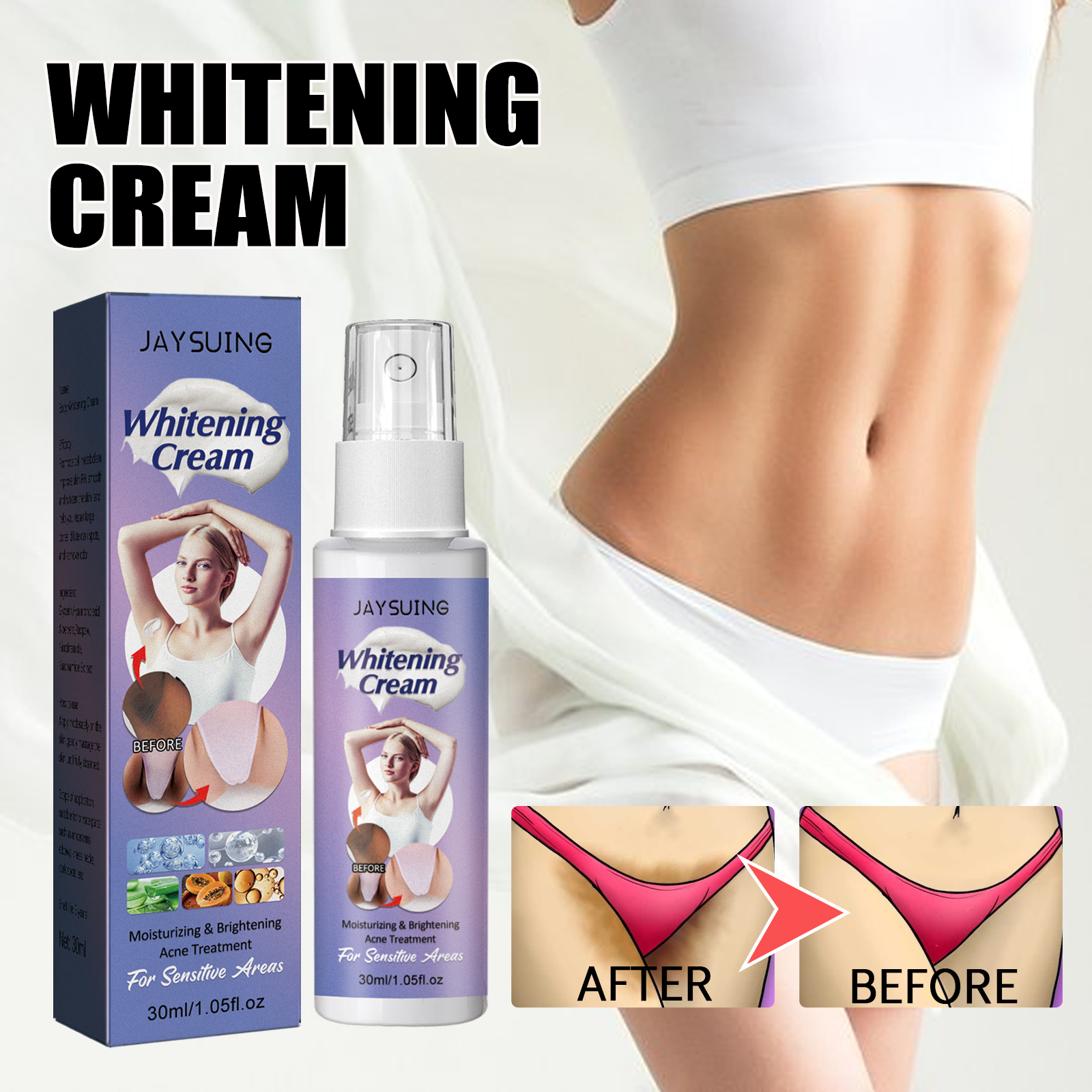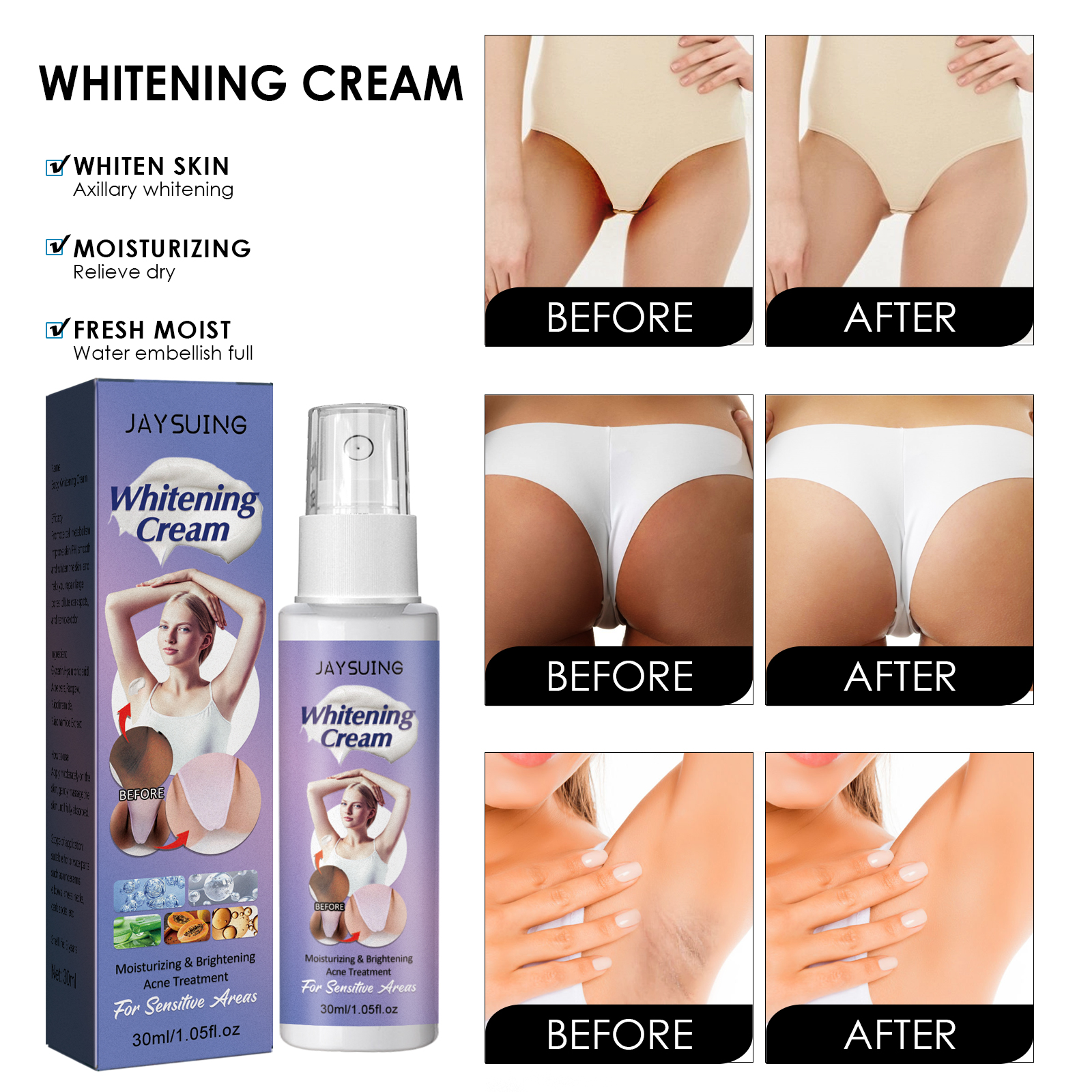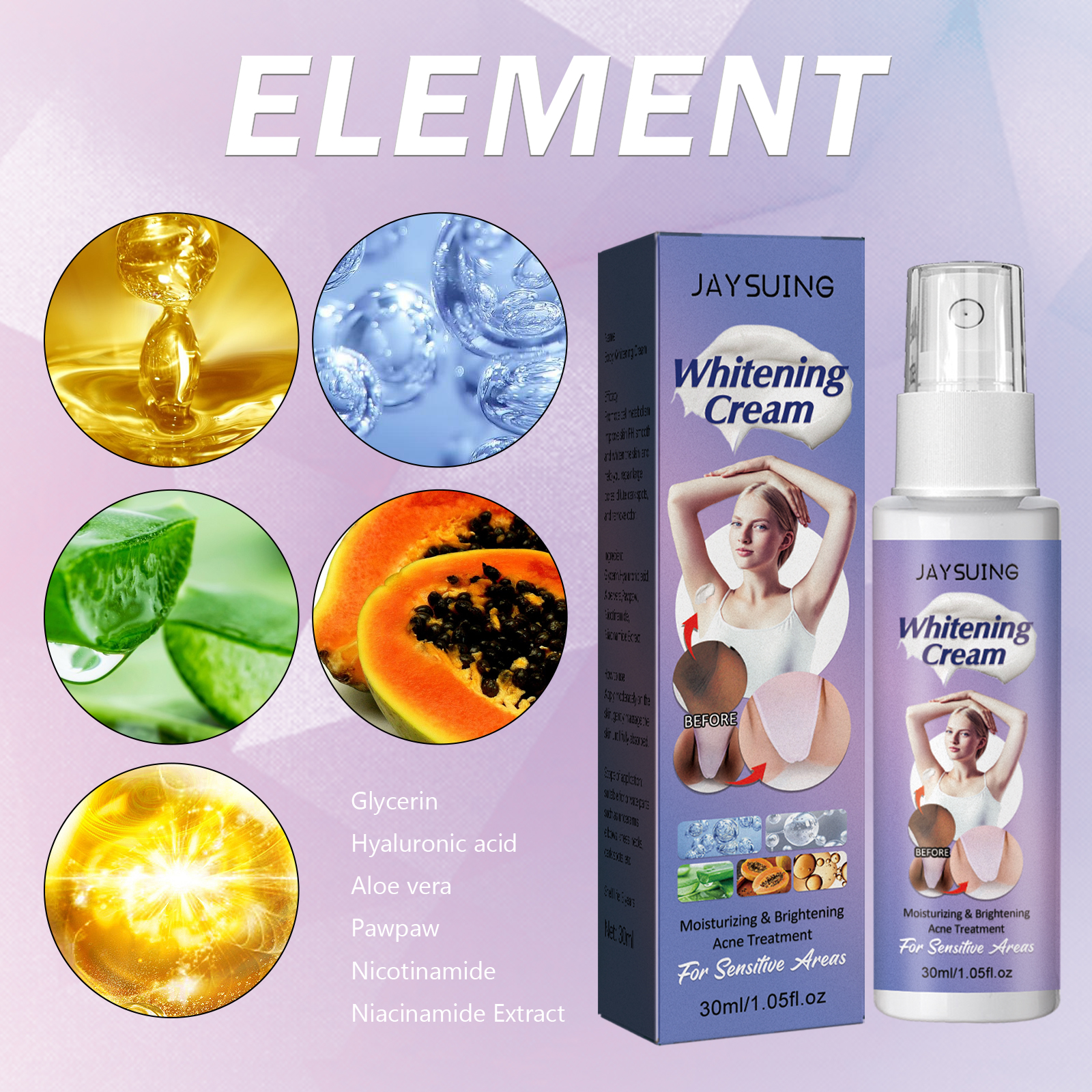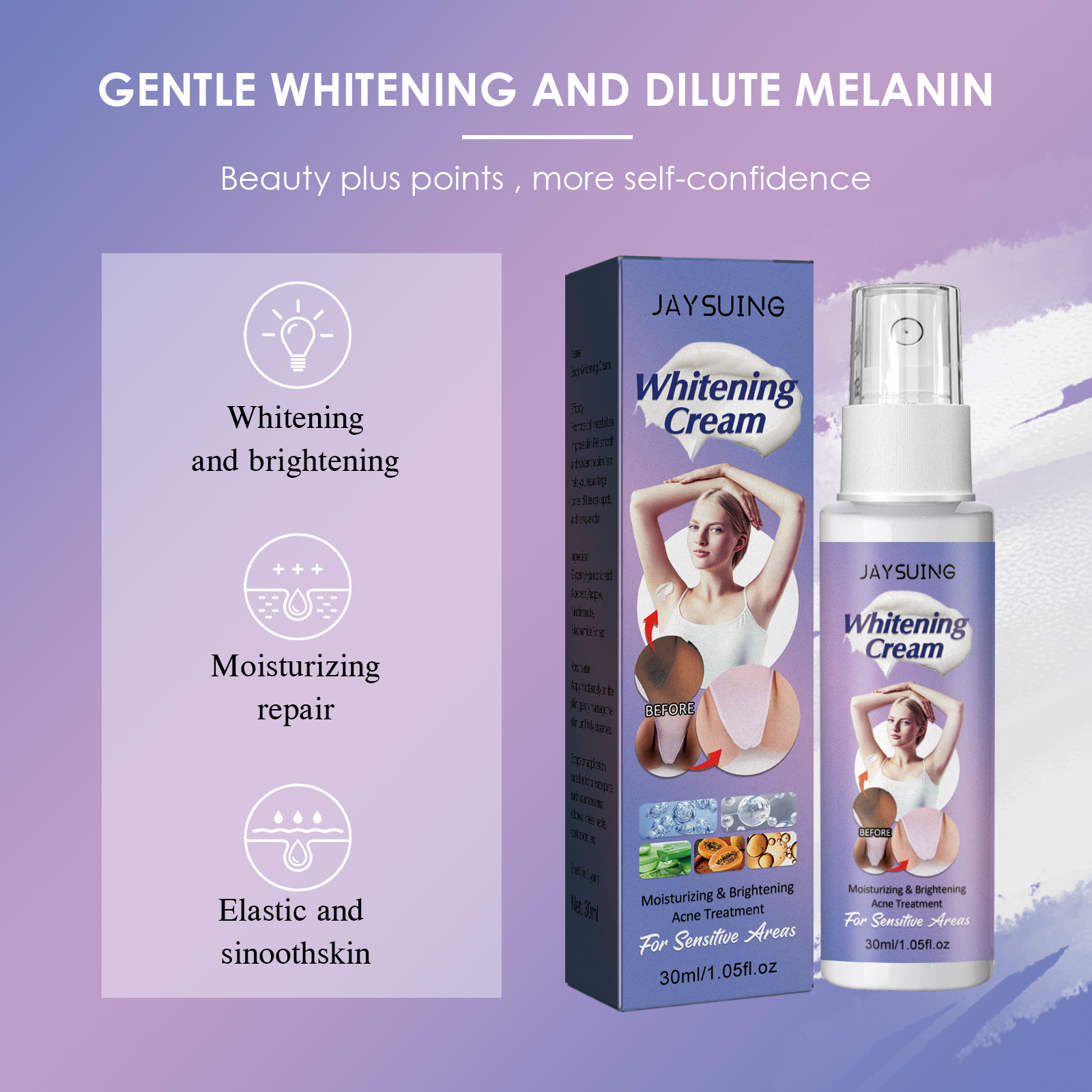 我们的祛黑美肤乳液喷雾含有甘油,透明质酸,芦荟。它可以促进细胞生长新陈代谢,增加皮肤PH值,使皮肤光滑白皙,还能帮助你修复毛孔粗大,淡化黑斑,去除异味。除了提亮肤色,修复和滋养肌肤同时修复和滋润肌肤,焕发青春光彩。皮肤会看起来感觉更紧致、柔软和光滑,无刺激性,对最敏感的皮肤和身体部位非常温和。适合腋下,肘部、膝盖、脖子、黑点和其他私密部位。它的使用方法很简单:使用前要做好清洁工作,洗澡后效果会更好。在需要的部位涂抹适量的祛黑美肤乳液。轻轻地打圈按摩,直到吸收为止。早晚各涂一次,并坚持使用。使皮肤时刻美白保湿,缓解干燥,清新润泽,水润饱满。