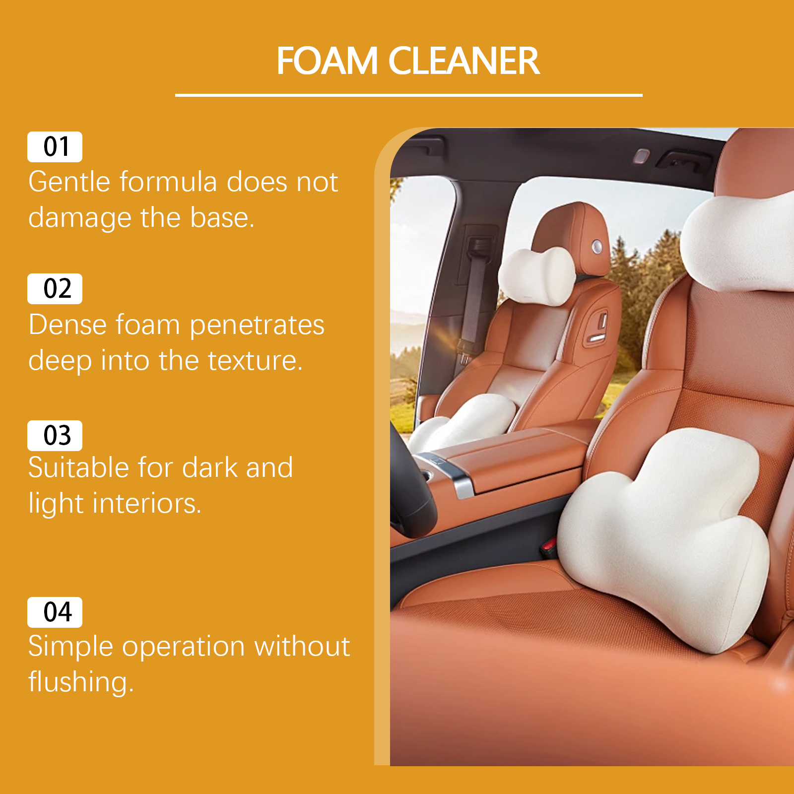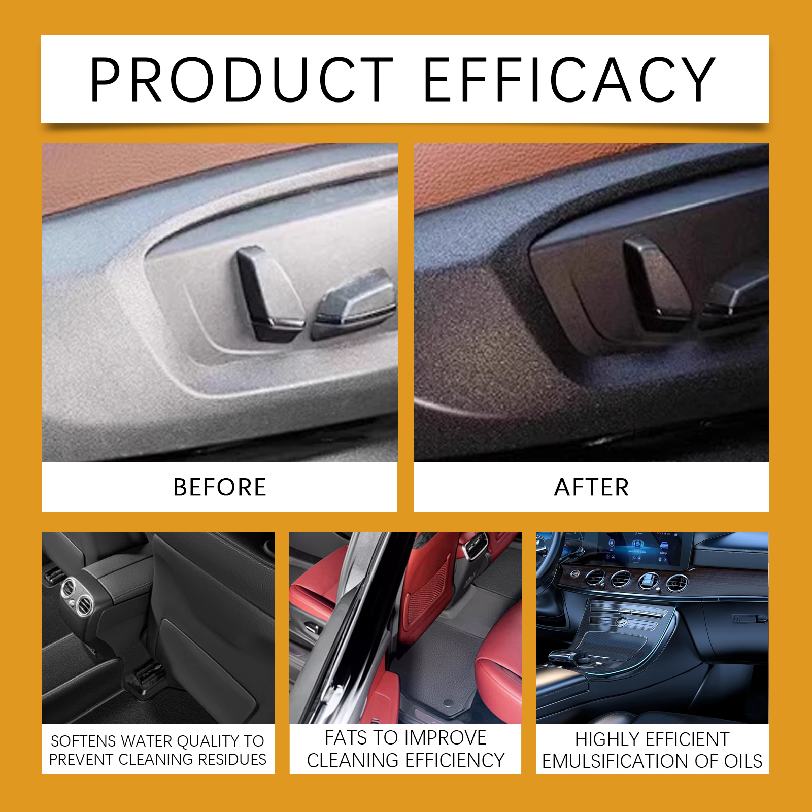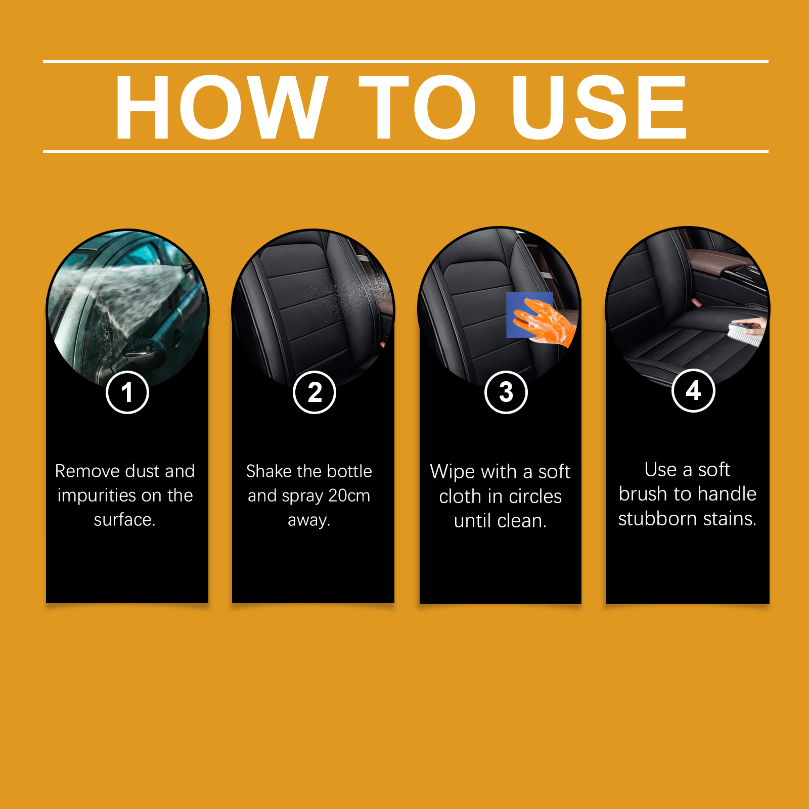 我们的多功能泡沫清洁剂含有表面活性剂,去离子水。它可以轻松乳化接触到的油脂和污垢,泡沫致密,不伤手或物品,安全快捷。它的使用方法很简单:首先拿出喷雾,之后直接喷在需要清洗的地方,最后用海绵或毛巾擦拭该地方即可,使用后快速清洁汽车内部的油脂污垢,让汽车内部焕然一新。