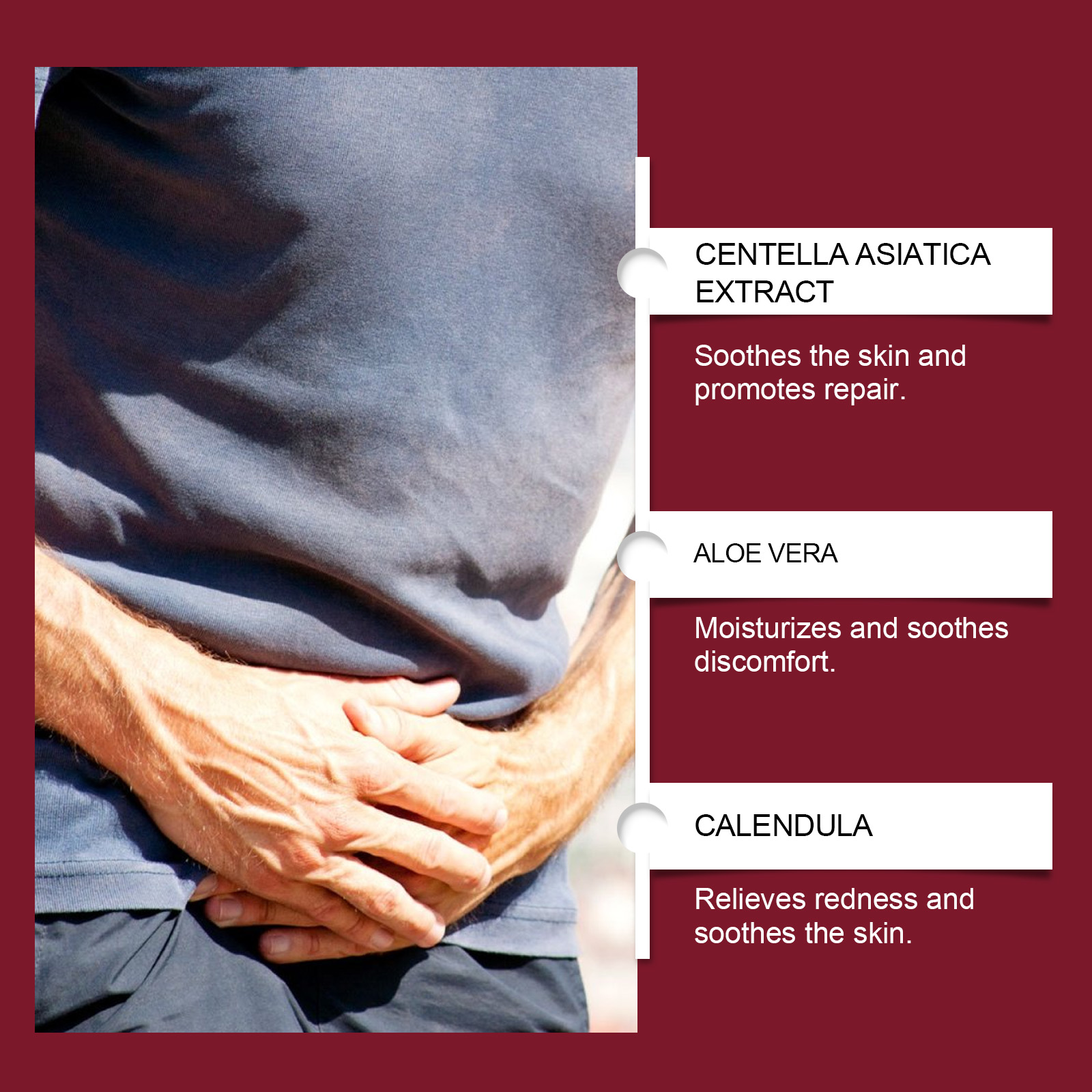 我们的男士身体护理喷雾,由金盏花洋甘菊、茶树油精心调配而成。专为男士缓解不适设计。使用方法极为便捷:清洁并擦干皮肤,在患处喷洒适量并按摩至吸收。并且可以快速缓解红肿,恢复舒适。