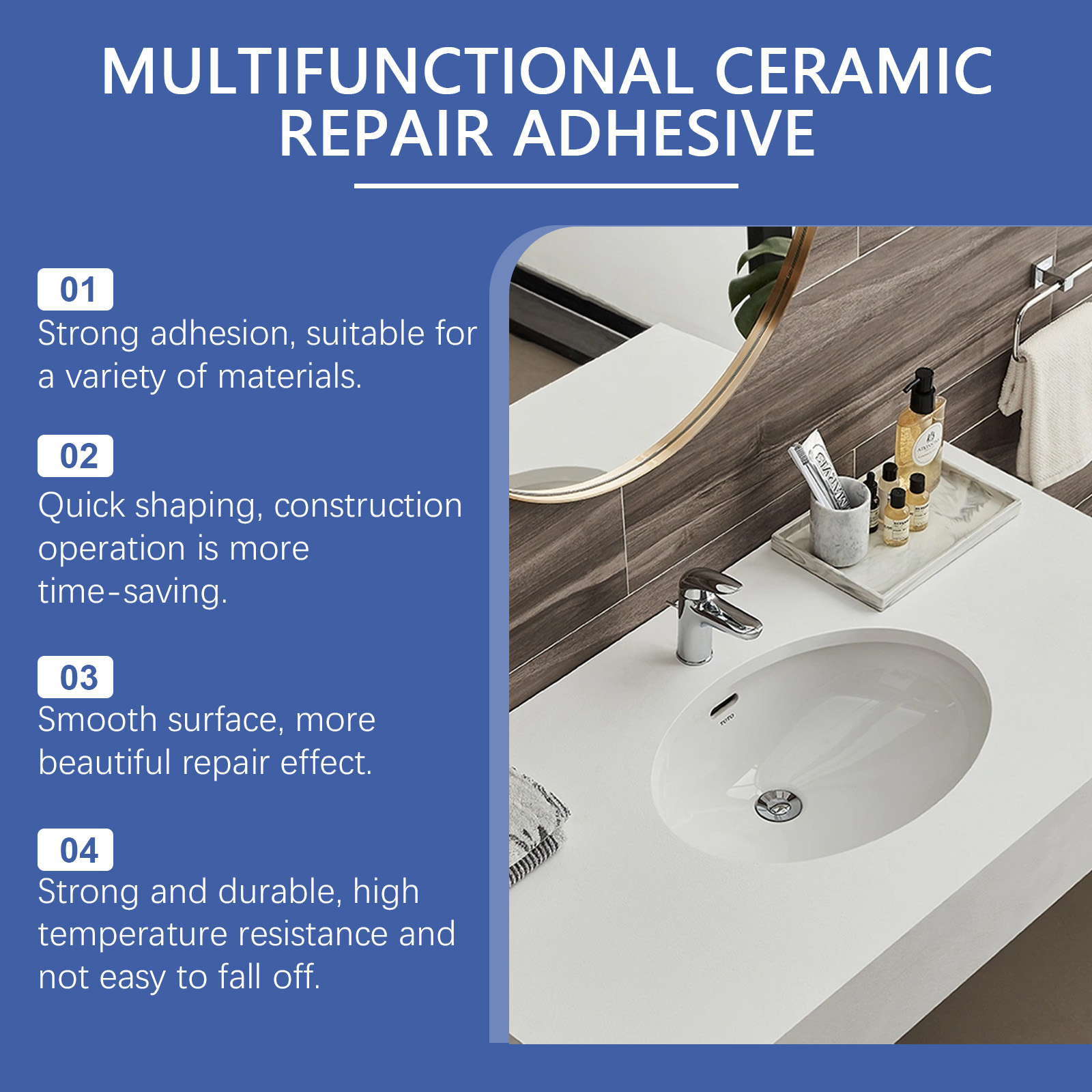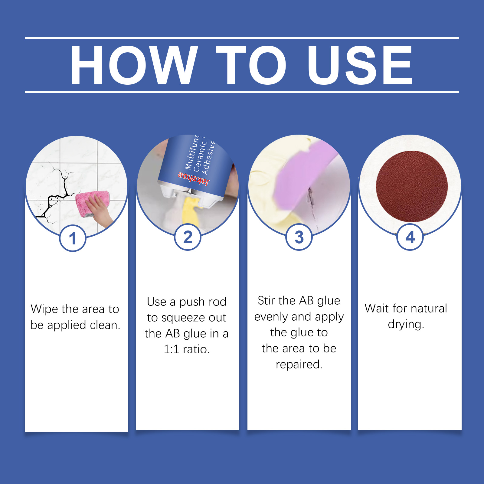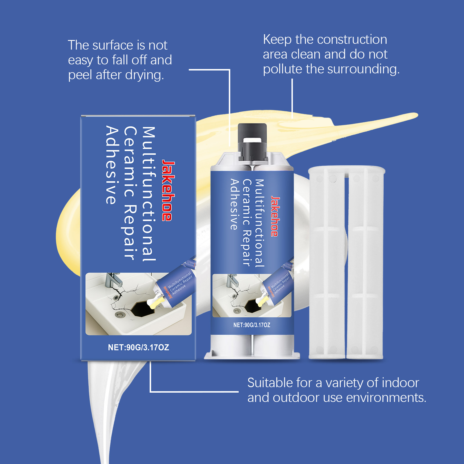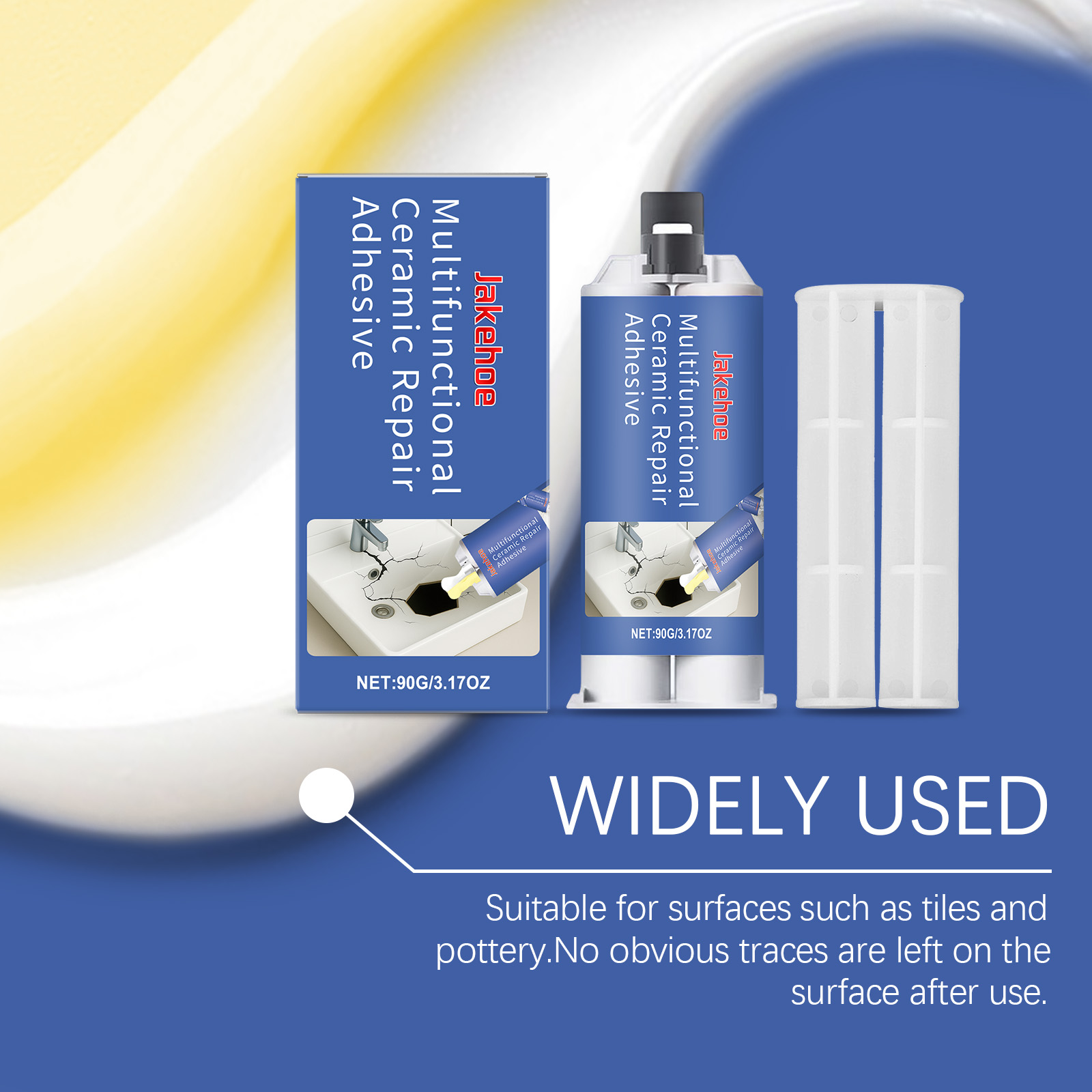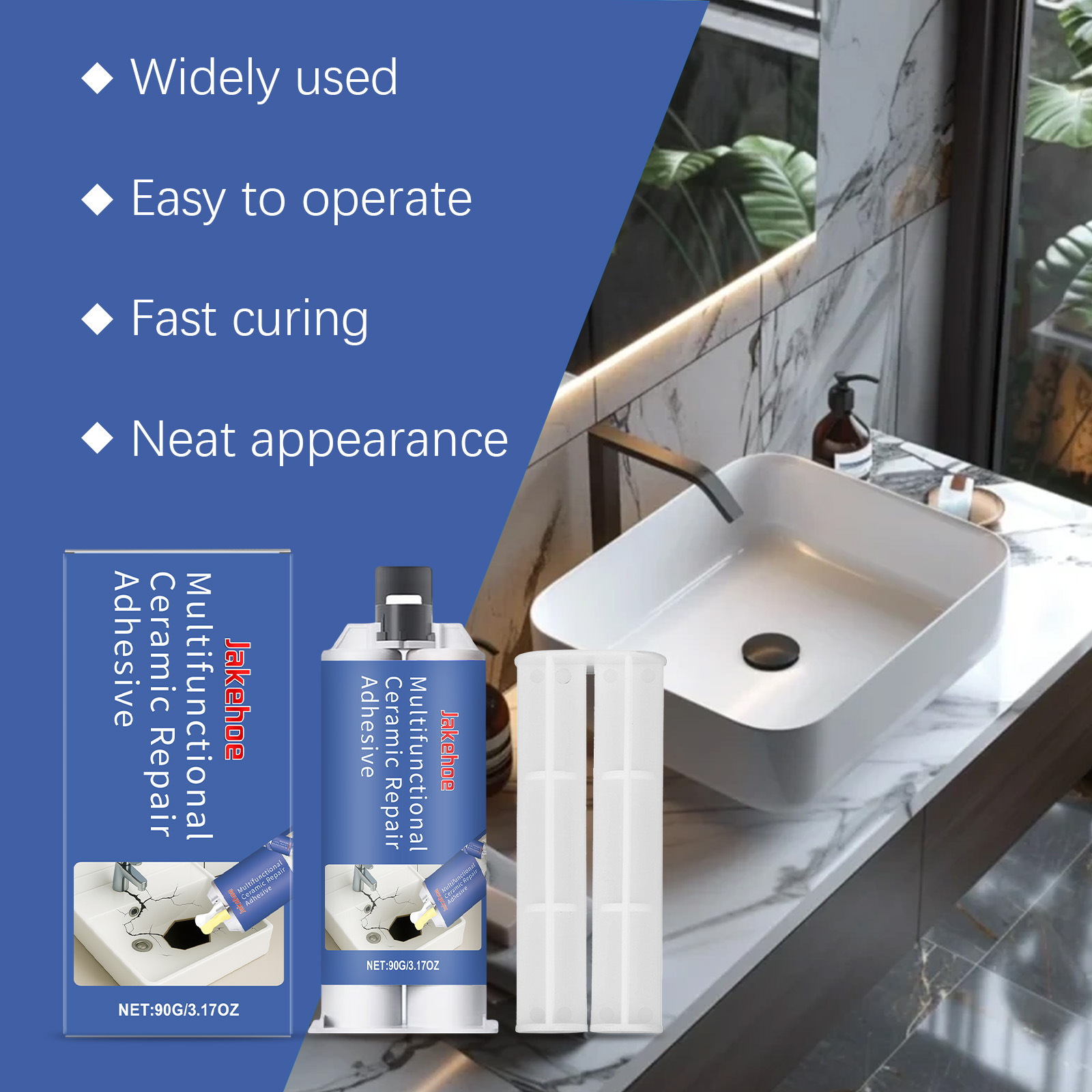 我们的多用途陶瓷胶,由A胶:环氧树脂、碳酸钙,B胶:甲苯、环氧氨基胺精心调配而成。专为提高表面附着力和固化硬度设计。使用方法极为便捷:擦拭要涂抹的区域以确保清洁。使用推杆以1:1的比例挤出AB胶。均匀搅拌AB胶并将胶水涂抹在要修复的区域。等待自然干燥。并且它可以适用于多种表面,可以修复各种陶瓷和瓷器产品,如浴缸、马桶、花瓶等,优异的粘接效果,可以在陶瓷表面形成无缝且耐用的粘接。
