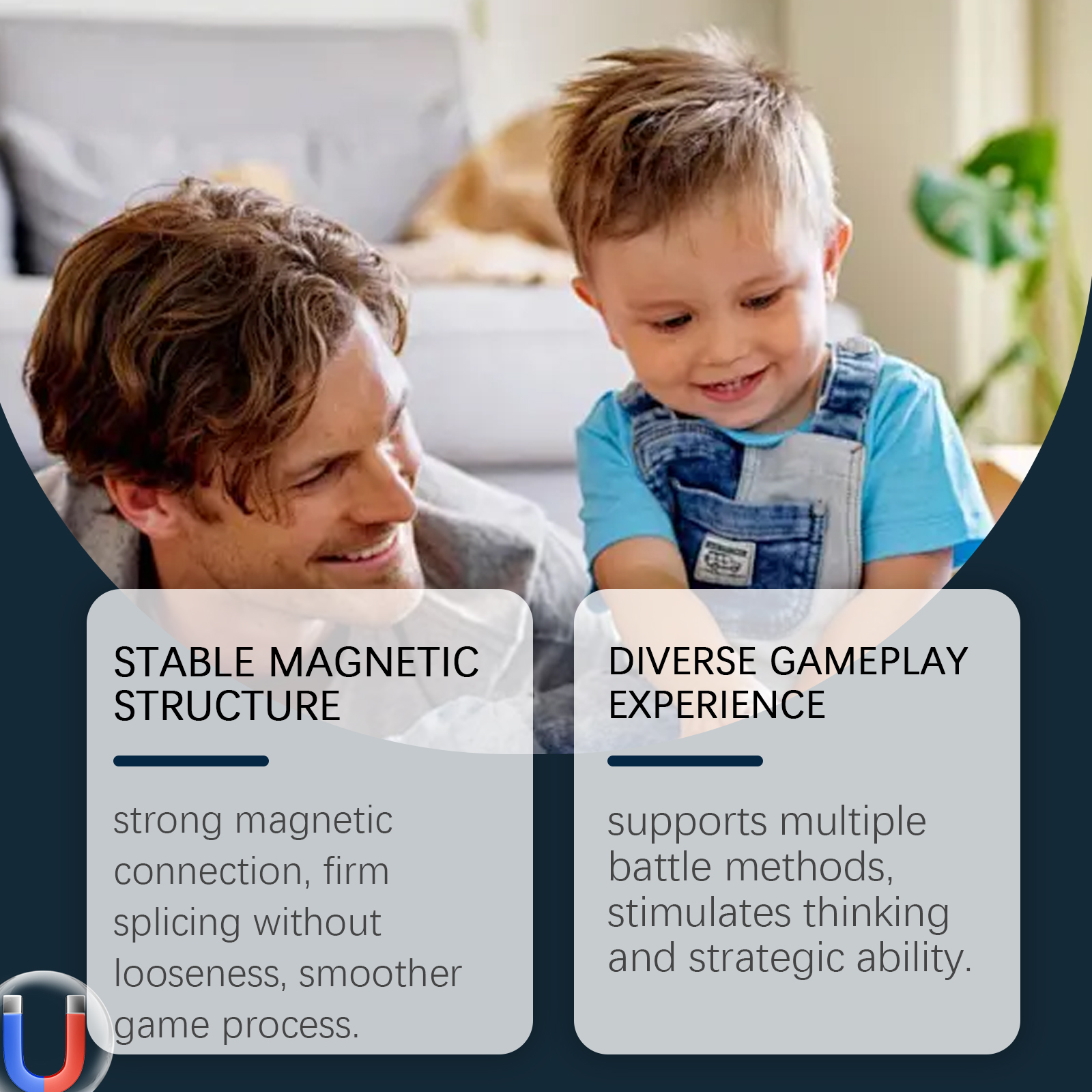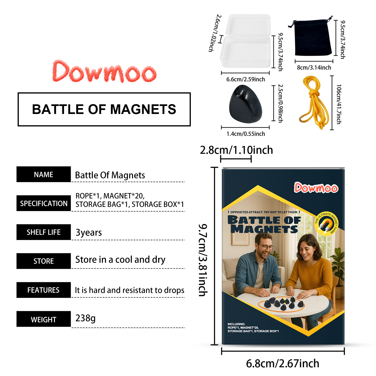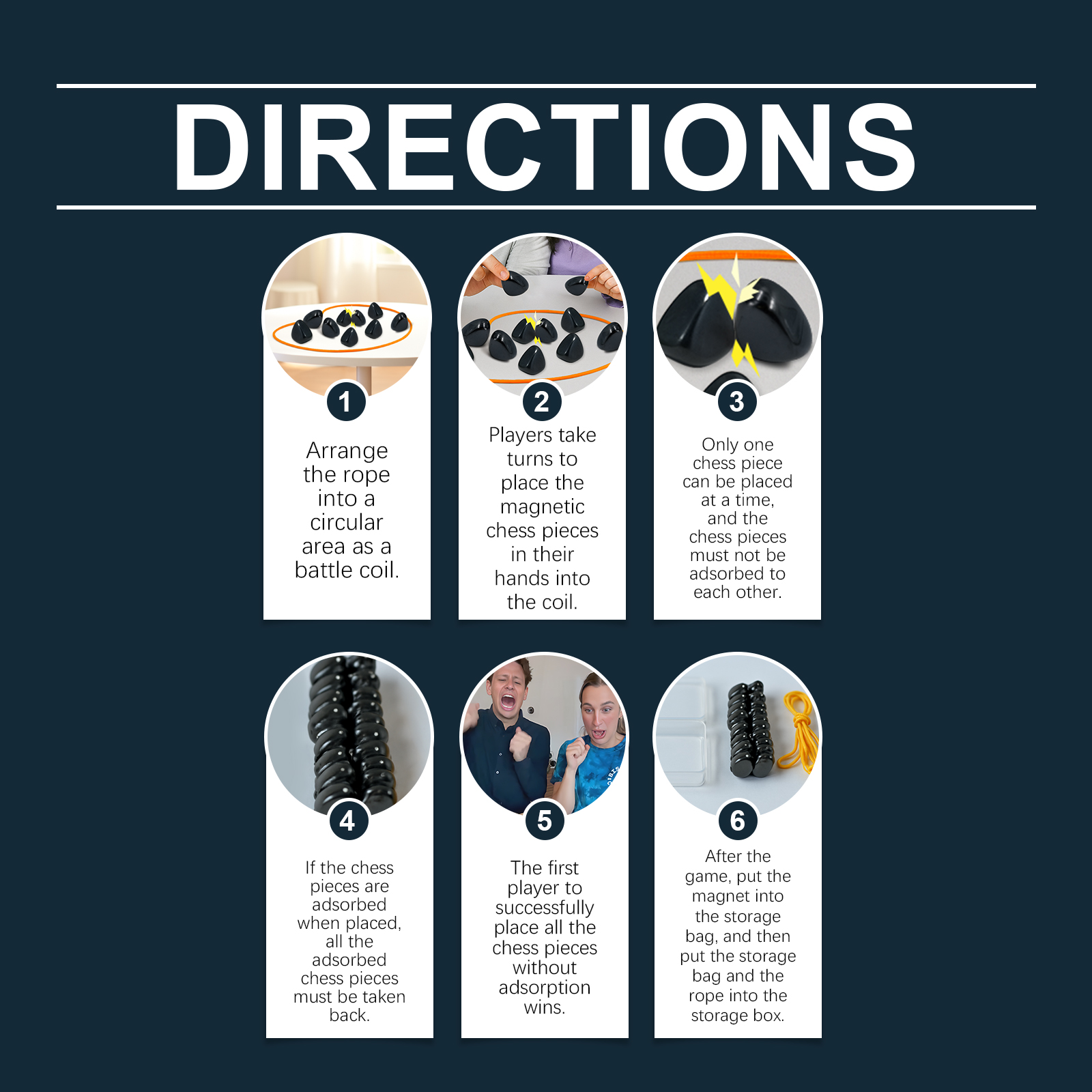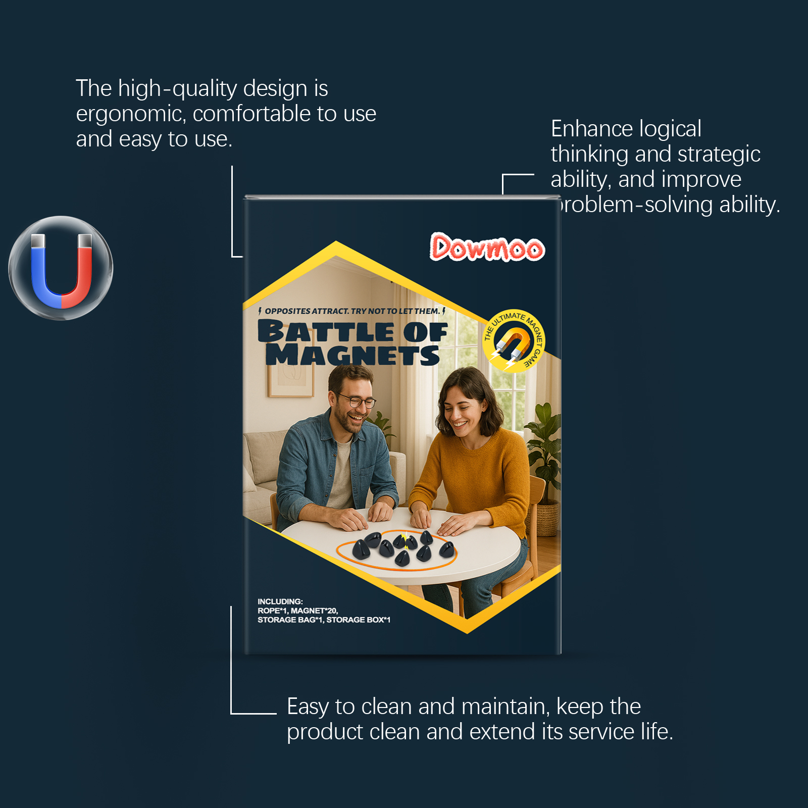 我们的磁力效应棋,由带磁的铁氧体精心调配而成。专为锻炼小孩子逻辑思维、空间感与专注力设计。使用方法极为便捷:1. 将绳子摆成一个圆形区域,作为对战线圈。2. 玩家轮流将手中的磁力棋子放入线圈内。3. 每次仅可放置一个棋子,须避免棋子互相吸附。4. 若放置时棋子发生吸附,则须将吸附的棋子全部收回。5. 率先成功将所有棋子放完且未发生吸附的一方获胜。6.游戏结束后,将磁铁放入收纳袋中,再将收纳袋与绳子一同放入收纳盒内。并且无味塑料,使用安全健康。