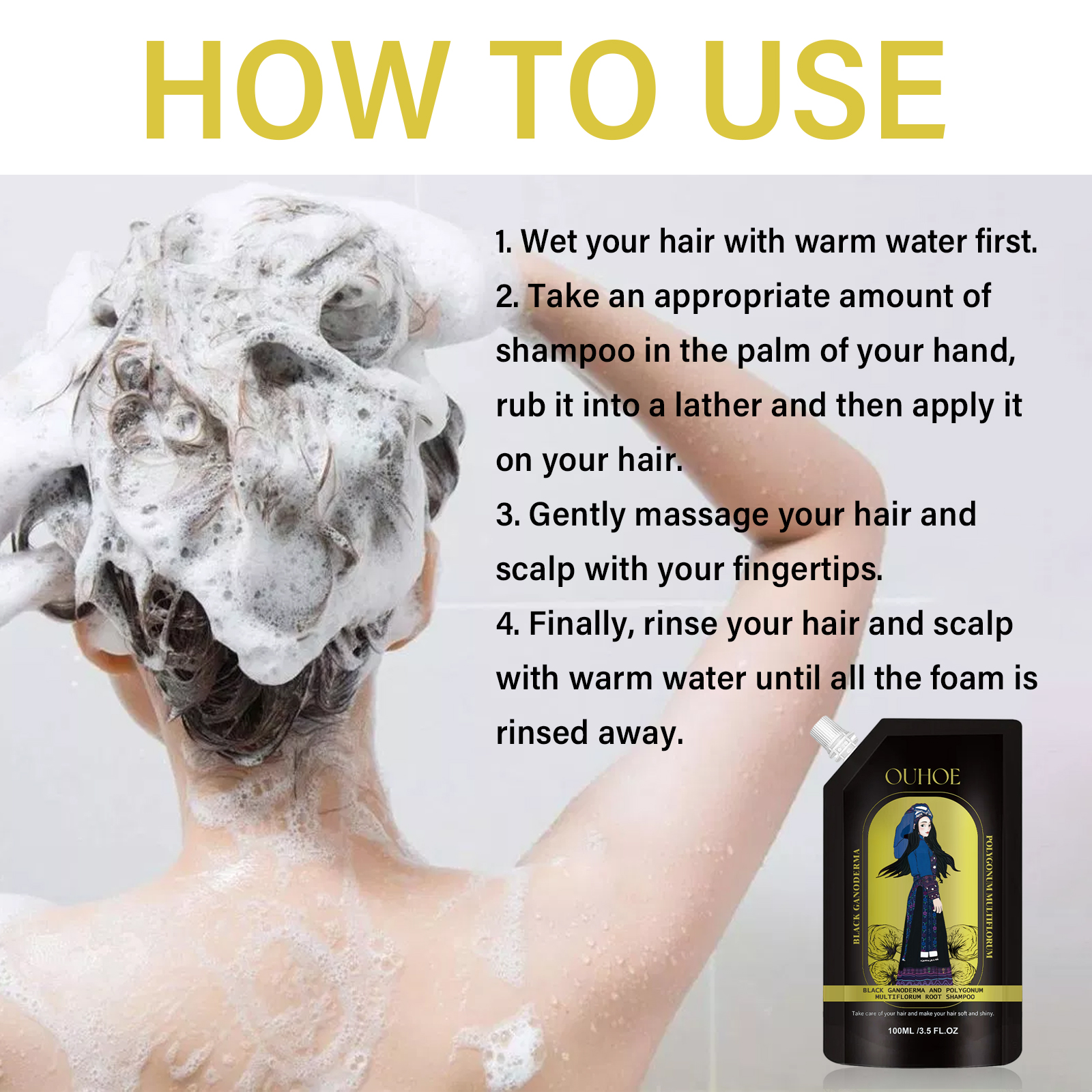 我们的生姜密发洗发水含有何首乌提取物、灵芝茎提取物、生姜提取物。它可以有效地保护头皮,为您提供足够的水分,以支持健康的头发。生姜提取物可以使头发更浓密,头皮更健康,头皮屑不再是一个问题。它的使用方法很简单:1. 先用温水打湿头发。2. 取适量洗发水于掌心,揉搓出泡沫,然后涂在头发上。3. 用指尖轻轻按摩头发和头皮。4. 最后,用温水冲洗头发和头皮,直到所有的泡沫都被冲洗掉。生姜密发洗发水有助于恢复头发的厚度、强度和柔软度。