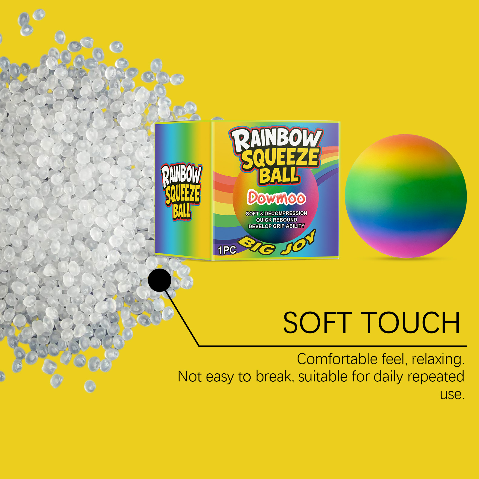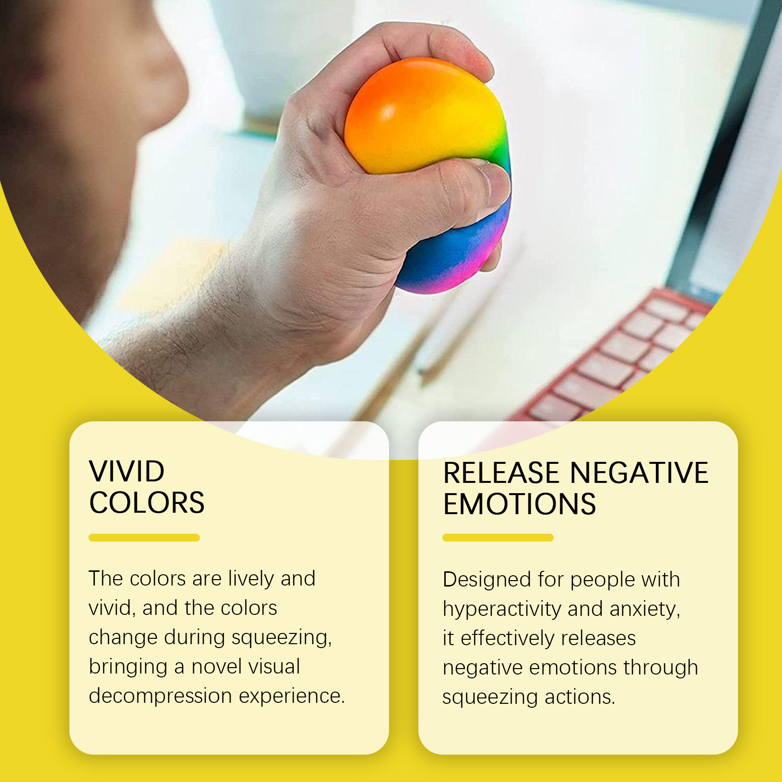 我们的彩虹解压球,由TPR精心调配而成。专为多动和焦虑的人设计,通过挤压动作有效释放负面情绪。使用方法极为便捷:你可以直接开始使用。并且它的颜色生动鲜艳,挤压过程中颜色变化,带来新颖的视觉减压体验。有助于在会议后消散愤怒,有趣的挤压操作可以迅速平复焦虑情绪。