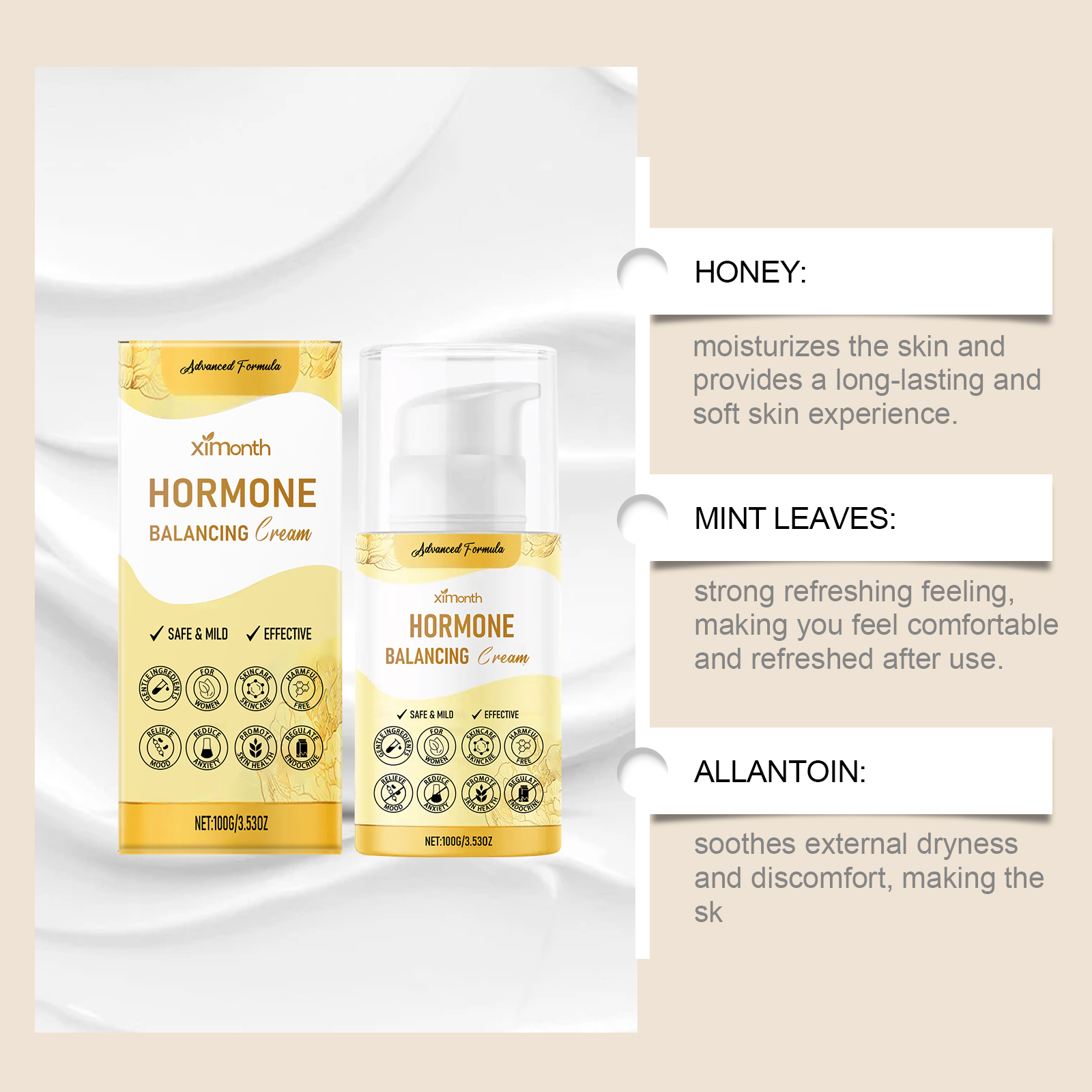我们的女性身体护理霜,由蜂蜜、薄荷叶精心调配而成。专为滋润肌肤设计。使用方法极为便捷:清洁干燥肌肤;取适量本品均匀涂抹于手臂内侧、胸上或腹部,轻轻按摩至吸收。并且可以缓解外部干燥和不适。
