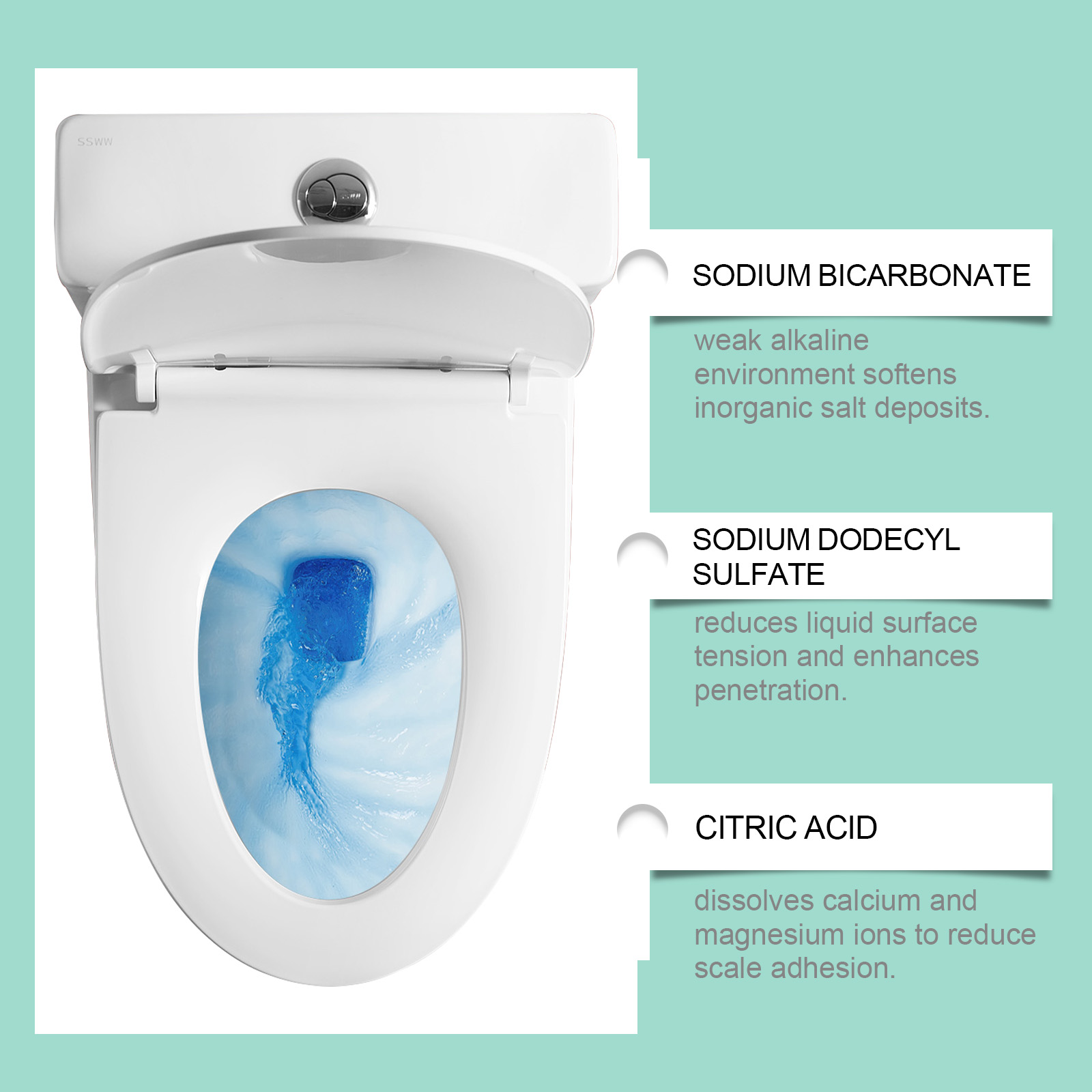 我们的马桶清洁剂,由碳酸氢钠、十二烷基硫酸钠精心调配而成。专为冲水的同时清洁马桶内部设计。使用方法极为便捷:该产品包含三个清洁块。每次只需放入一个。将清洁块放入专用容器中(建议使用原装容器)。用完一个后更换下一个。将装有清洁块的容器放入马桶水箱中,让其自然下沉。让它静置约10分钟直到清洁块完全溶解并开始工作。每次使用马桶后,正常冲水以完成自动清洁。每个清洁块可以使用大约2-3天,这会根据水量和使用频率路有不同。并且可以自动清洁马桶内部管道,减少污垢残留。