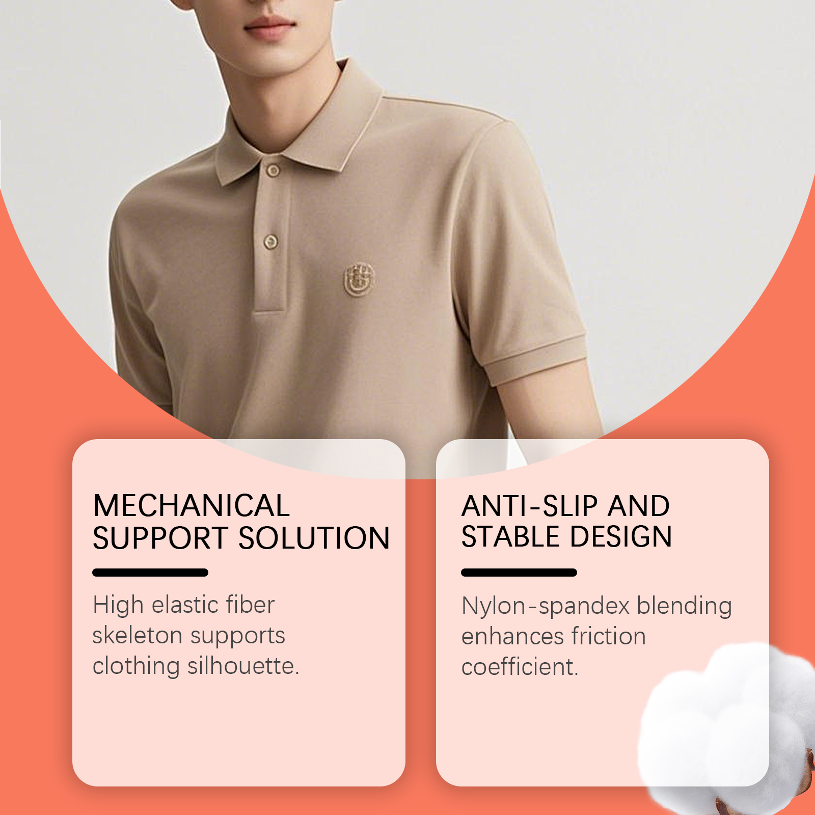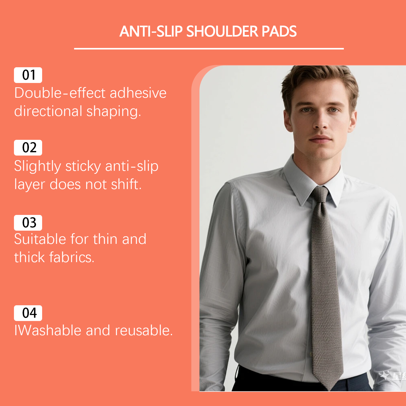 我们的防滑肩垫,由莱卡棉(82%锦纶、18%氨纶)精心调配而成。专为提供拉伸强度和耐磨性设计。使用方法极为便捷:水平放置垫子以抬高肩膀,适用于T恤和毛衣。垂直贴合以增加肩膀宽度,适合西装和夹克。并且它具有高弹性纤维骨架可以支撑服装轮廓,尼龙-氨纶混纺增强摩擦系数。