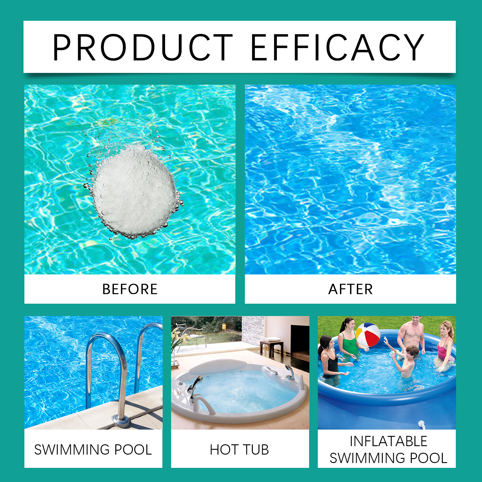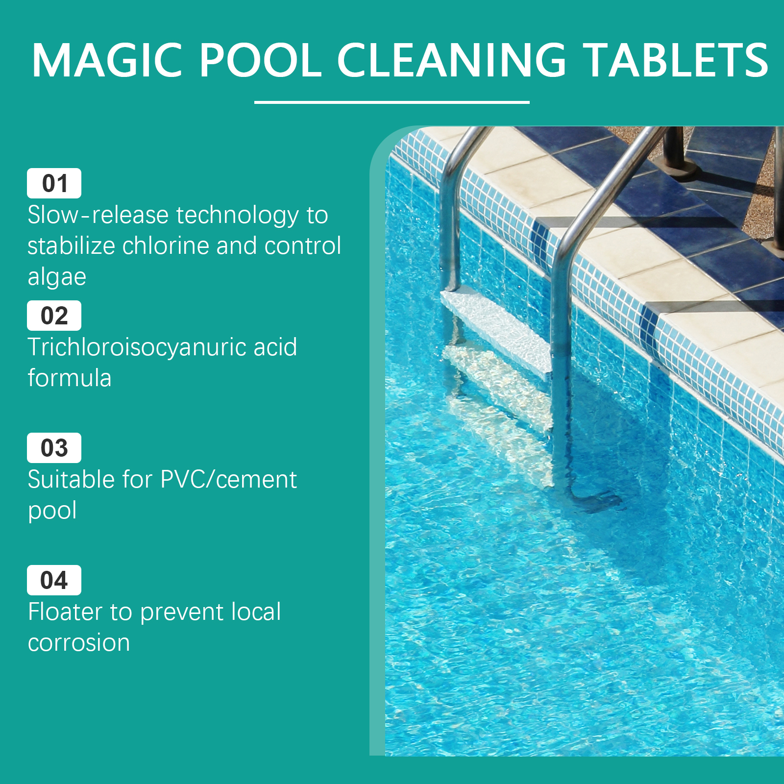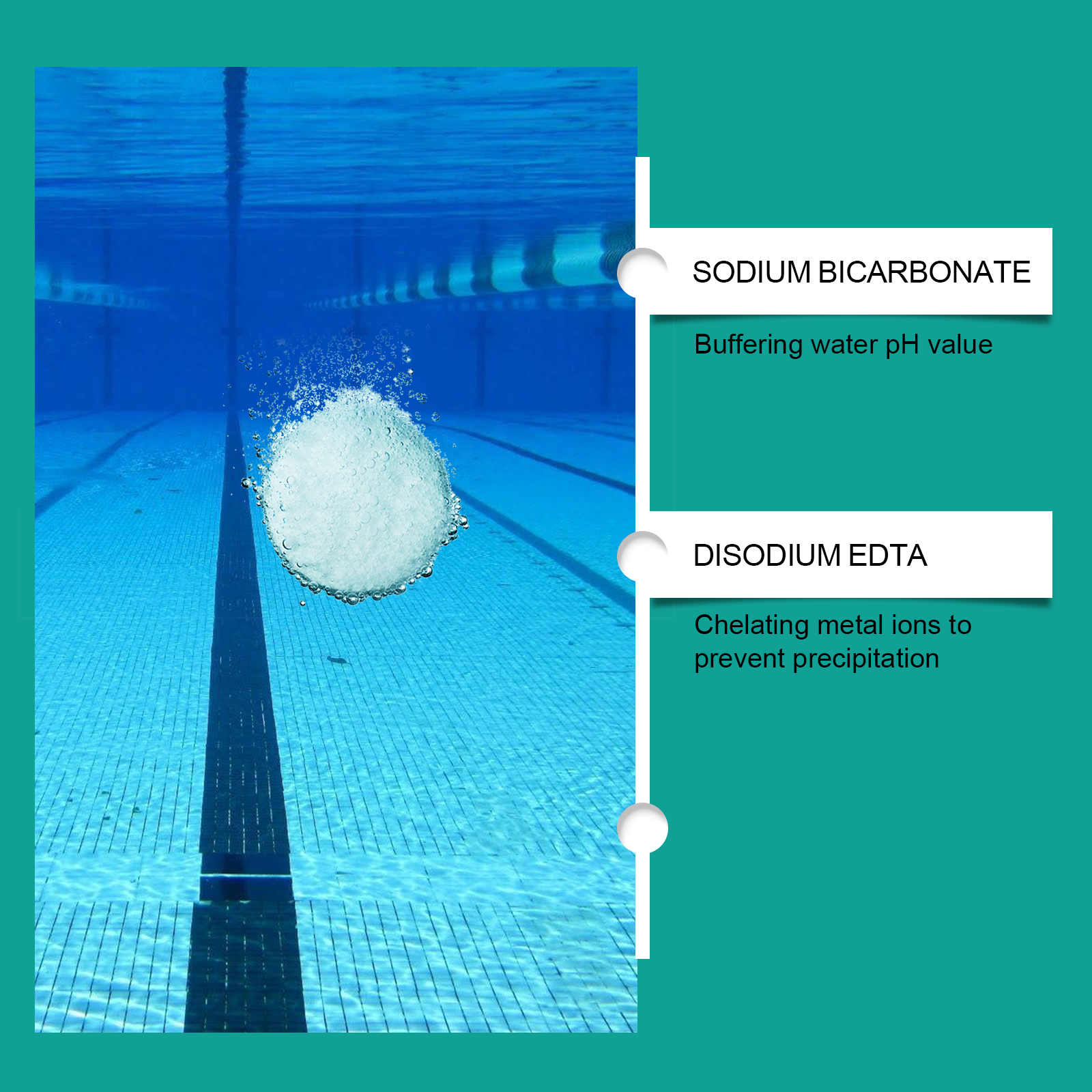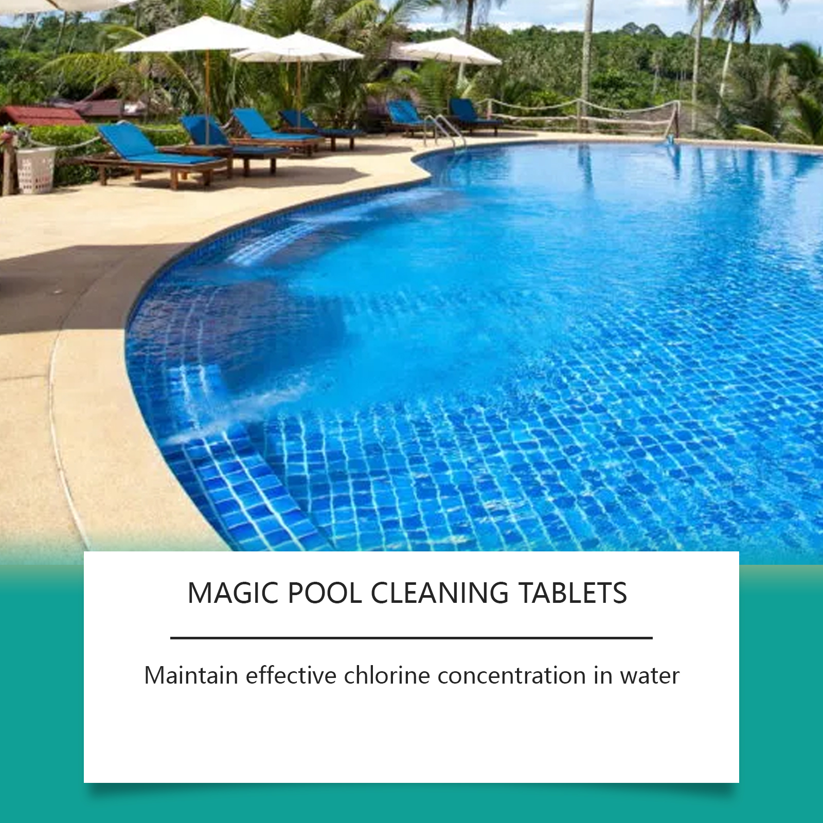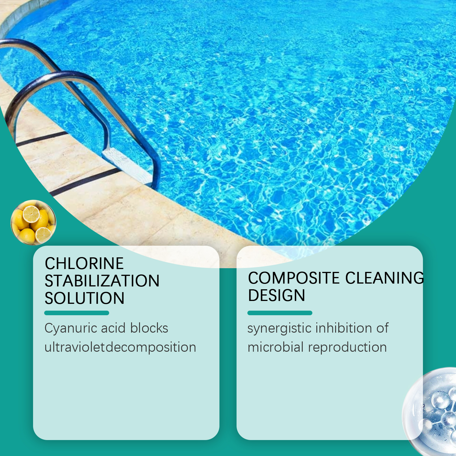 我们的泳池清洁片,由碳酸氢钠、十二烷基硫酸钠精心调配而成。专为缓冲水的pH值设计。使用方法极为便捷:每吨水(50立方米游泳池)添加1块药片,放置一个浮动的投药装置。每周测试游离氯值(0.3-1.0ppm),大雨后加半片药片。并且它具有氰尿酸,可以阻断紫外线分解,协同抑制微生物繁殖。