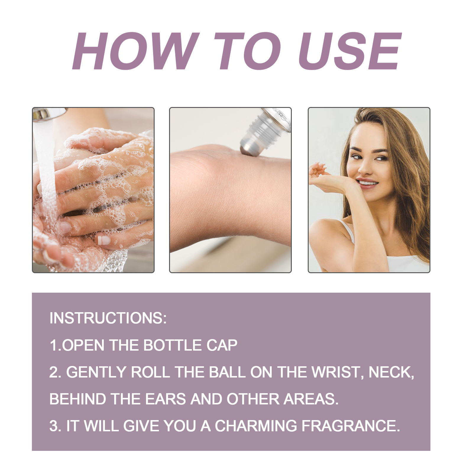 我们的信息素香水含有甘油、栀子果提取物。它可以持久的香味,深化魅力,增强吸引力,能迅速引发化学反应,适用于各种场合;芳香的气味可以引起愉悦和放松的感觉,增加你和你的伴侣之间的情感。它的使用方法很简单:1.打开瓶盖2. 轻轻地在手腕、脖子上滚动球,耳朵后面和其他地方。3. 它会给你一种迷人的香味。香味是甜美、性感、轻盈、优雅的,是日常或夜间活动的完美香水伴侣;适合在聚会、社交聚会或工作场所使用营造迷人氛围的环境。