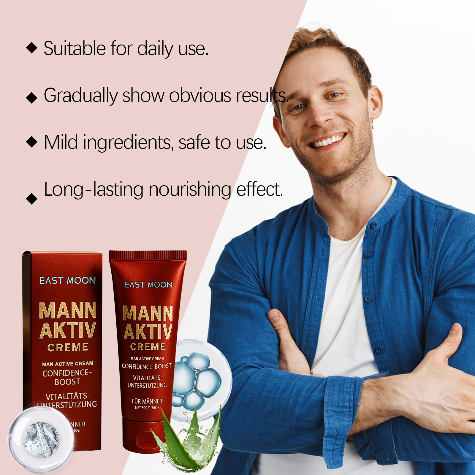 我们的男士活力霜,由库拉索芦荟提取物、生育酚精心调配而成。专为深层保湿并丰盈肌肤设计。使用方法极为便捷:清洁并擦干私处皮肤。取适量本产品,涂抹于私处皮肤,并轻轻按摩至吸收。并且可以保护皮肤免受氧化损伤。