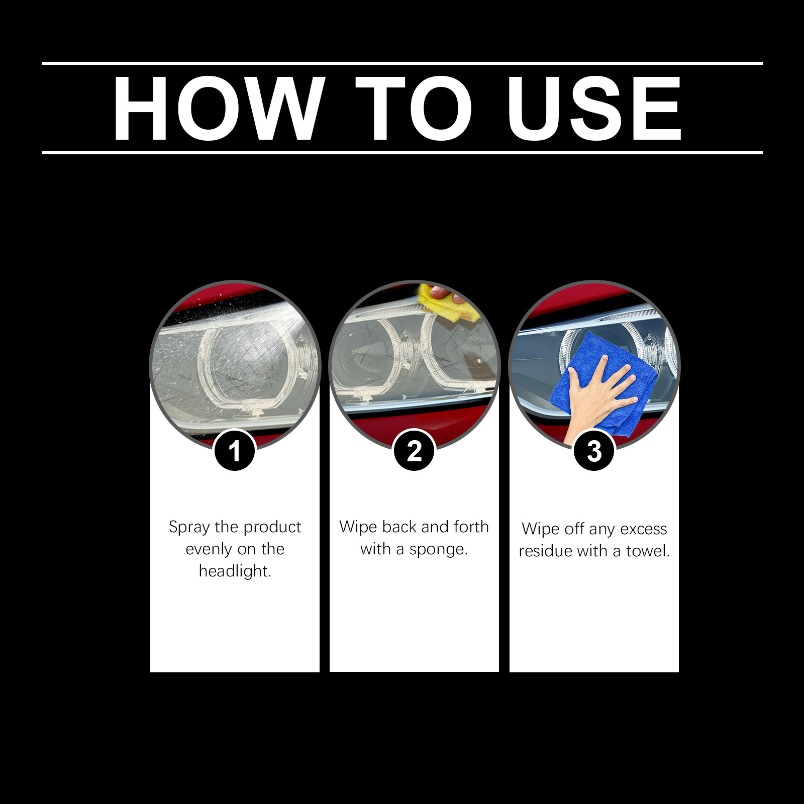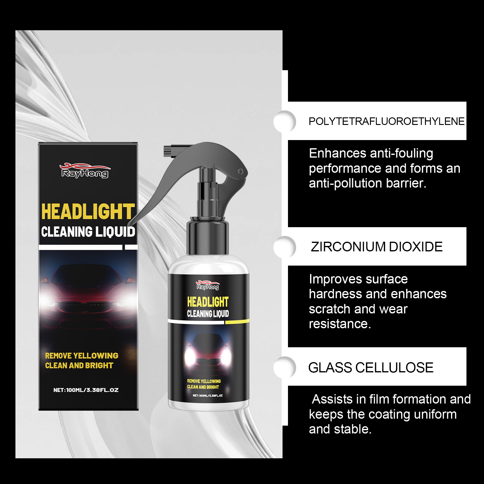 我们的汽车大灯清洁剂,由去离子水、聚四氟乙烯精心调配而成。专为帮助消除汽车大灯的污垢和发黄情况,恢复汽车头灯的外观设计。使用方法极为便捷:1.将本产品均匀喷洒在大灯上。2.用海绵来回擦拭。3.用毛巾擦掉多余的残留物。并且有助于使汽车大灯表面更加清晰明亮,减少雾霾天气和污渍的影响。