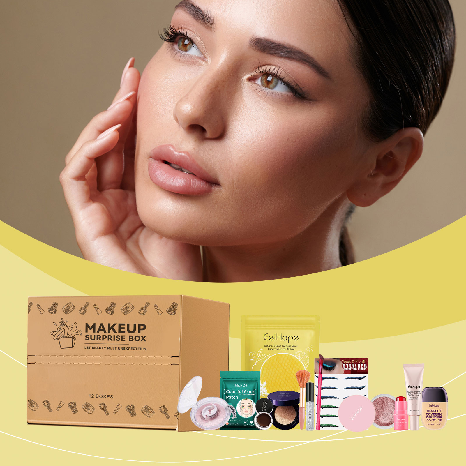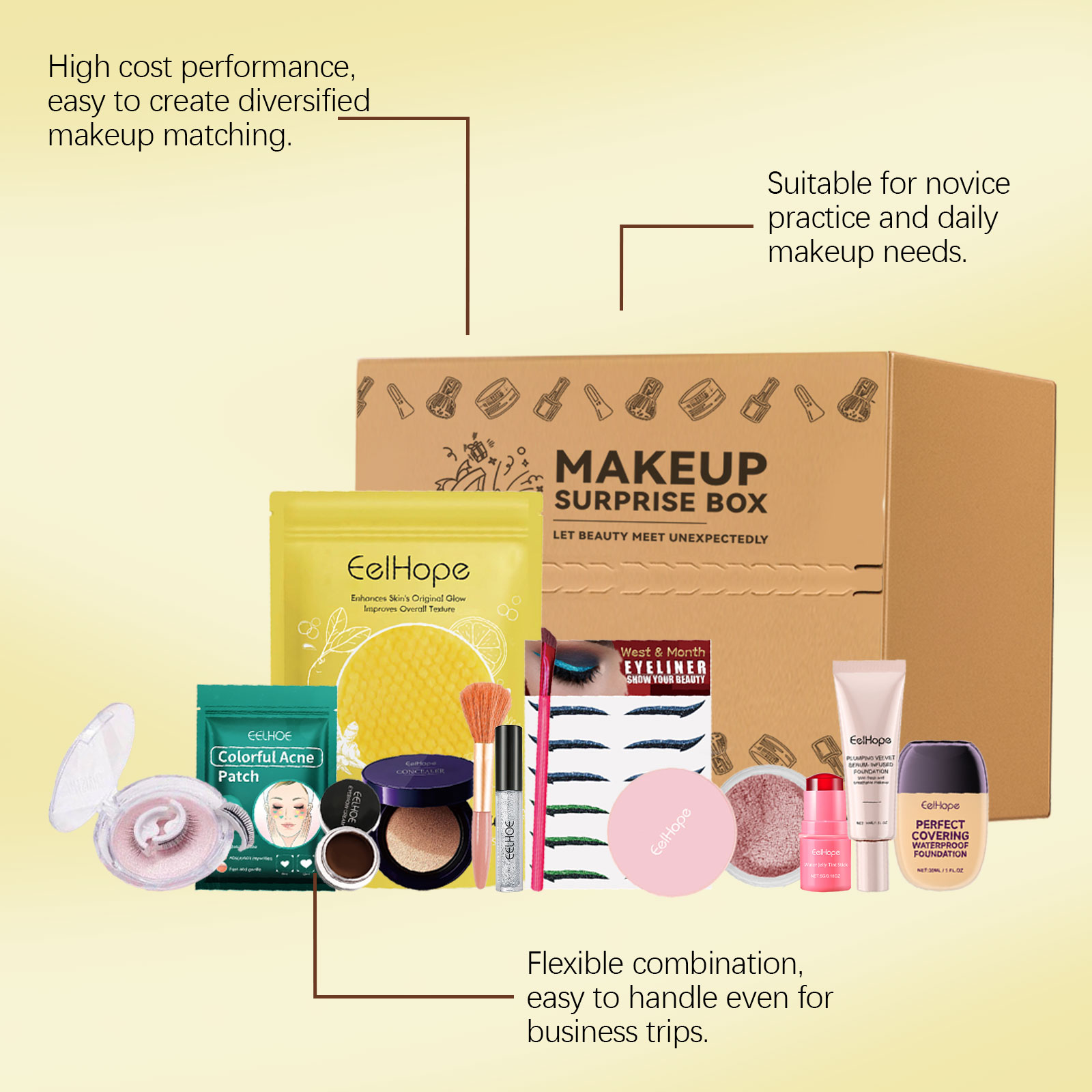 我们的彩妆惊喜盲盒,由染眉刷、爱心痘痘贴精心搭配而成。专为适合彩妆爱好者日常使用设计。使用方法极为便捷:详见盒内说明。并且内含多款彩妆单品,一盒满足全脸妆容所需,产品多样组合丰富,带来惊喜与实用兼得体验。