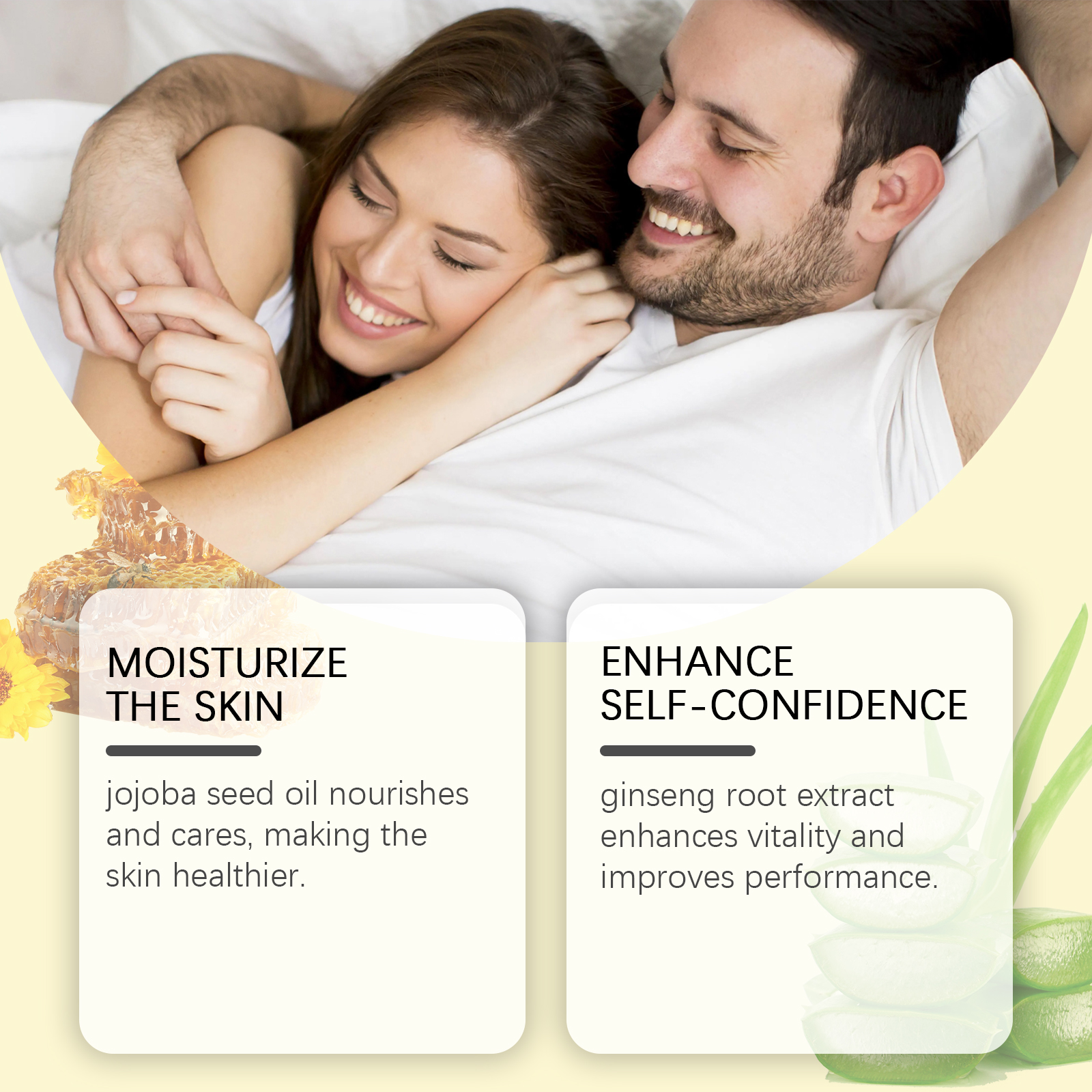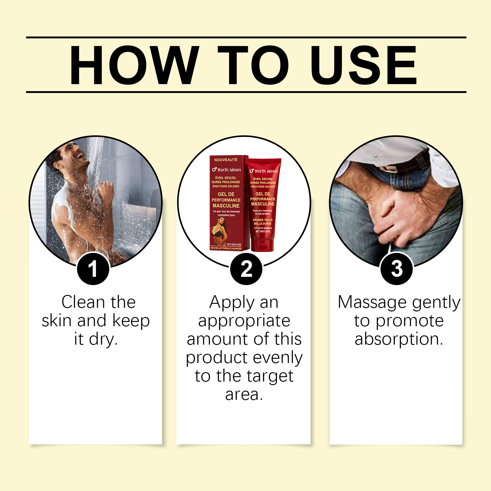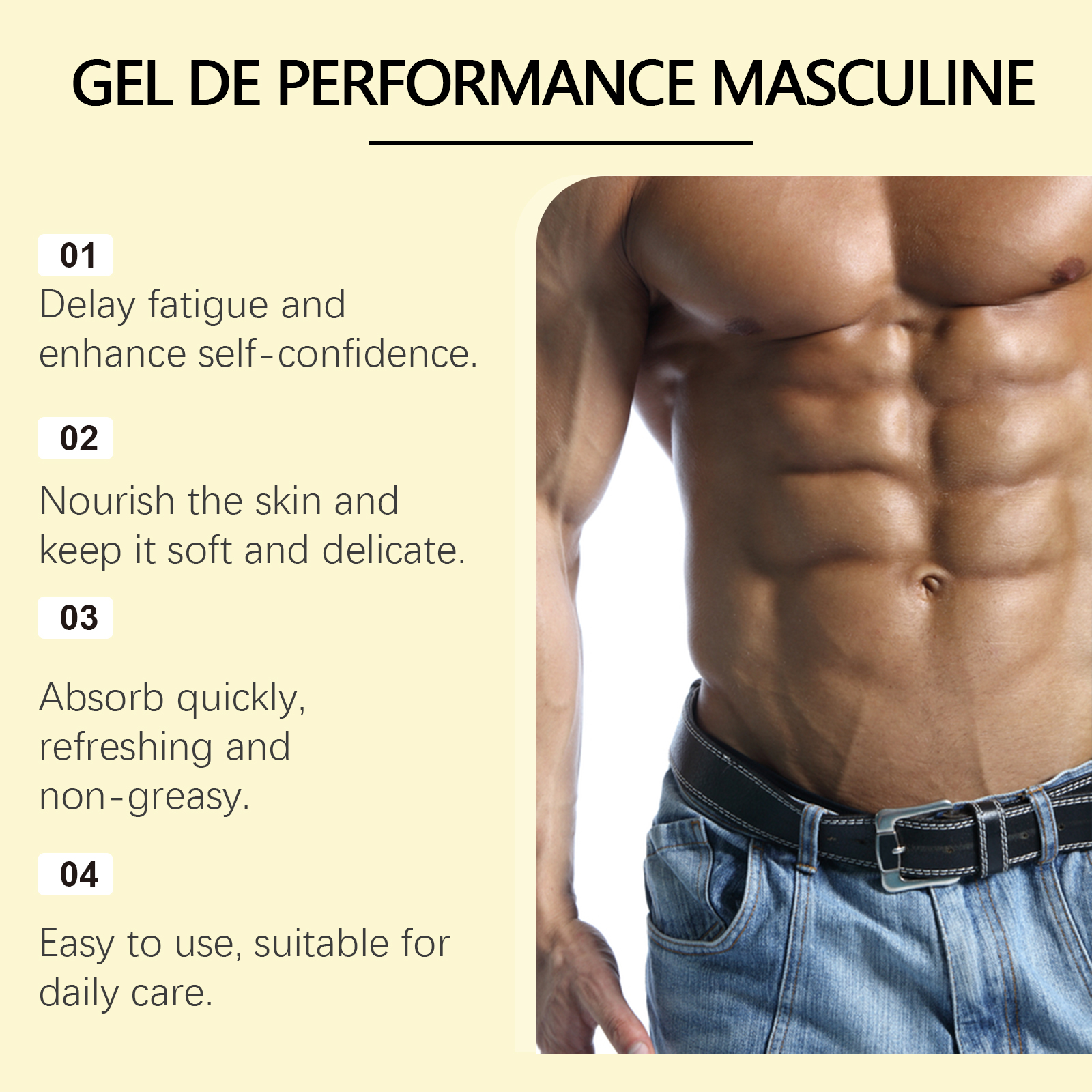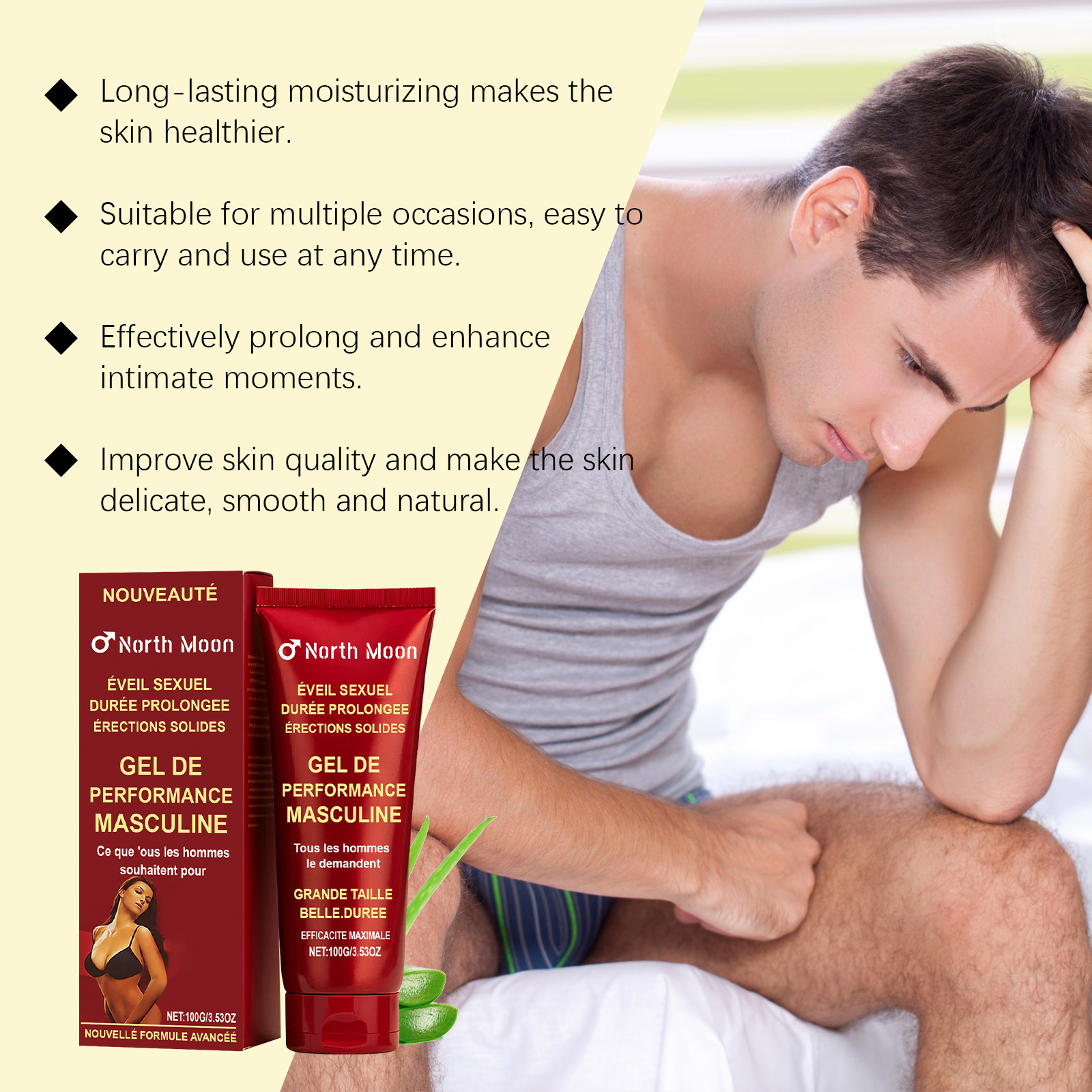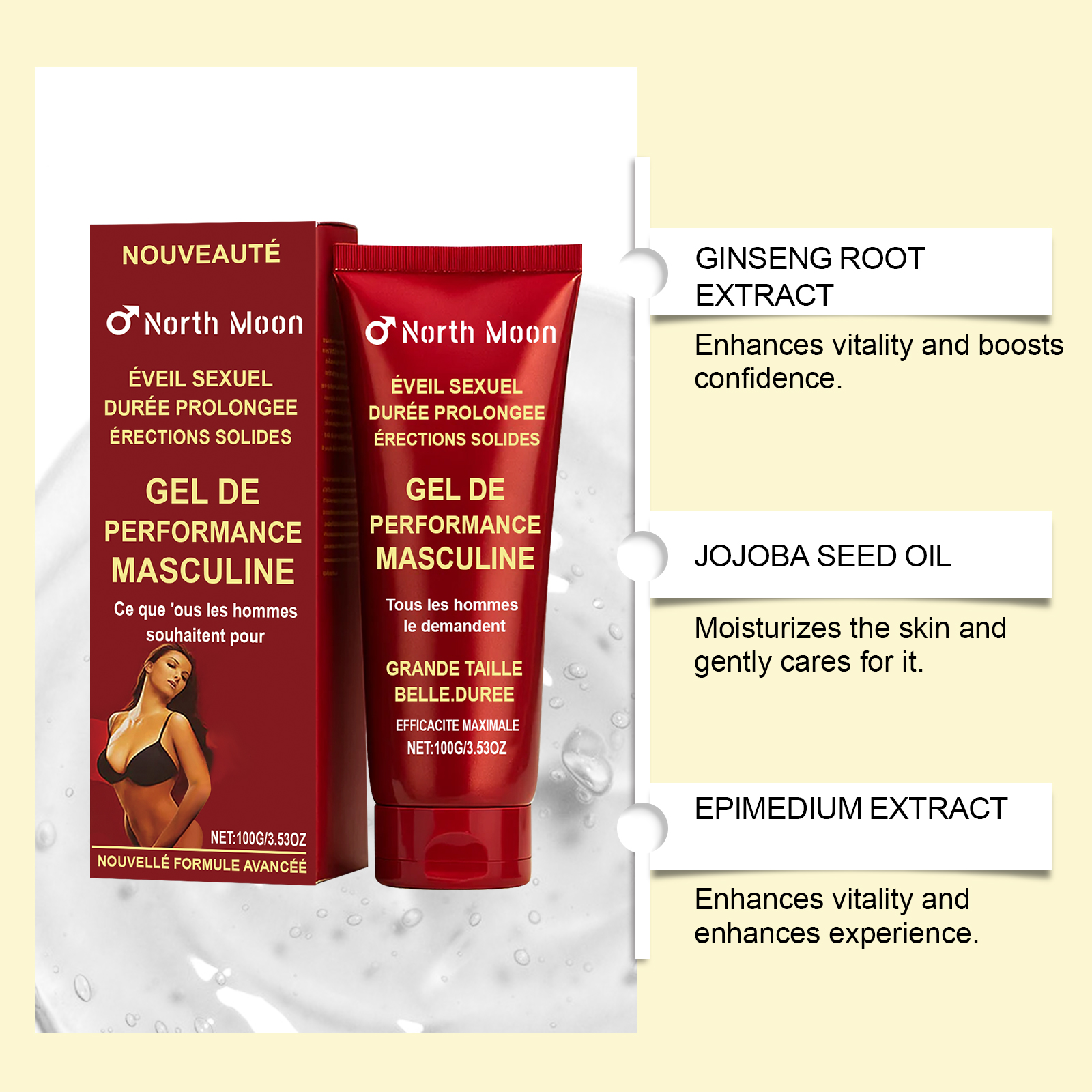 我们的男士肌肤护理凝胶,由霍霍巴籽油、淫羊藿提取物精心调配而成。专为有效延长亲密时刻并增强自信设计。使用方法极为便捷:清洁皮肤并保持干燥。将适量本产品均匀涂抹于目标区域。轻轻按摩以促进吸收。并且可以增强活力并提升体验。