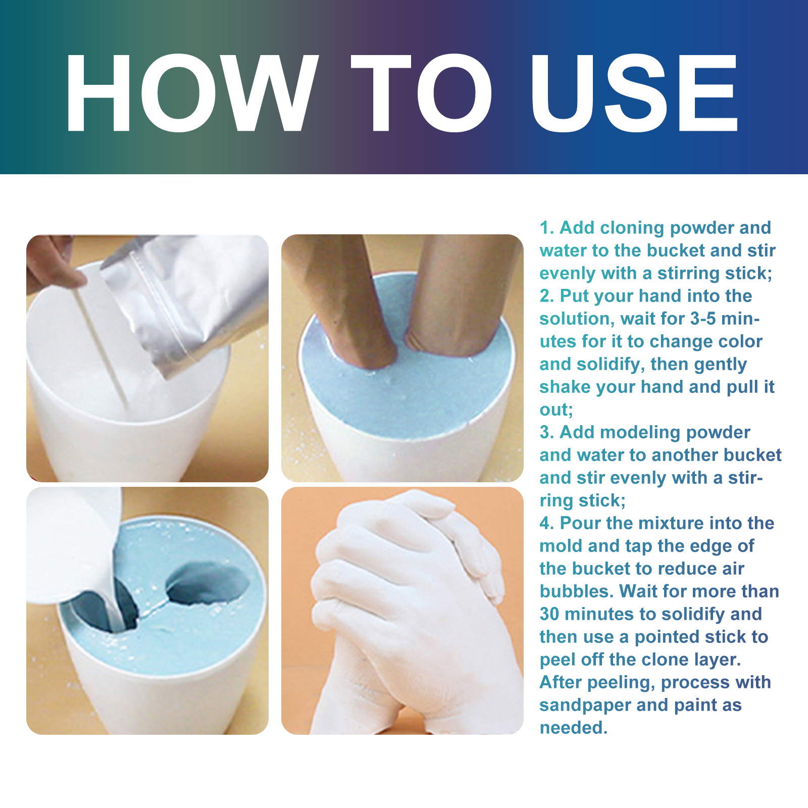 我们的情侣手模diy手模型藻酸钠。它可以记录成长历程,精细捕捉每一条细纹和指纹,让您打造的产品更加完美,是一种爱的见证。它的使用方法很简单:加入克隆粉和水在桶里用搅拌棒均匀搅拌,把手放入溶液中等待3-5分钟,让它变色并凝固,然后轻轻摇动你的手,把它拿出来。再将造型粉和水加入另一个桶中,用搅拌棒搅拌均匀。将混合物倒入模具中轻拍桶边缘以减少气泡等待30分钟以上固化后再剥离克隆层,剥掉后,根据需要用砂纸进行加工和上色即可。适合青少年,成年人,情侣和朋友一起创造无价的回忆,是送礼的绝佳选择。