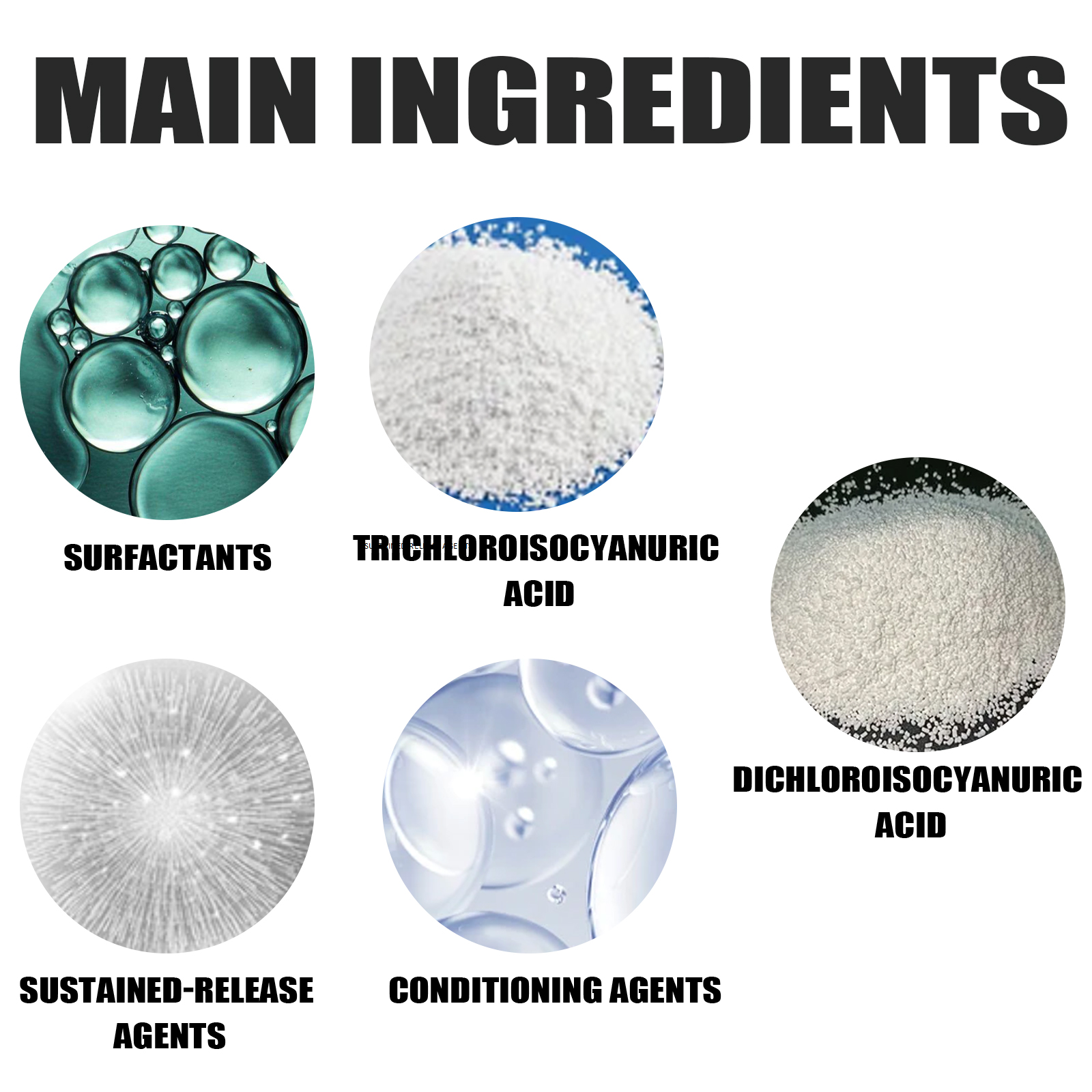 | 成分 | 三氯异氰尿酸、二氯异氰尿酸、调理剂 |