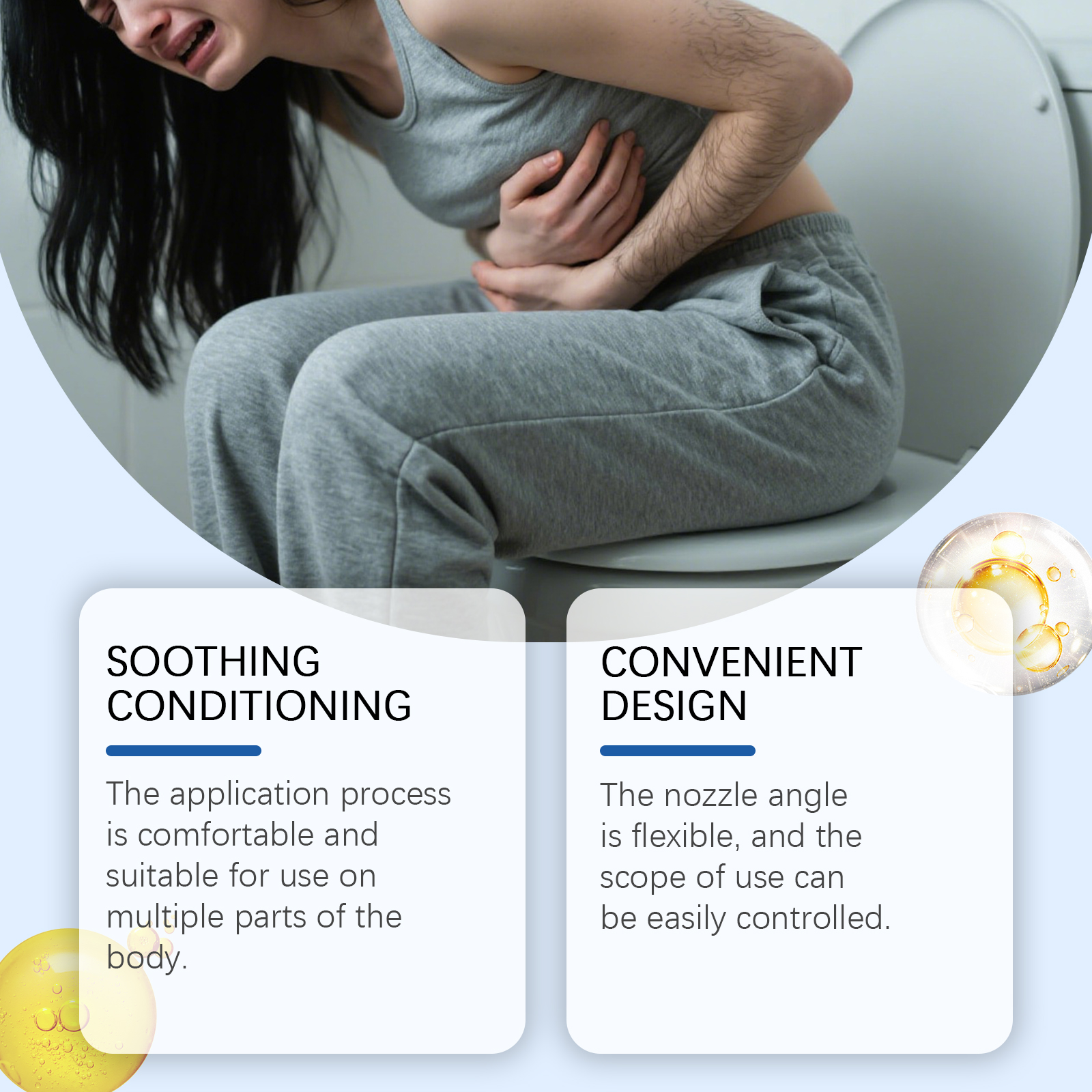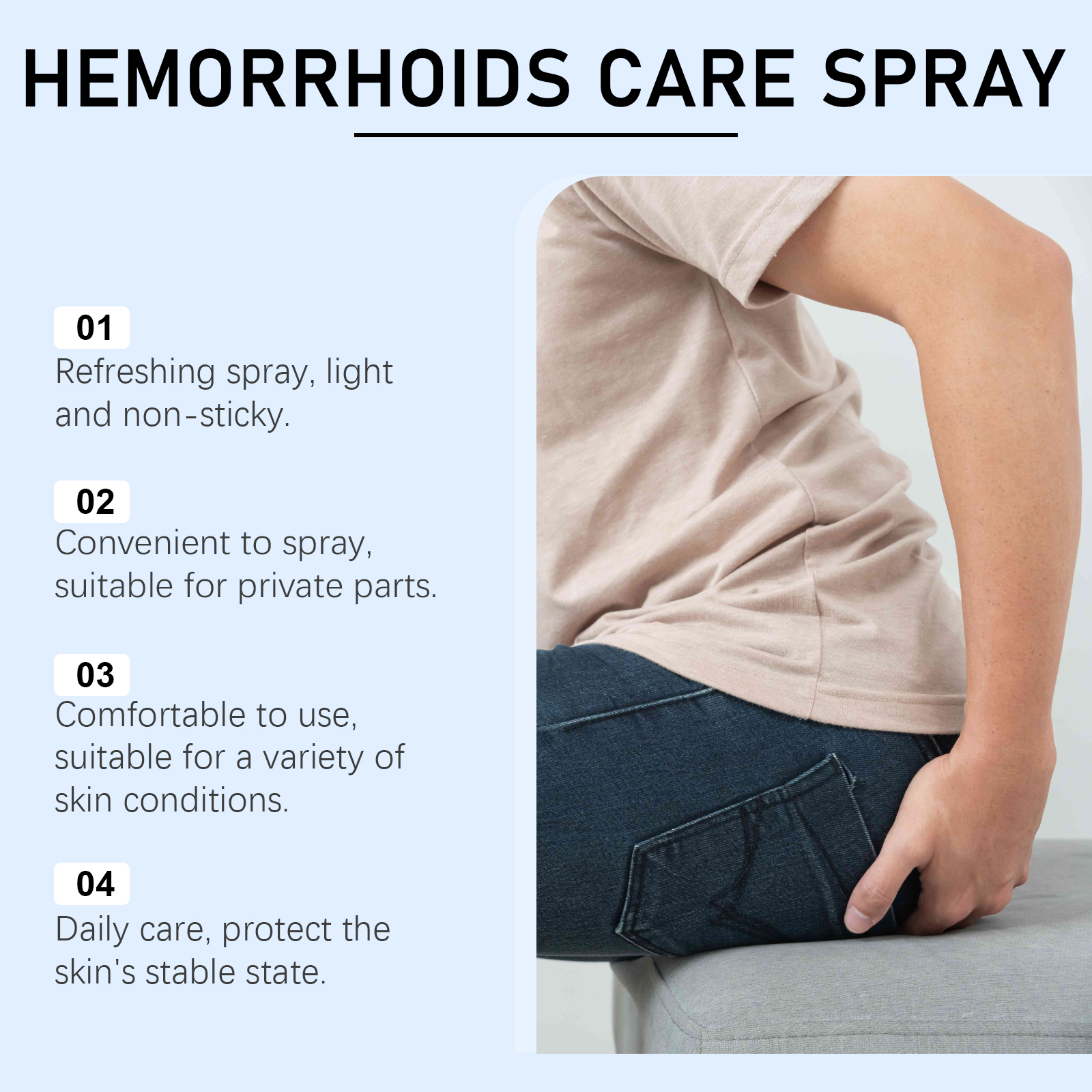 我们的肛周护理喷雾,由薄荷脑、芦荟叶、茶树油精心调配而成。专为助力缓解肛周不适,帮助减轻该区域的不适感受设计。使用方法极为便捷:清洁私处肌肤并保持干燥,喷洒适量本品在肛周肌肤上,待其吸收即可。并且它可以为肛周区域提供舒适支持,协助促进局部舒适。
