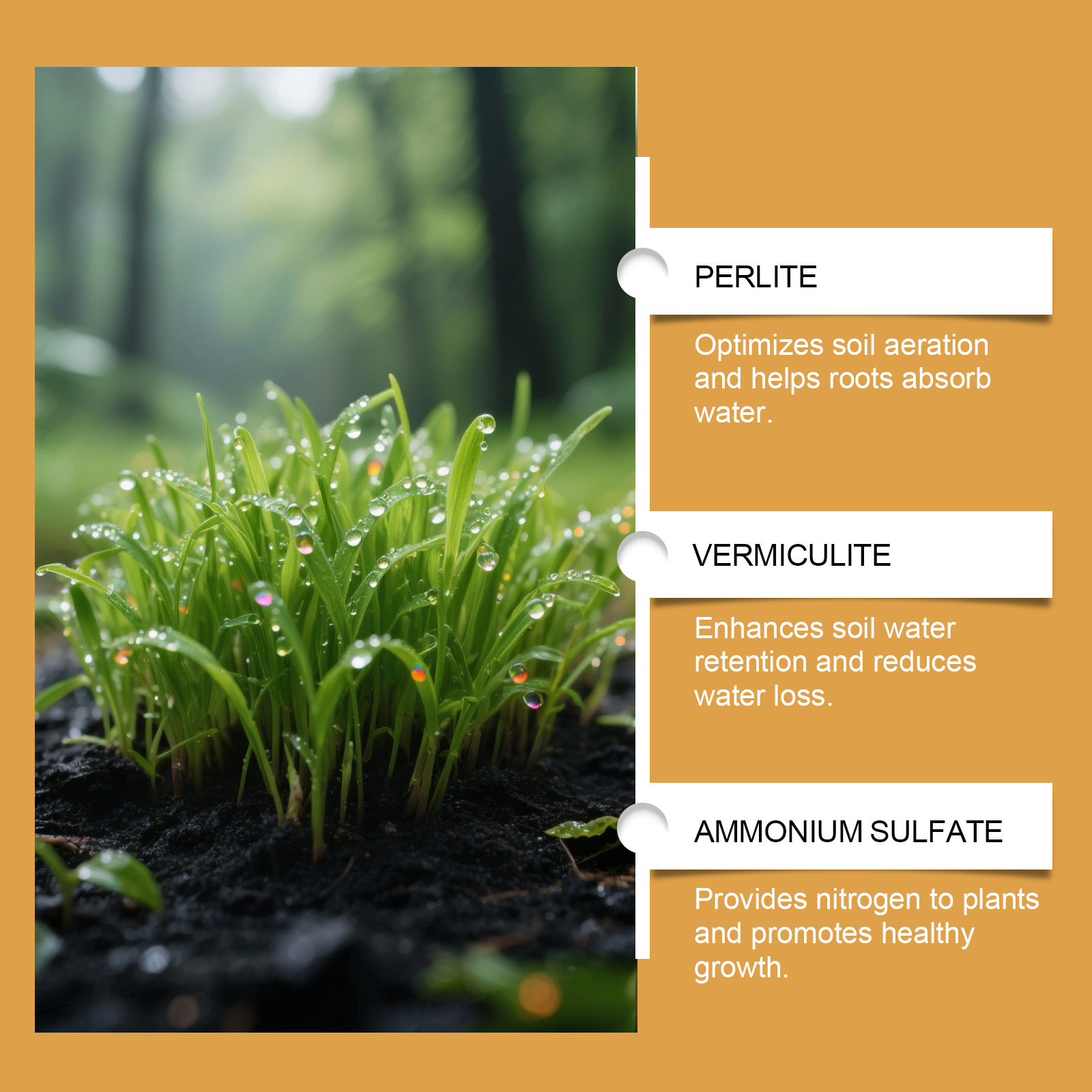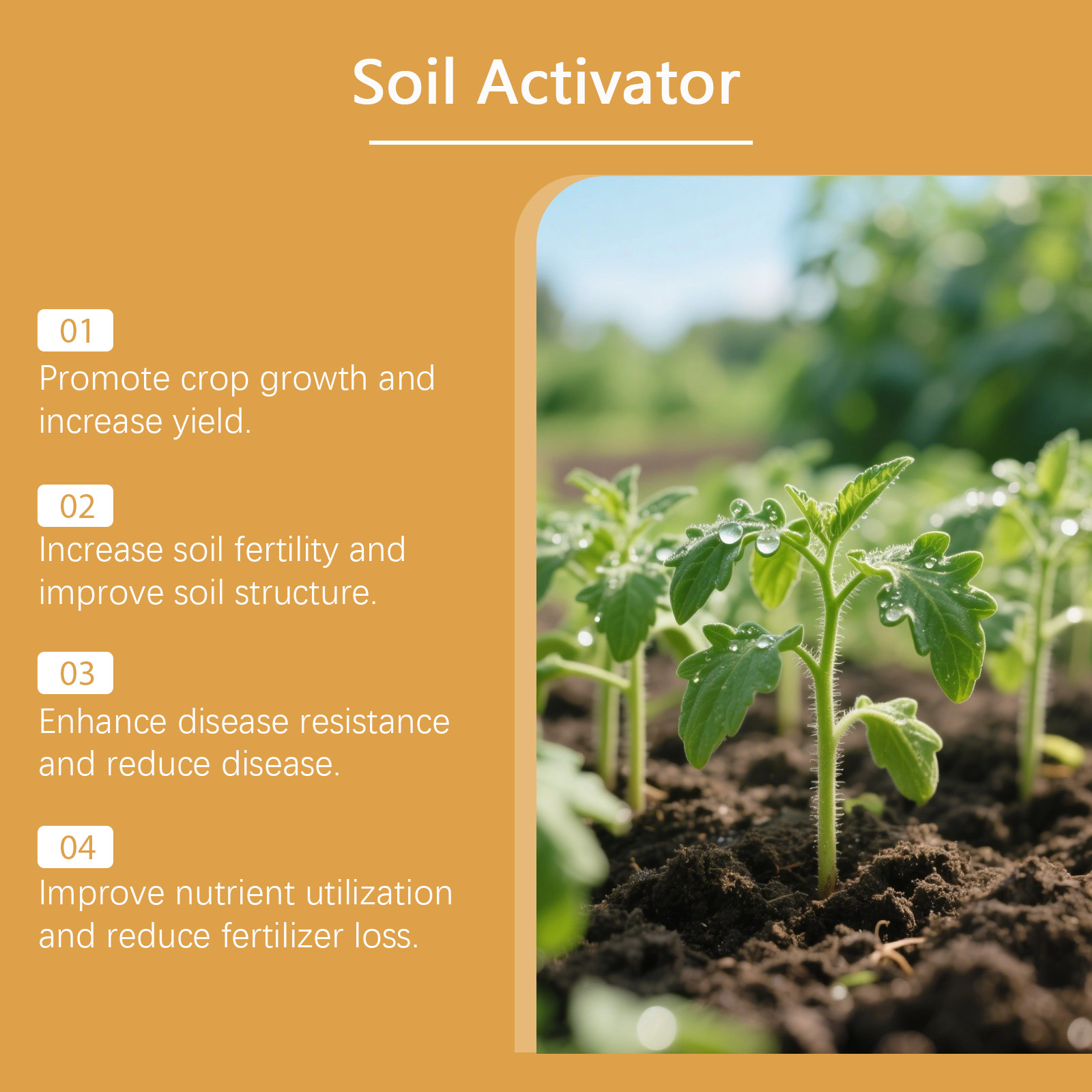 我们的植物土壤活化剂,由黄腐酸钾、腐叶土、泥炭土精心调配而成。专为激活土壤养分,促进根系生长,提高作物生长速度设计。使用方法极为便捷:1. 促进作物生长,提高产量。2. 提升土壤肥力,改善结构。3. 增强抗病能力,减少病害。4. 提高养分利用,减少肥料流失。并且它可以改善土壤酸碱度,优化根部环境,增强作物抗逆性和产量, 提升土壤保水保肥能力,促进营养吸收,提高根系吸收效率。