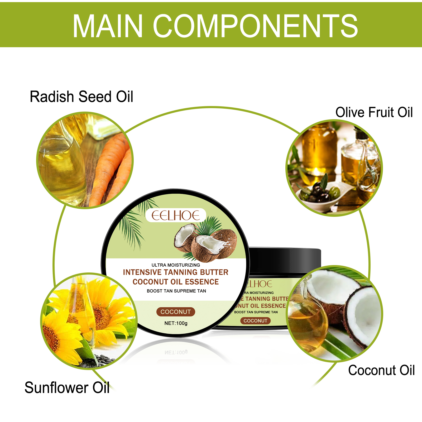 我们的椰子助黑霜含有椰子油、萝卜籽油、橄榄果油。它可以加速美黑,提供深层、丰富、容光焕发的晒黑肌肤,同时深度呵护肌肤,使您获得均匀的晒黑效果。它的使用方法很简单:清洁并擦干身体皮肤,取适量产品涂在需要变黑的皮肤上,轻轻按摩后,可以在阳光下日光浴5-10分钟,效果更佳。打造自然的夏日古铜色,滋润抗皱,使您获得均匀的晒黑效果。