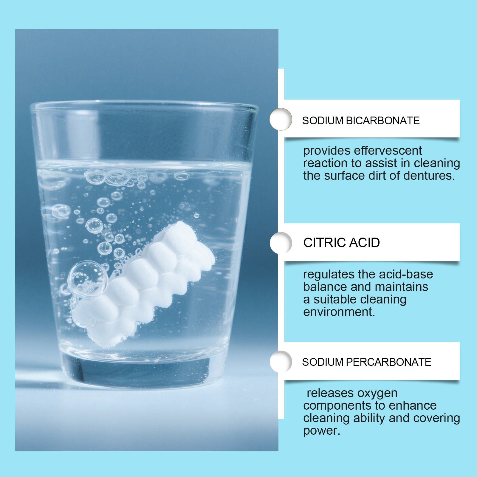 我们的假牙清洁泡腾片,由柠檬酸、过碳酸钠精心调配而成。专为调节酸碱平衡设计。使用方法极为便捷:1.将一块本产品加入适量的水中,等待其溶解。2.将假牙保持器放入溶液中,等待15分钟,取出并用清水冲洗。并且可以释放氧气成分,增强清洁能力与覆盖力。
