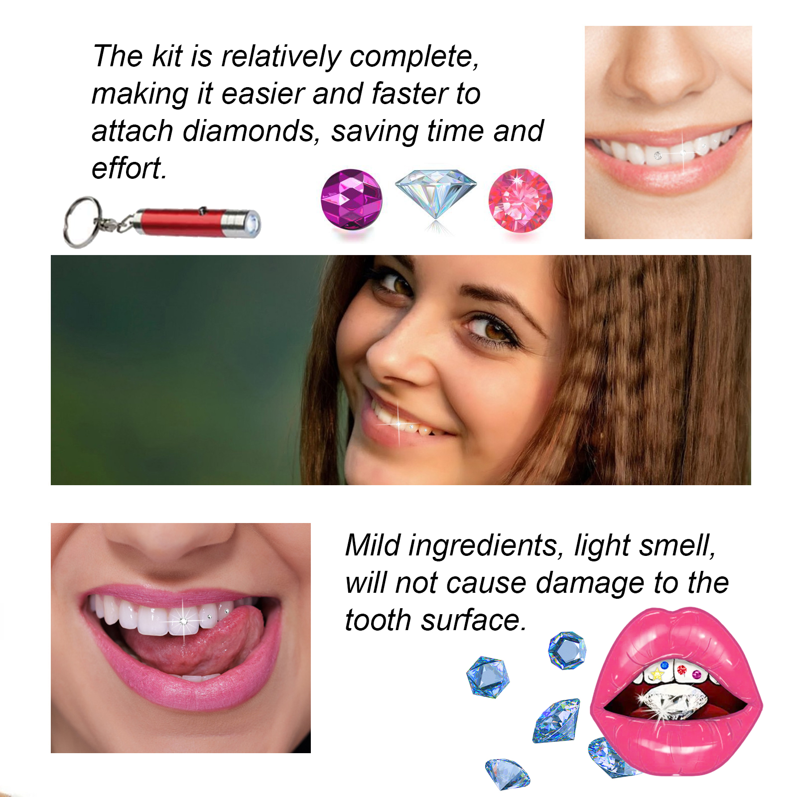 我们的DIY 牙齿宝石套件含有UV胶。它可以使你绽放炫彩笑容,保证附着在牙面上的金刚石不易脱落,具有一定的安全性。它的使用方法很简单:先清洁牙齿,然后用棉拭子吸干牙齿表面的水分,在牙齿表面需要贴钻石的地方刷胶,用钢笔粘贴钻石凸起的表面,贴在牙齿表面,用紫外线灯照射60秒,等它干了即可。使用后笑容更加具有魅力,容光焕发。