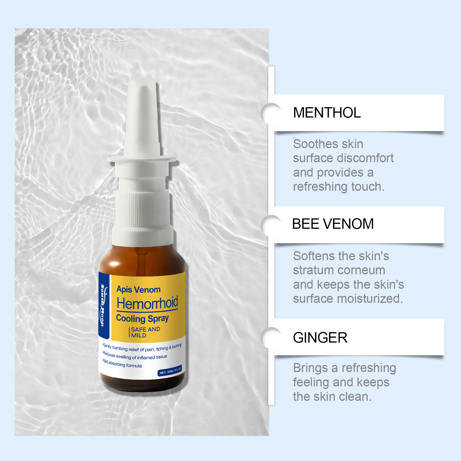 我们的蜂毒肛周喷雾,由薄荷脑、蜂毒、生姜精心调配而成。专为软化皮肤的角质层设计。使用方法极为便捷:清洁私处皮肤并保持干燥,将适量本产品喷洒在肛门周围的皮肤上,并等待其被吸收。并且应用过程舒适,适合在身体的多个部位使用。