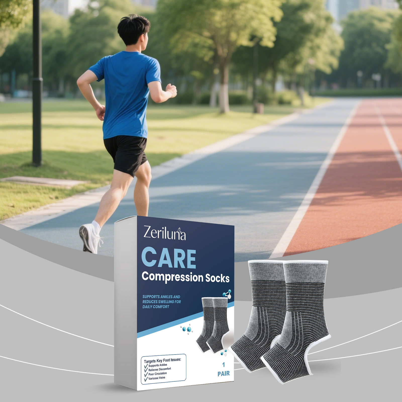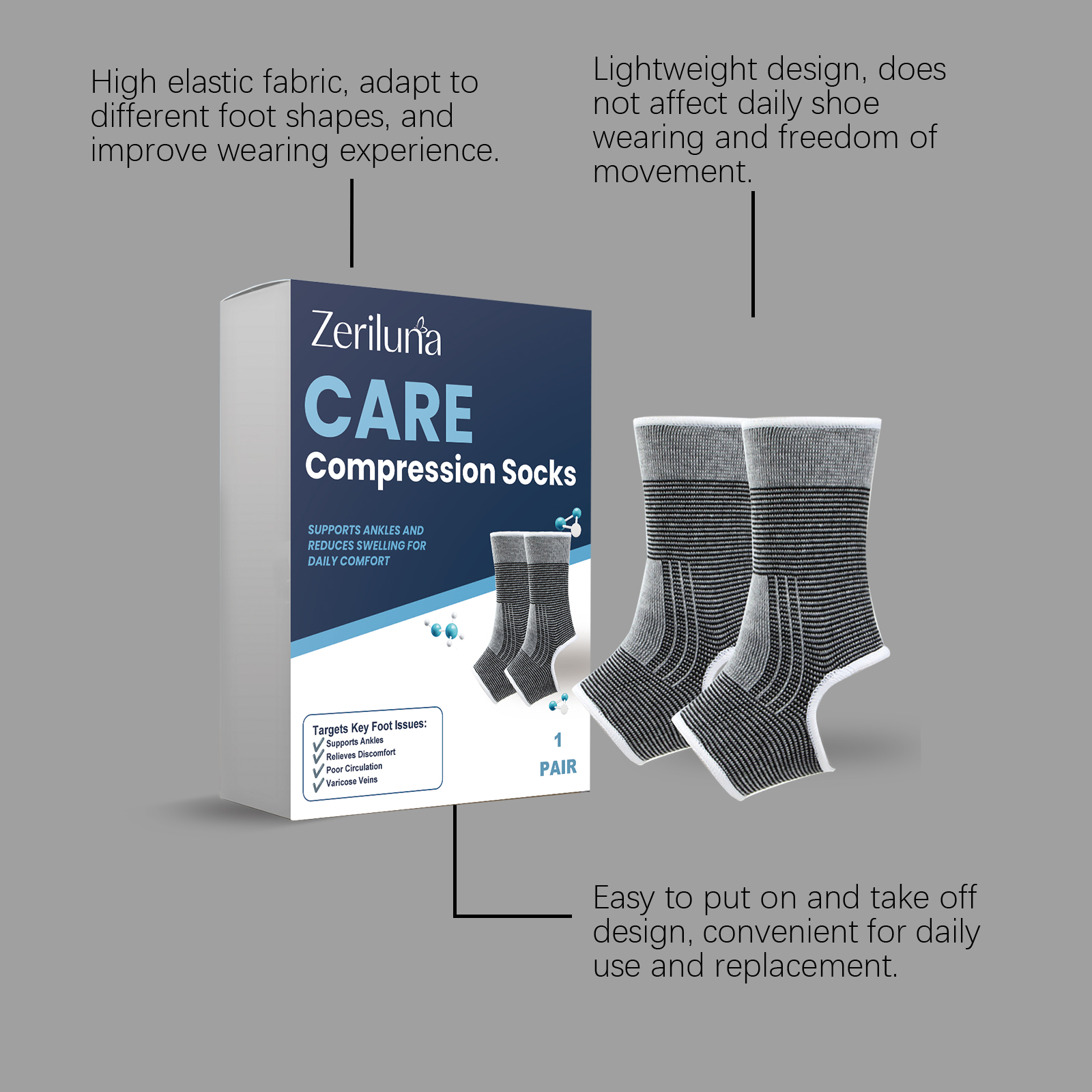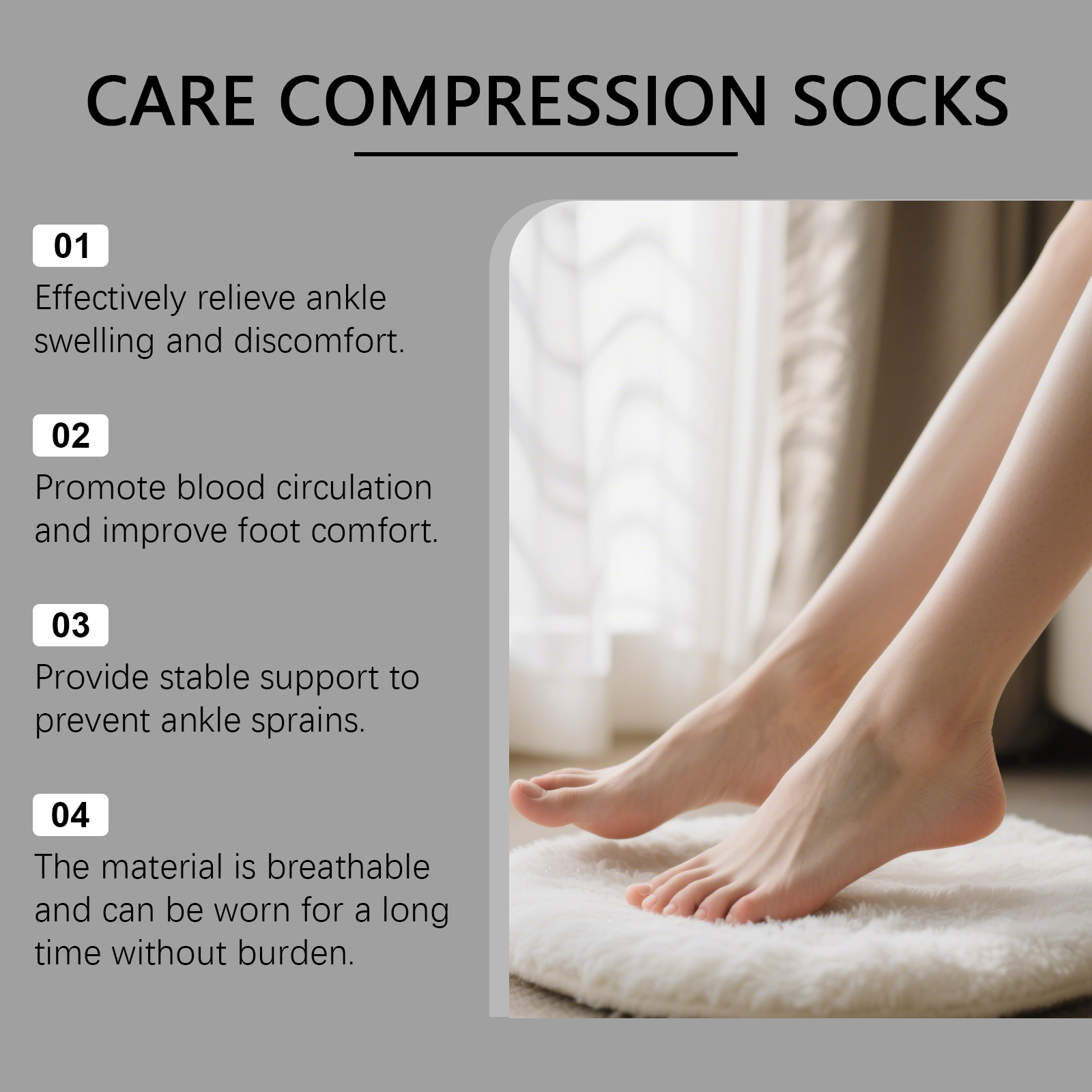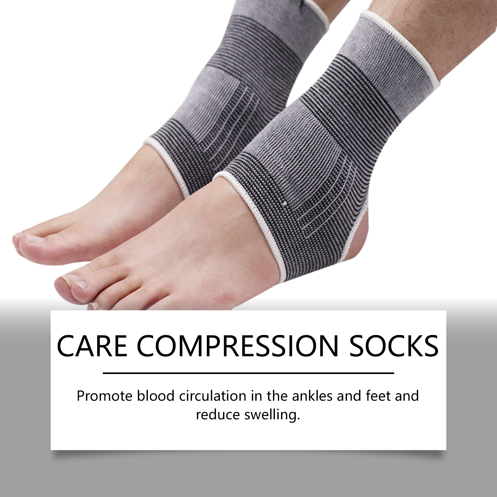 我们的足部护理袜,由100%聚酯纤维精心调配而成。专为促进脚踝和脚部血液循环,减少肿胀,有效缓解脚部水肿和静脉曲张症状设计。使用方法极为便捷:只需将袜子穿在脚上,左右脚通用。并且它可以提供踝部支撑,防止扭伤保护关节,增强足部舒适度,改善整体健康状态。