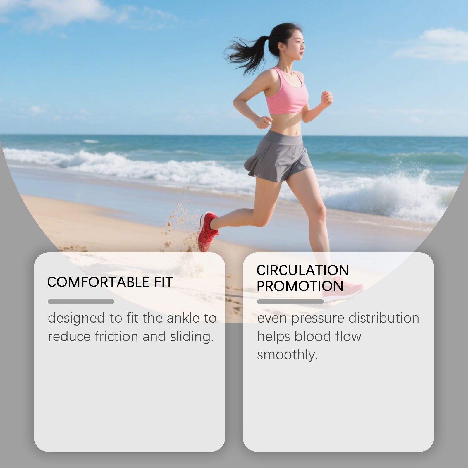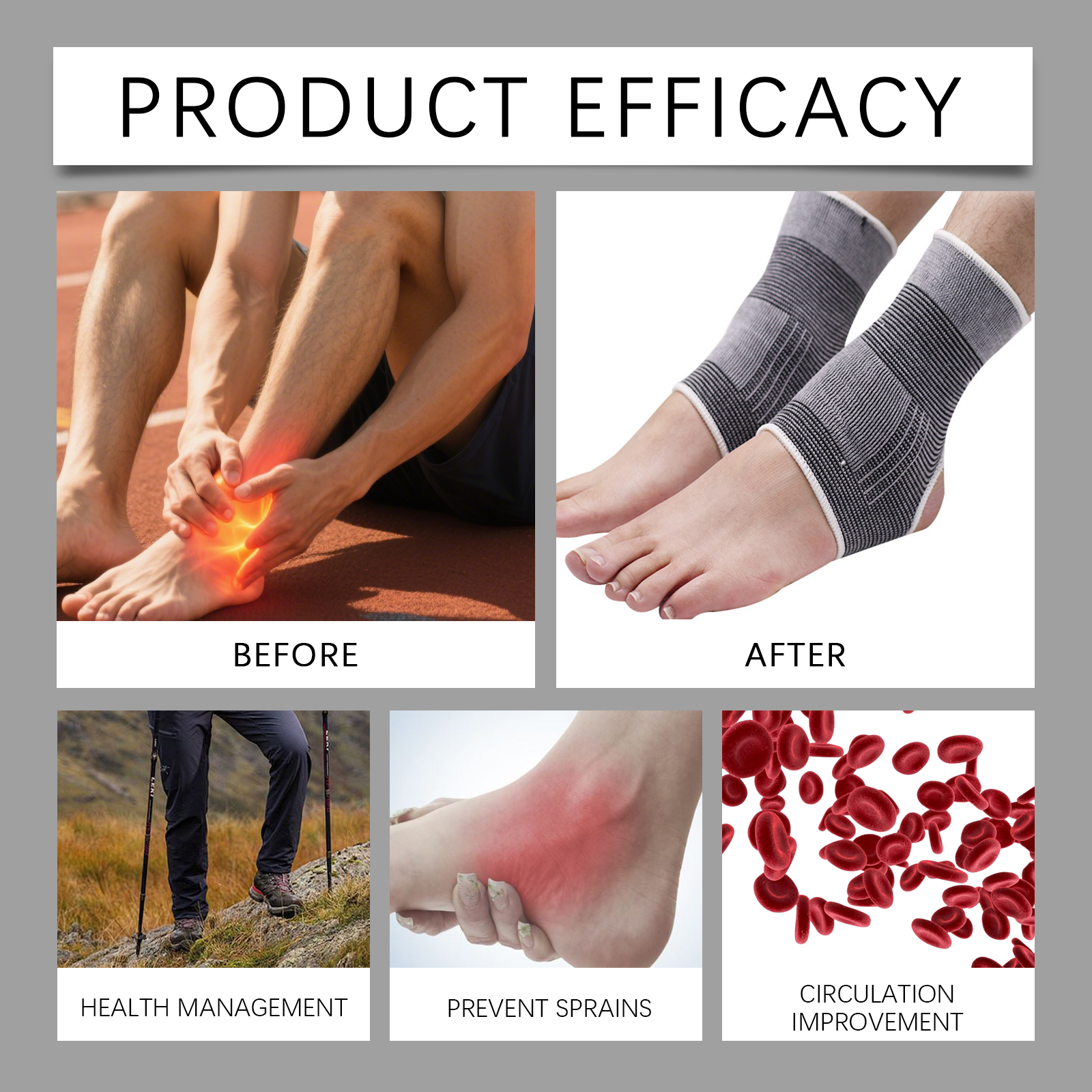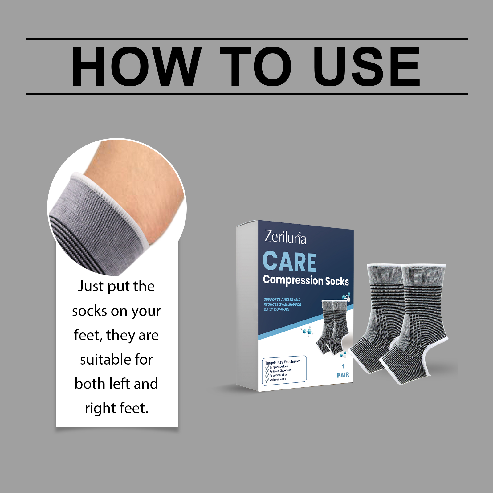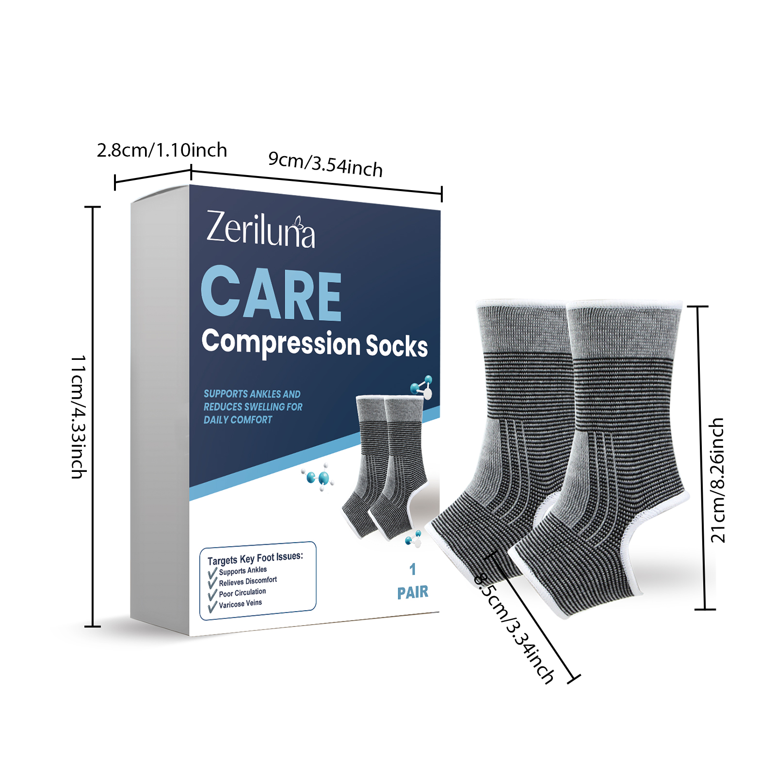 我们的足部护理袜,由100%聚酯纤维精心调配而成。专为促进脚踝和脚部血液循环,减少肿胀,有效缓解脚部水肿和静脉曲张症状设计。使用方法极为便捷:只需将袜子穿在脚上,左右脚通用。并且它可以提供踝部支撑,防止扭伤保护关节,增强足部舒适度,改善整体健康状态。