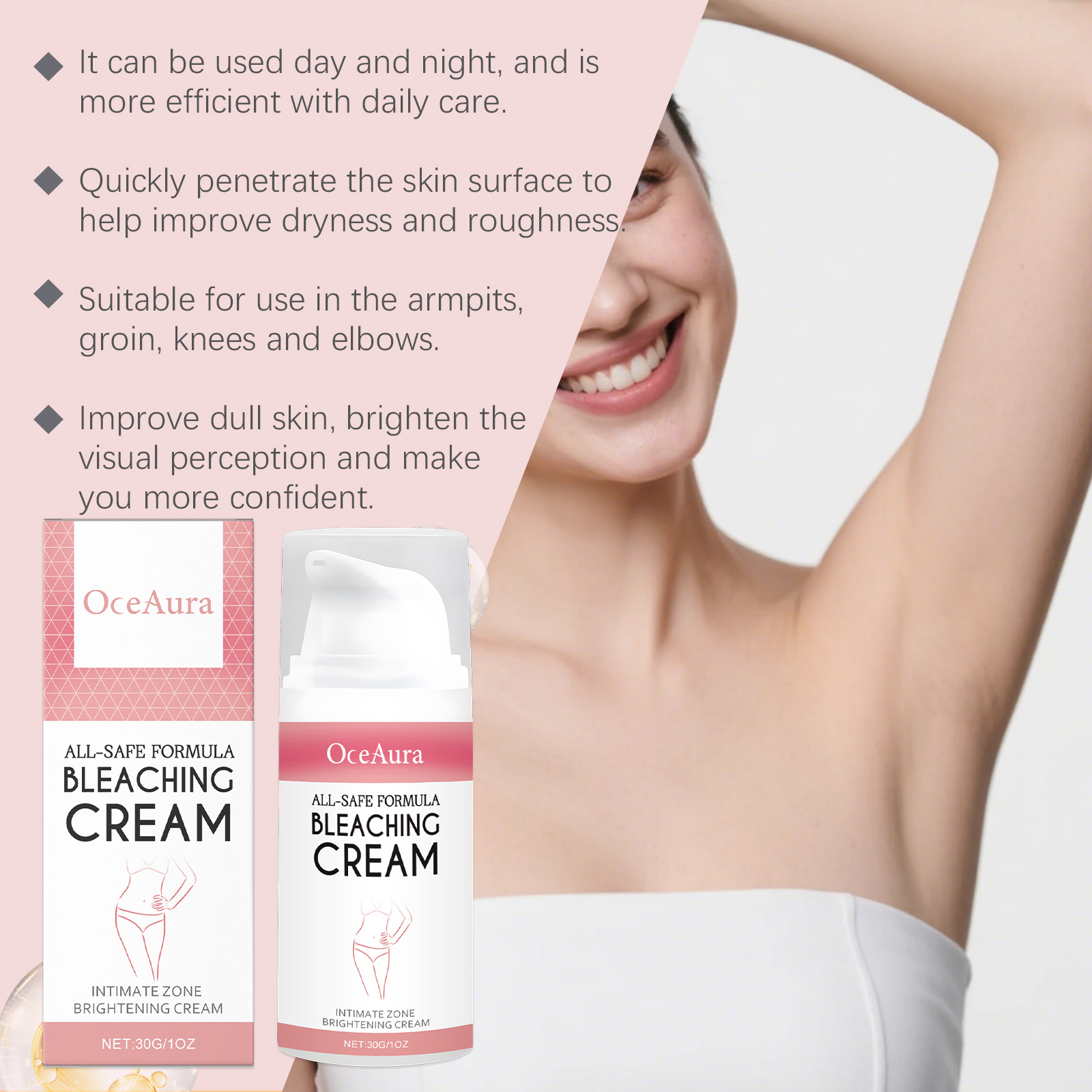我们的女士身体护理霜,由视黄醇、透明质酸精心调配而成。专为改善局部暗沉并提亮肤色设计。使用方法极为便捷:清洁并擦干身体皮肤。取适量产品,均匀涂抹在身体皮肤上,如腋下、比基尼线、大腿内侧、膝盖和肘部。轻轻按摩至吸收。并且可以缓解干燥,增强皮肤光滑度和弹性。