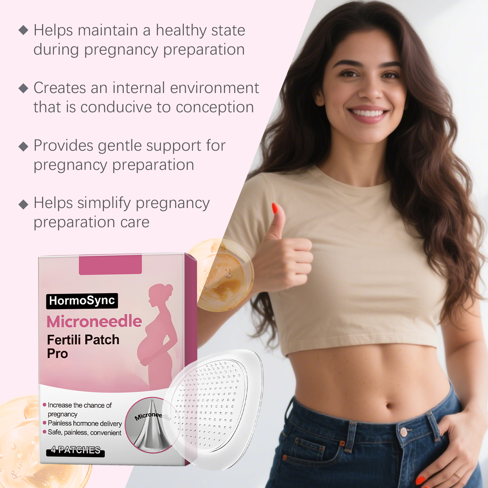 我们的身体护理贴,由生姜、生育酚精心调配而成。专为帮助在备孕期间维持健康状态设计。使用方法极为便捷:1. 清洁肚子并保持干燥。2. 将贴片贴于肚子上,轻轻按压至少3秒钟。3. 24-48 小时后,轻轻撕下贴片。并且可以辅助身体调理。