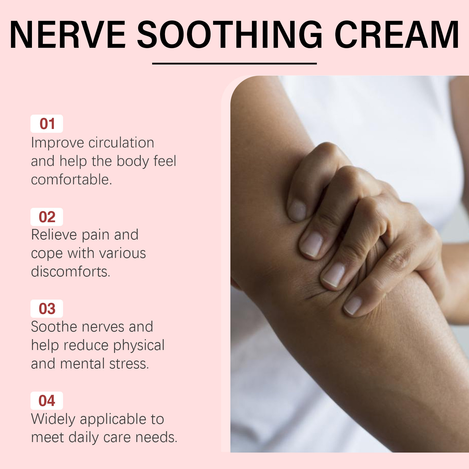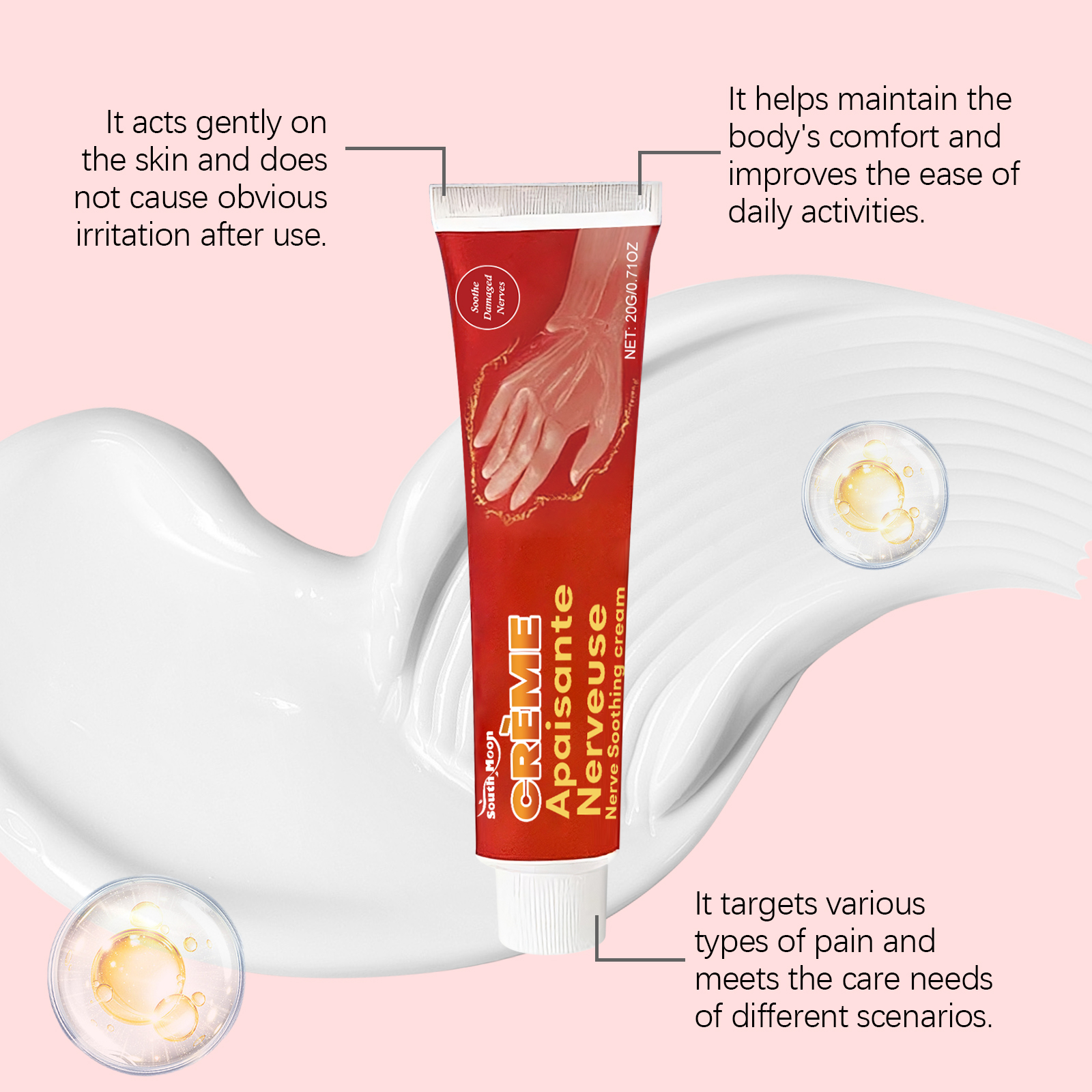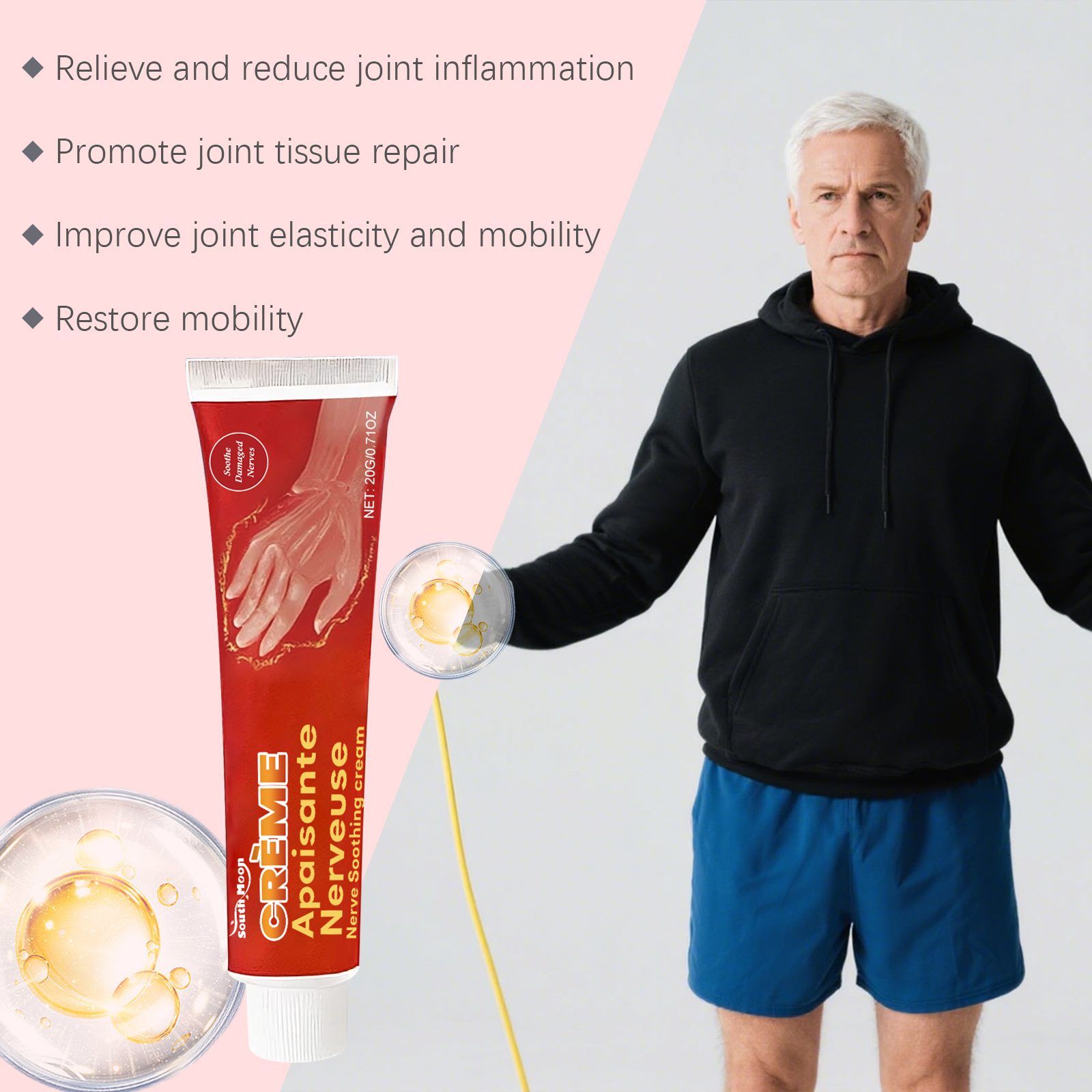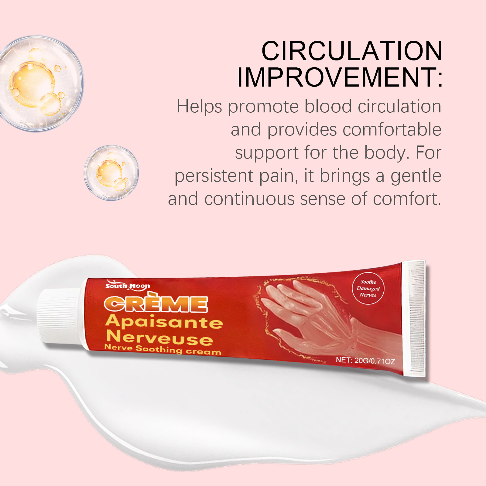 我们的关节按摩霜,由甘油、矿油、甘油硬脂酸酯精心调配而成。专为改善血液循环,缓解常见的劳作性手足疼痛设计。使用方法极为便捷:清洁皮肤并干燥,取适量本品涂抹在手部和足部肌肤上并轻轻按摩促进吸收。并且它可以缓解因神经病变、关节炎引发的持续性疼痛,帮助减少压力舒缓神经。