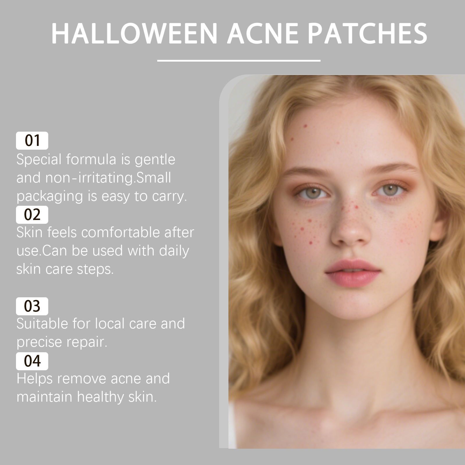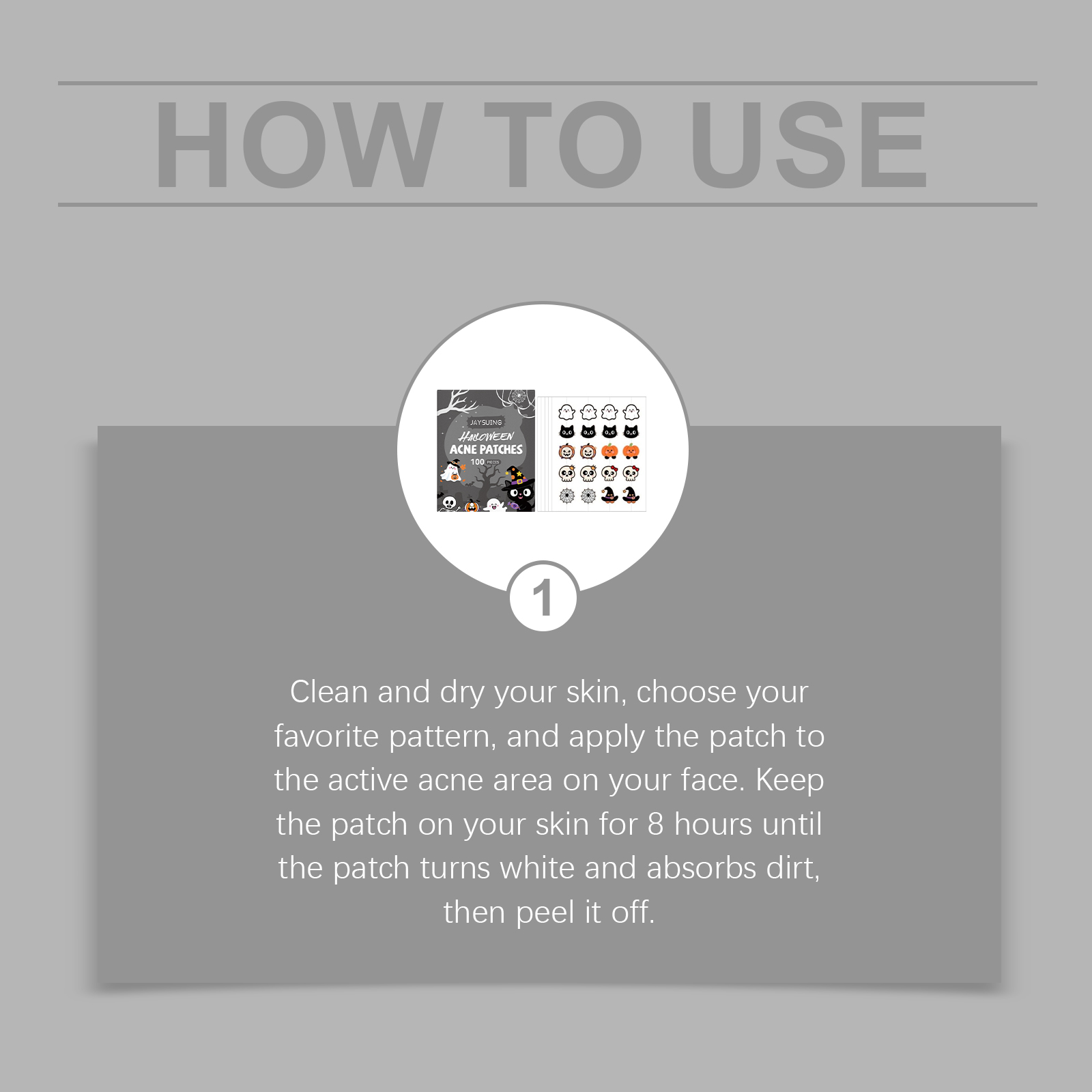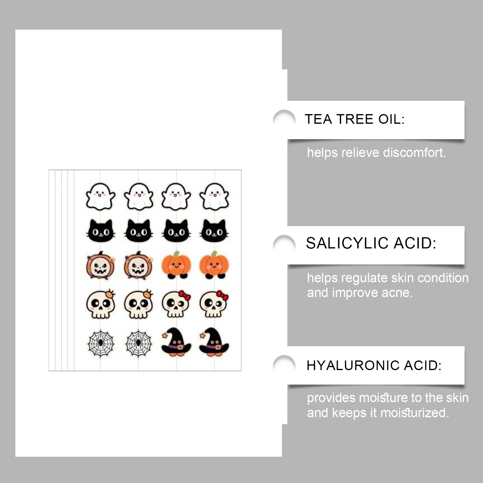 我们的万圣节痘痘贴,由水杨酸、透明质酸精心调配而成。专为缓解皮肤不适并减少红肿设计‘。使用方法极为便捷:清洁并干燥你的皮肤,选择你喜爱的图案,然后将贴片贴到面部有痤疮的活跃区域。让贴片在皮肤上停留8小时,直到贴片变白并吸收污垢,然后将其揭下。并且可以形成透气屏障,以减少外部污染。