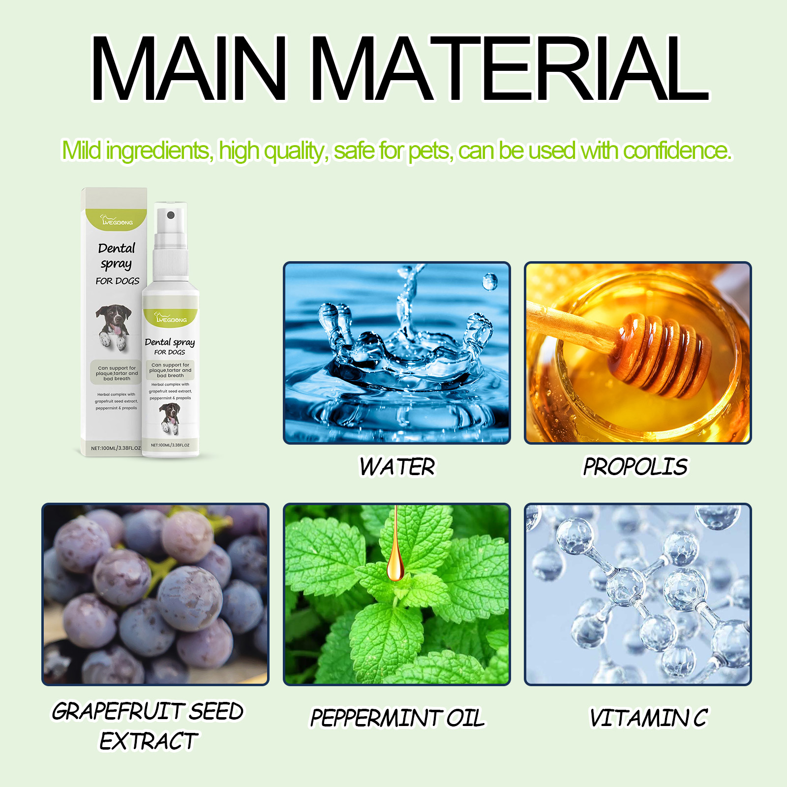 我们的宠物薄荷味清新口气喷雾含有蜂胶,葡萄柚籽提取物,维生素C。它可以深层清洁宠物牙齿,保护口腔健康;深度清洁宠物牙齿,帮助宠物清洁口腔,享受与宠物的亲密接触。它的使用方法很简单:使用前摇匀,然后喷入宠物口中即可,每天一次效果更佳。可以轻松去除宠物口腔异味,清新口气。