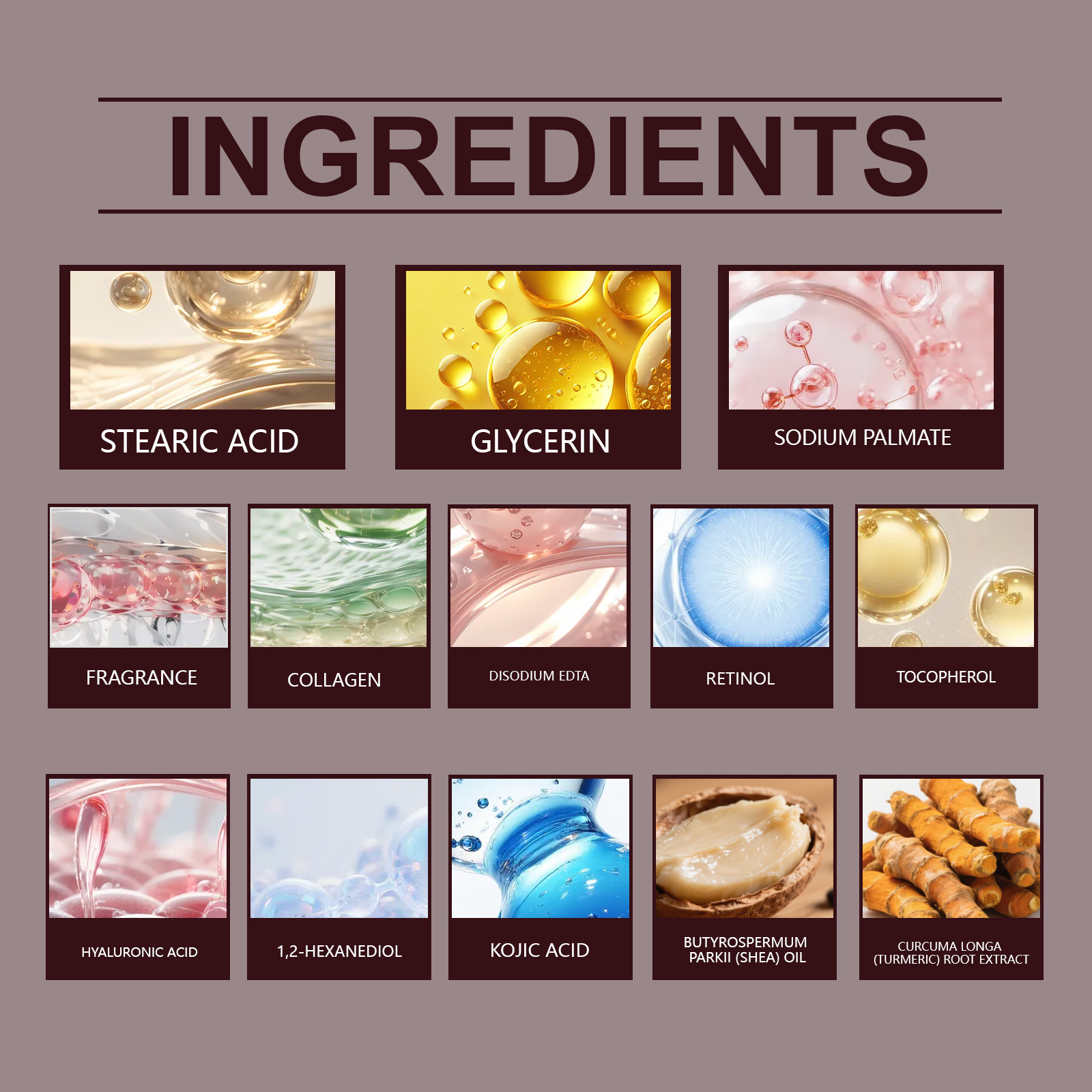 我们的姜黄皂,由硬脂酸、棕榈油酸钠精心调配而成。专为有效减少黑色素沉积,均匀肤色,令肌肤更亮白透亮设计。使用方法极为便捷:用温水湿润皮肤,将肥皂均匀地涂抹在皮肤,轻轻按摩20-30秒,用清水彻底冲洗。并且它可以深层滋养肌肤,保持水润,提升肌肤光泽, 改善肤色不均,令肌肤焕发光彩,健康亮泽。