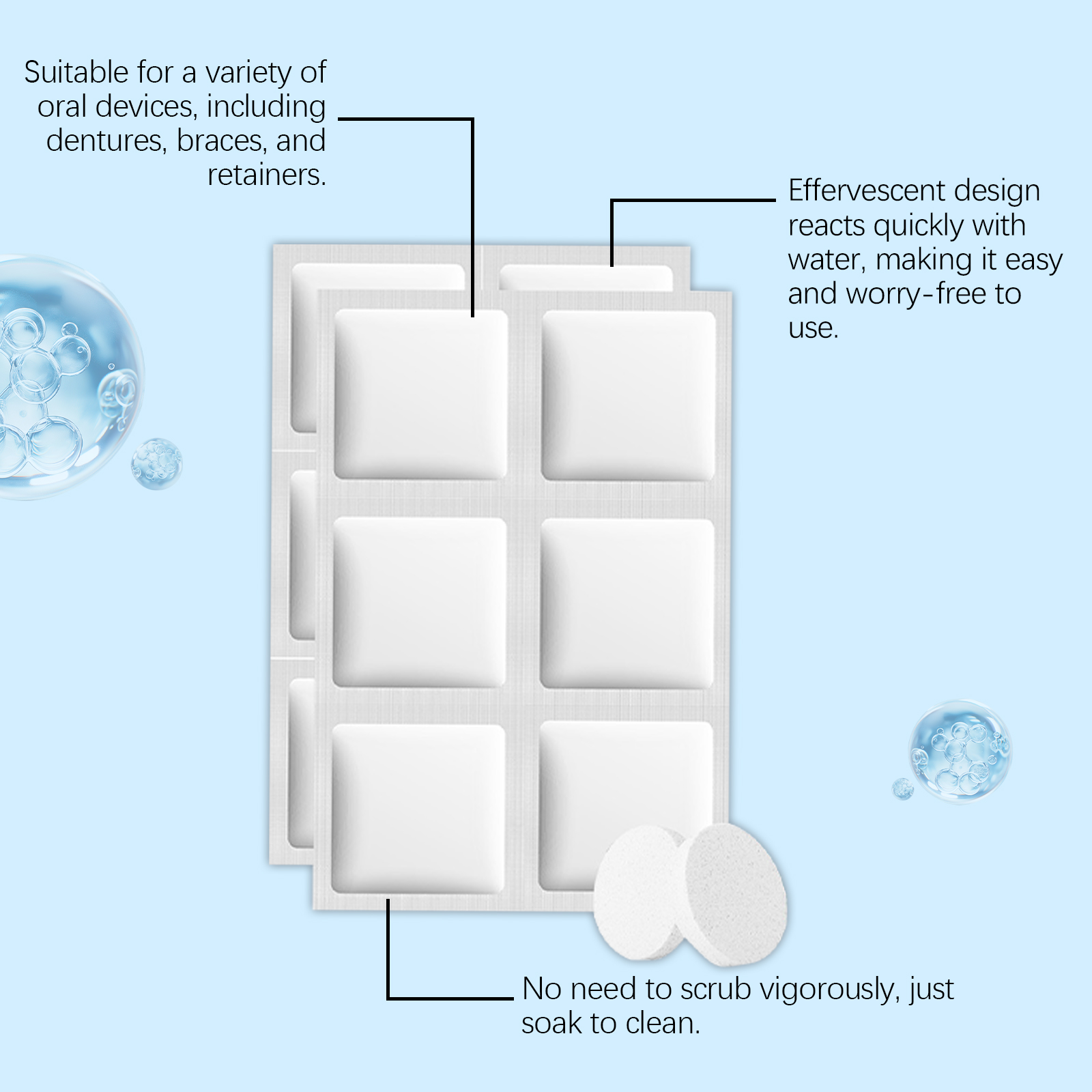 我们的假牙清洁泡腾片,由碳酸氢钠、柠檬酸精心调配而成。专为去除缝隙中的污垢,不留死角,去除积累的异味,保持设备清新并看起来最佳设计。使用方法极为便捷:1.将一片本产品加入适量的水中,等待其溶解。2.将假牙保持器放入溶液中,等待15分钟,然后取出并用清水冲洗。并且它可以溶解顽固污渍并改善设备的外观。
