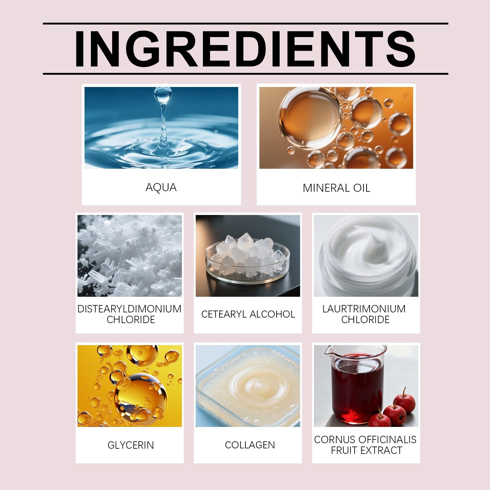 我们的弹力素含有胶原蛋白、山茱萸提取物。它可以滋养发质,深层修护,使发质不易受损,使发质更柔顺。它的使用方法很简单:1.洗发后,将湿发吹至半干,使其蓬松。2.取适量本品涂抹在手掌上,从头发中间到头发顶部,均匀涂抹在头发上。3.双手插入头发的尖端,向上抓紧,直到头发轻轻地向尖端扭动,再次向上抓紧。并且可以护理卷发。