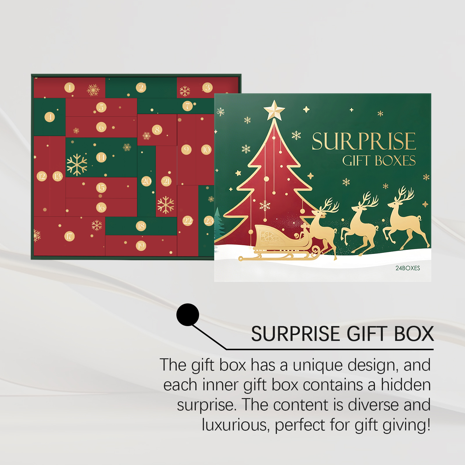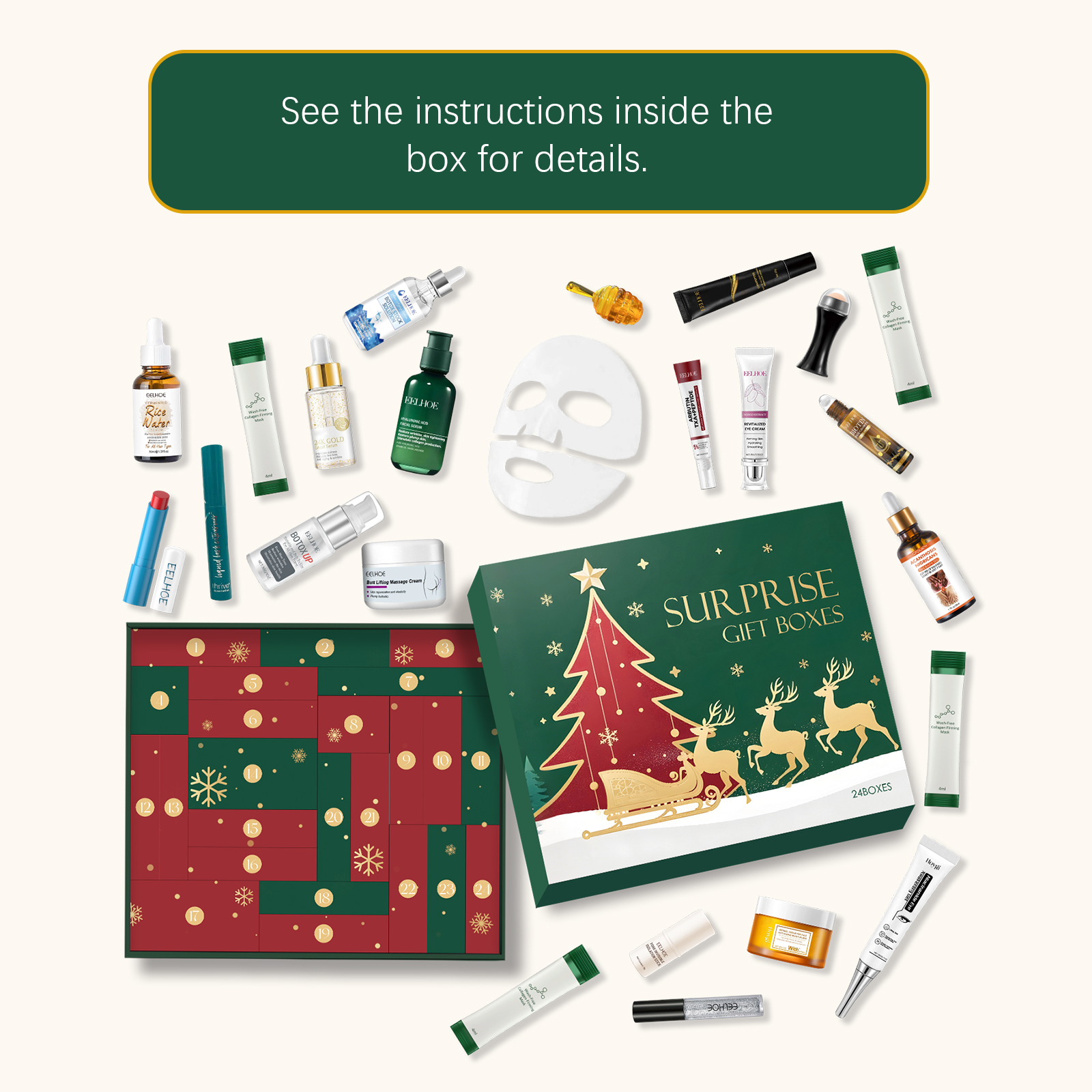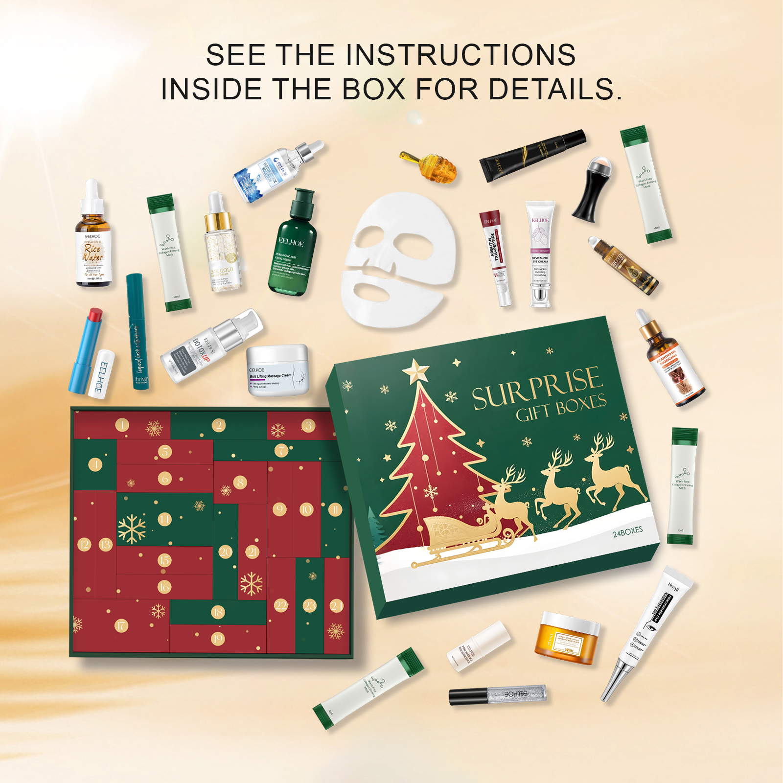 我们的圣诞美妆护肤惊喜盲盒,由眼部紧致霜、米水头发精油等精心搭配而成。专为神秘盒汇聚多元美妆好物,一站式满足多样美丽需求设计。使用方法极为便捷:详见盒内说明。并且它可以丰富多样美妆商品藏于盒,给你海量惊喜选择空间,神秘盒内美妆品类齐全,轻松解锁多样魅力妆容 。