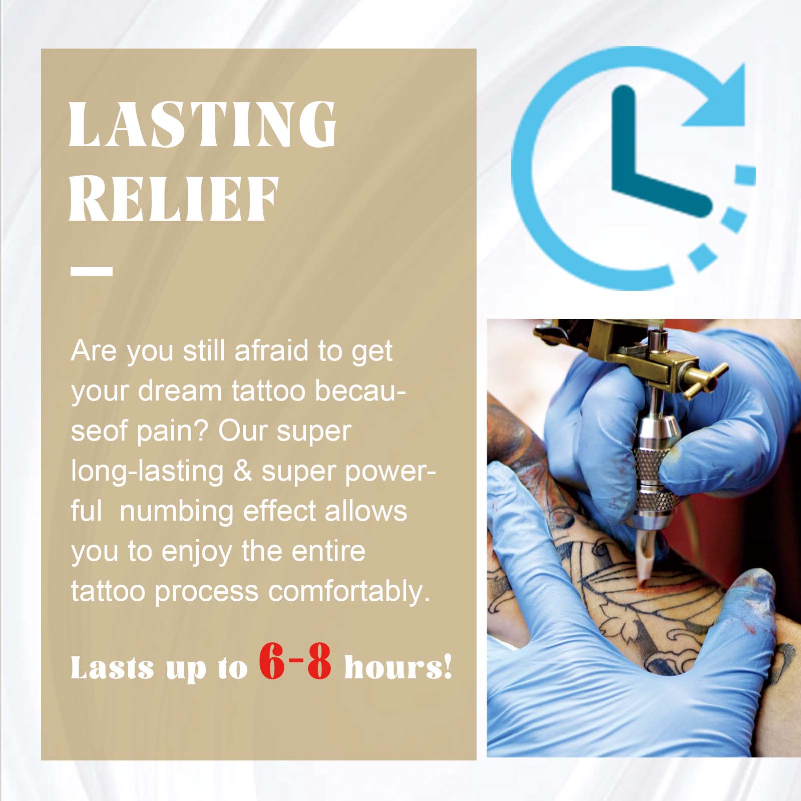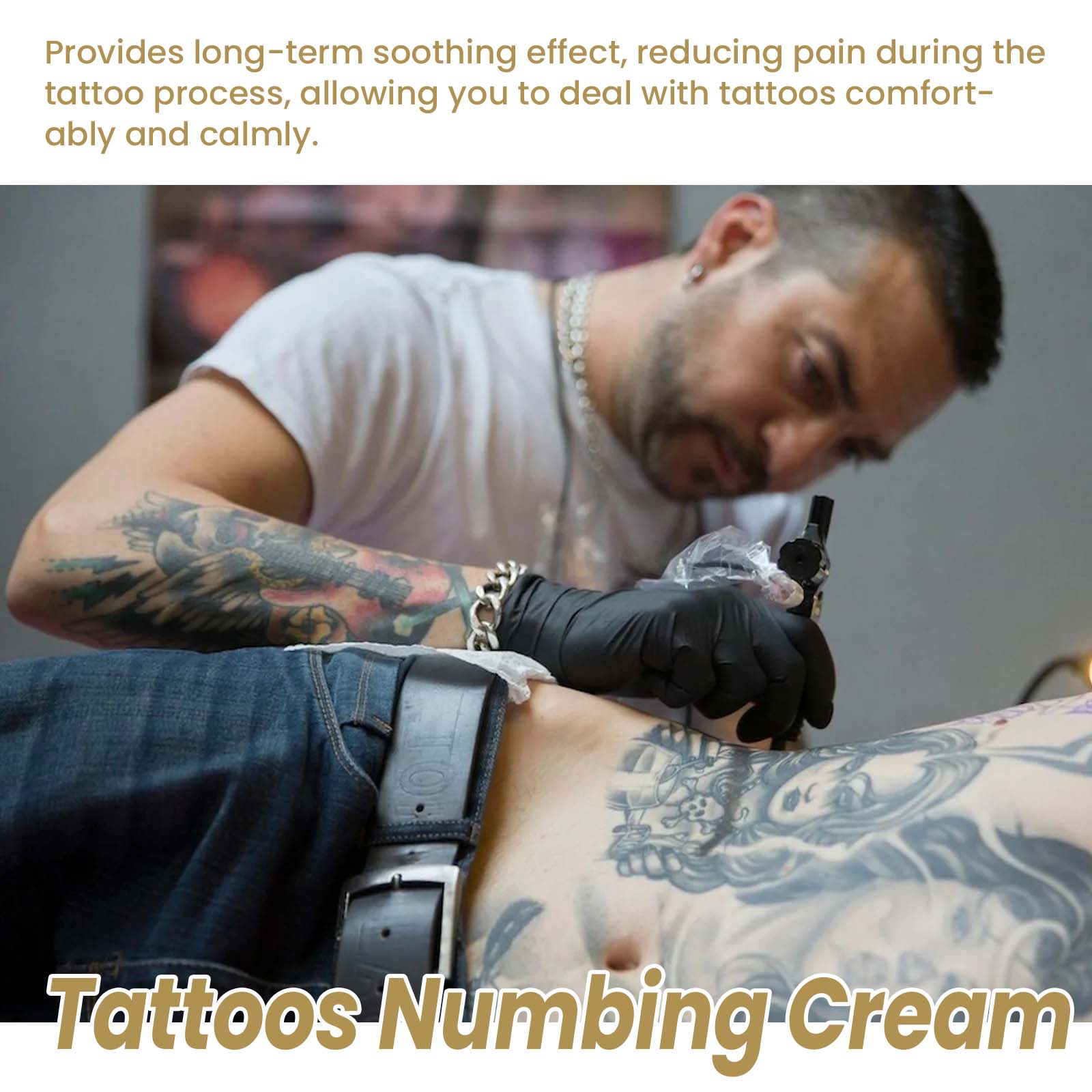 我们的纹身护理膏含有芦荟提取物、薄荷提取物、维生素E。它可以提供长期舒缓效果,减少纹身过程中的疼痛,让您舒适,平静地处理纹身。它的使用方法很简单:首先清洗并擦干待纹身部位,把面霜厚涂在皮肤上,轻轻按摩,直到完全吸收,之后用保鲜膜包裹40分钟,最后就可以开始纹身了。使用后可以对皮肤起到软化作用,用起来很舒服,同时能在表面形成保护膜,补充水分,提高皮肤的抗疼痛能力。