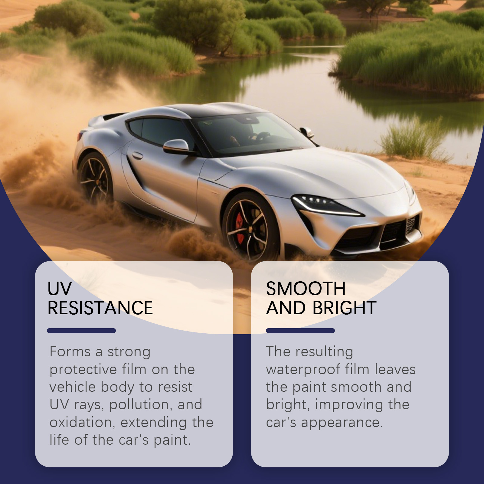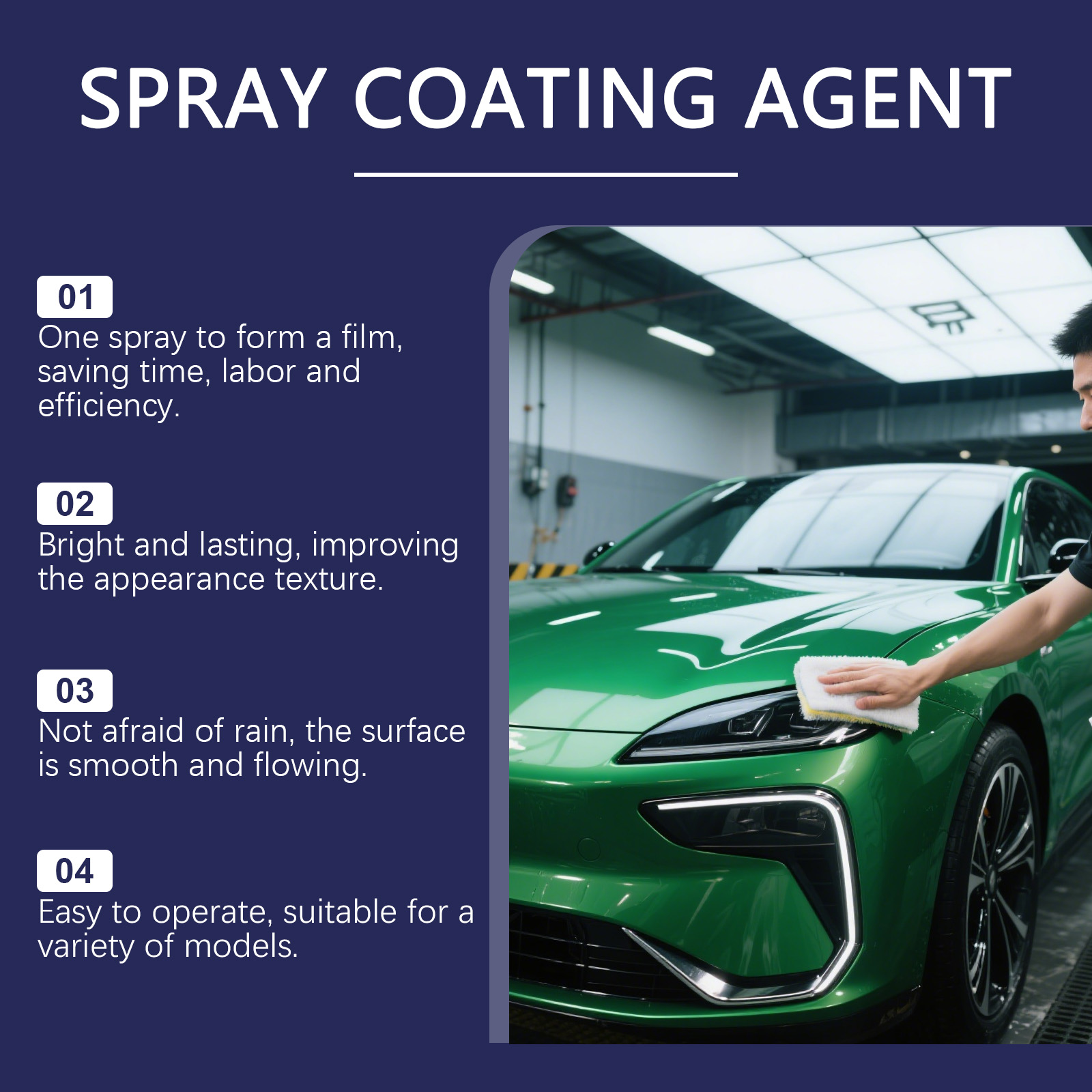 我们的汽车镀膜喷雾套装,由去离子水、聚四氟乙烯精心调配而成。专为在车身上形成一层坚固的保护膜,以抵抗紫外线、污染和氧化,并延长汽车油漆的使用寿命设计。使用方法极为便捷:1.清洁汽车表面,移除灰尘和杂质。2.摇匀瓶身,在距离表面约20厘米处,均匀喷洒。3.用海绵均匀擦拭车身。4.最后用毛巾擦拭直到车漆抛光为止。并且它可以形成的防水膜可以使车漆光滑明亮,改善汽车外观,有效防止水渍和污垢附着,保持车表面清洁。
