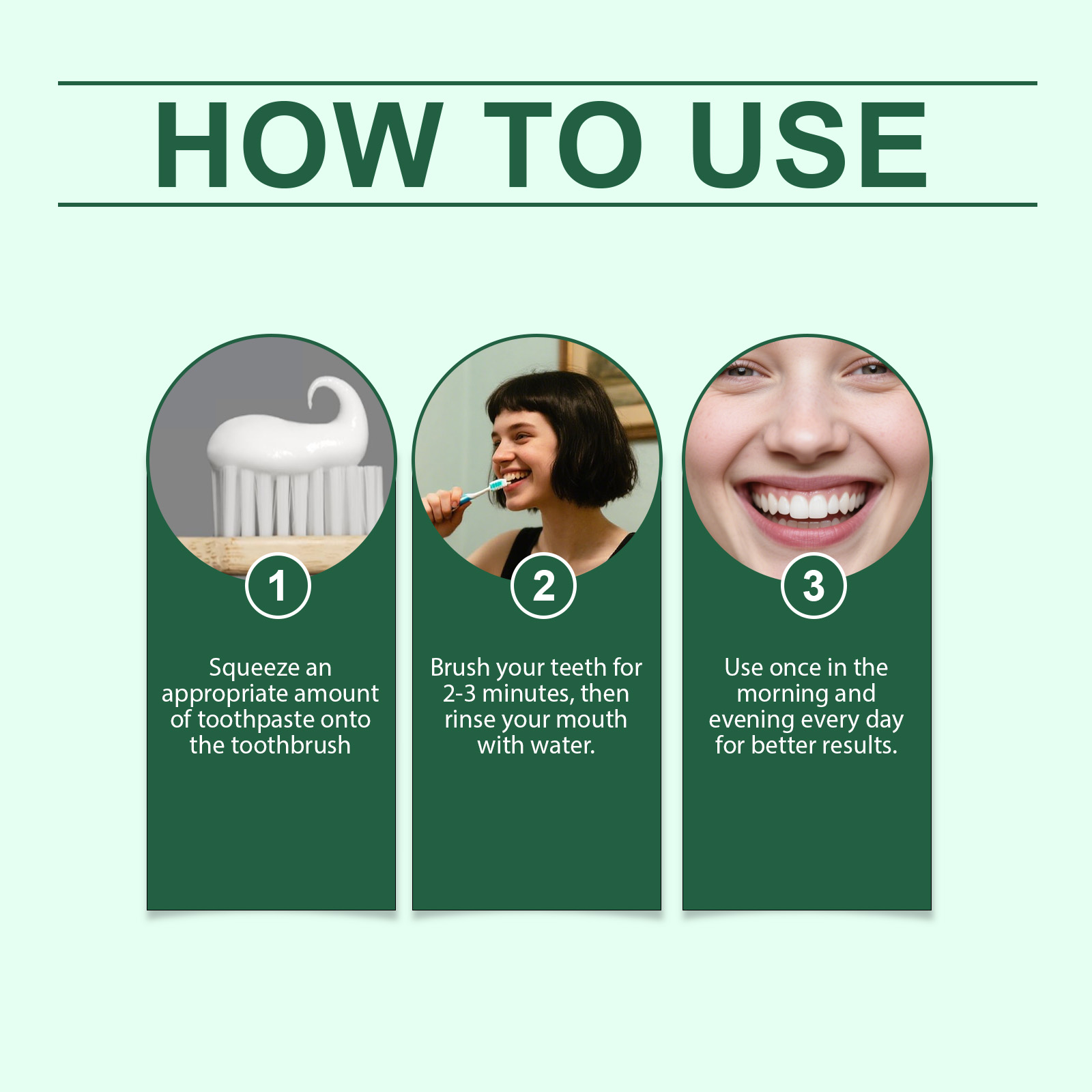 我们的草本清新牙膏,由薄荷提取物、小苏打精心调配而成。专为提亮牙齿的颜色设计。使用方法极为便捷:在牙刷上挤出适量的牙膏。刷牙2-3分钟,然后用清水漱口。每天早晚各使用一次,以获得更好的效果。并且可以长时间保持口腔清新。