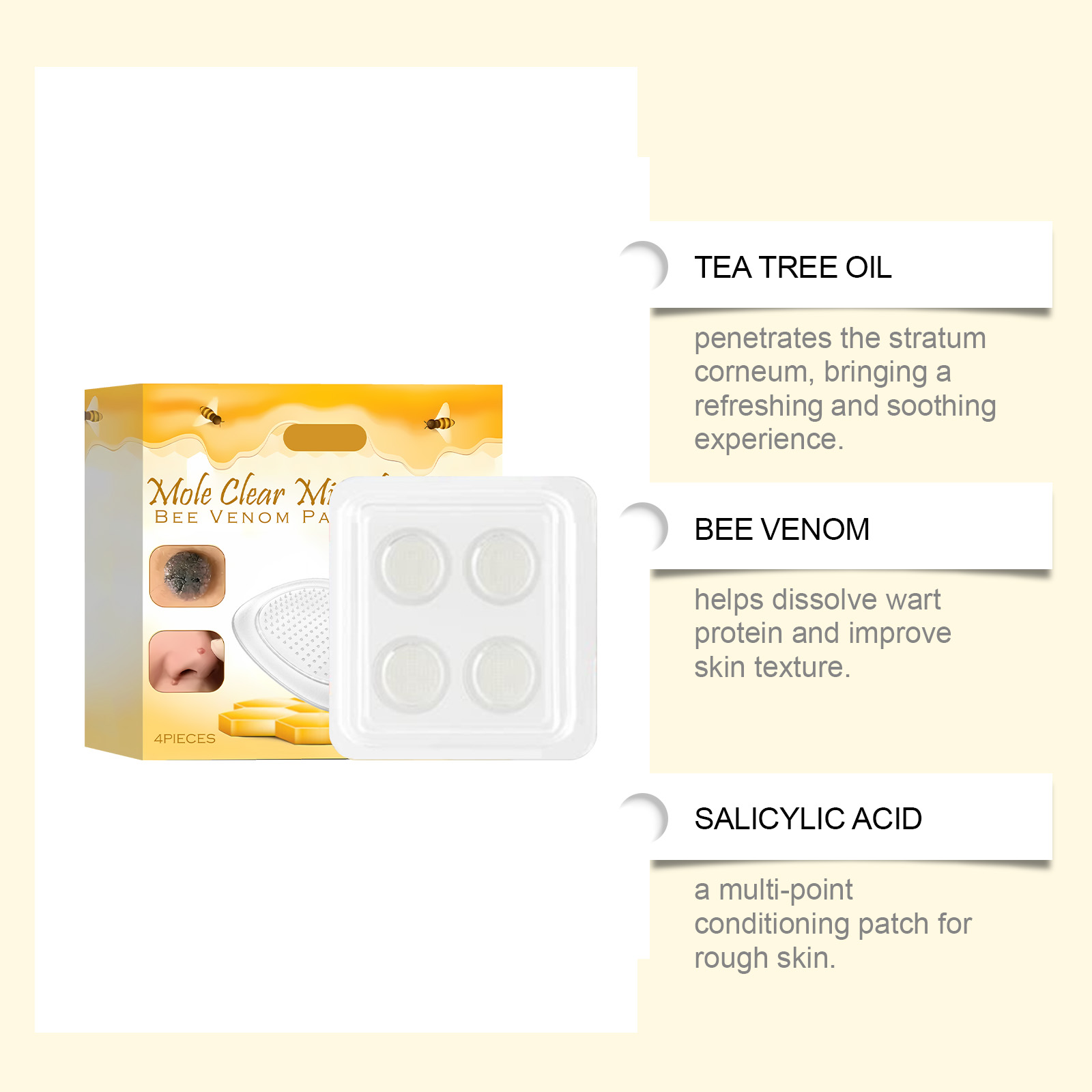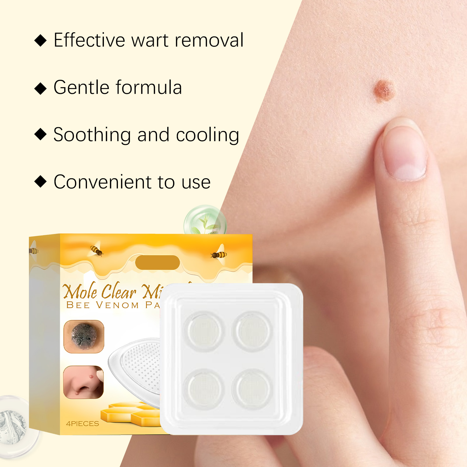 我们的肌肤护理贴,由甘油、羟乙基纤维素精心调配而成。专为淡化皮赘与痣,平滑肌肤设计。使用方法极为便捷:1.轻柔清洁皮肤并干燥。2.取出本品,将其直接贴在疣痣肌肤处。3.轻轻按压贴片约5秒钟,确保贴合。4.等待6-8小时后取下贴片并轻柔清洁皮肤。并且它可以有效去角质,促进皮肤更新,提升去疣效果,促进血液循环,增强肌肤自愈能力。
