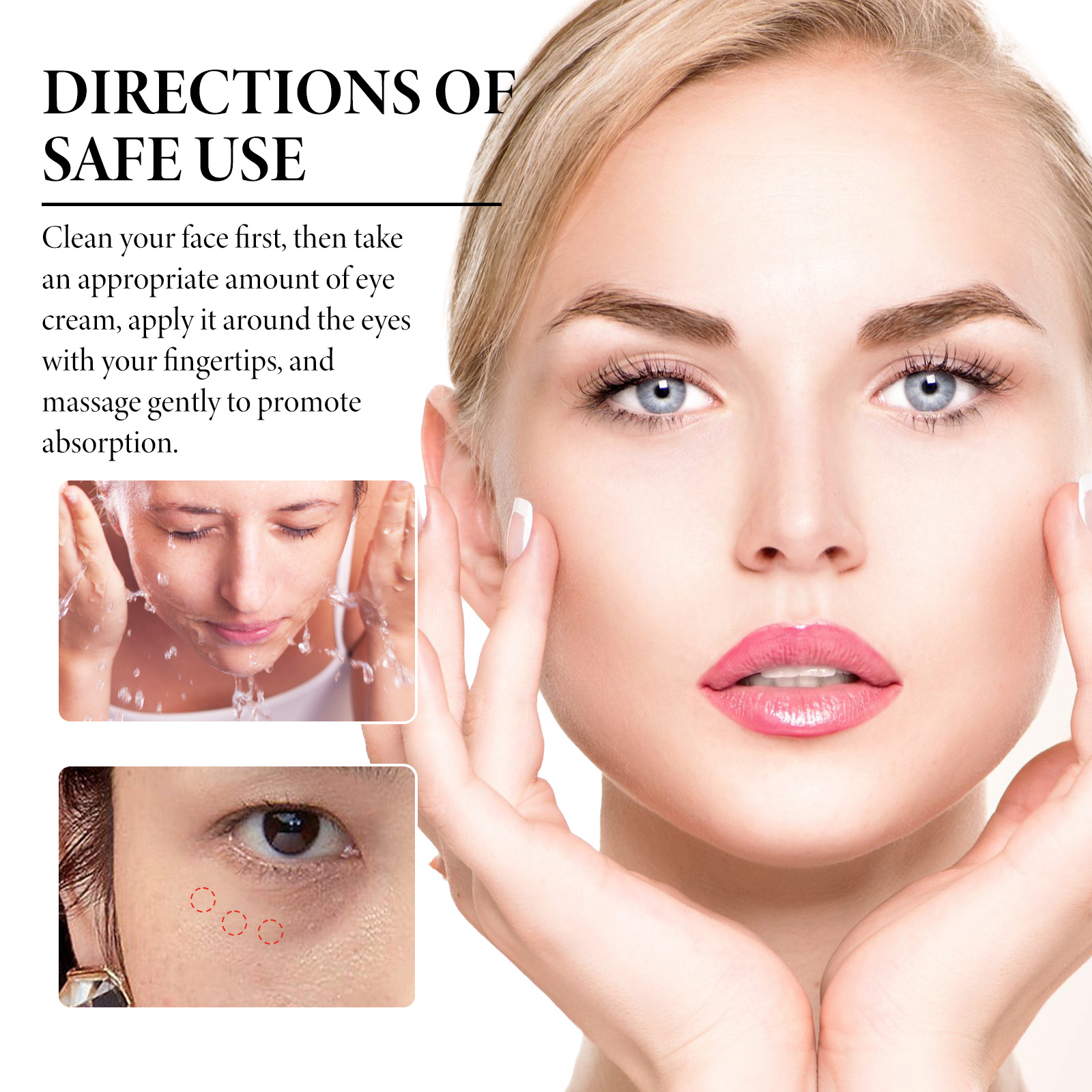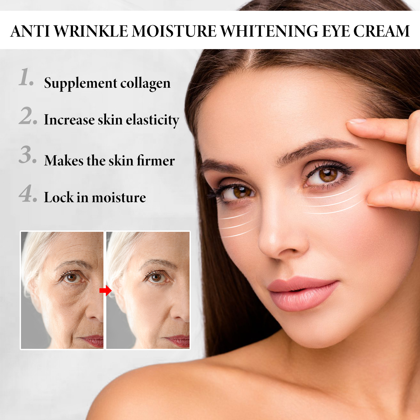 我们的胶原蛋白抗皱眼霜含有透明质酸、胶原蛋白、茉莉花提取物。它可以为眼部肌肤补充胶原蛋白,紧致肌肤,使肌肤看起来更年轻。能为肌肤锁住水分,滋润肌肤,使肌肤看起来更光滑有光泽。它的使用方法很简单:先清洁脸部肌肤,然后取适量眼霜,用指腹涂抹于眼部周围,并轻轻按摩促进吸收。可以帮助增加皮肤的弹性和紧致度,使眼周肌肤更紧致更有弹性。
