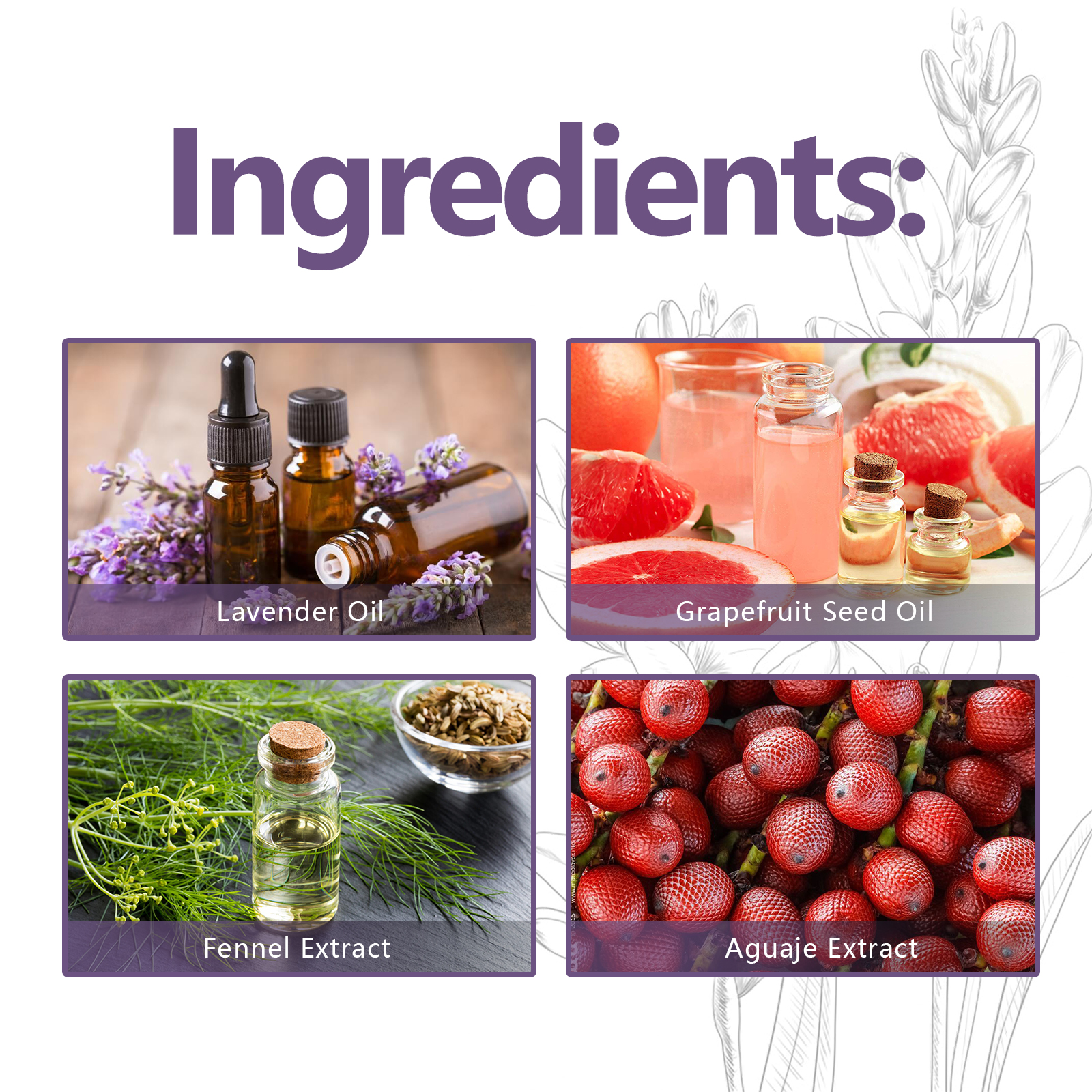 | 成分 | 薰衣草油、葡萄柚籽油、茴香提取物 |