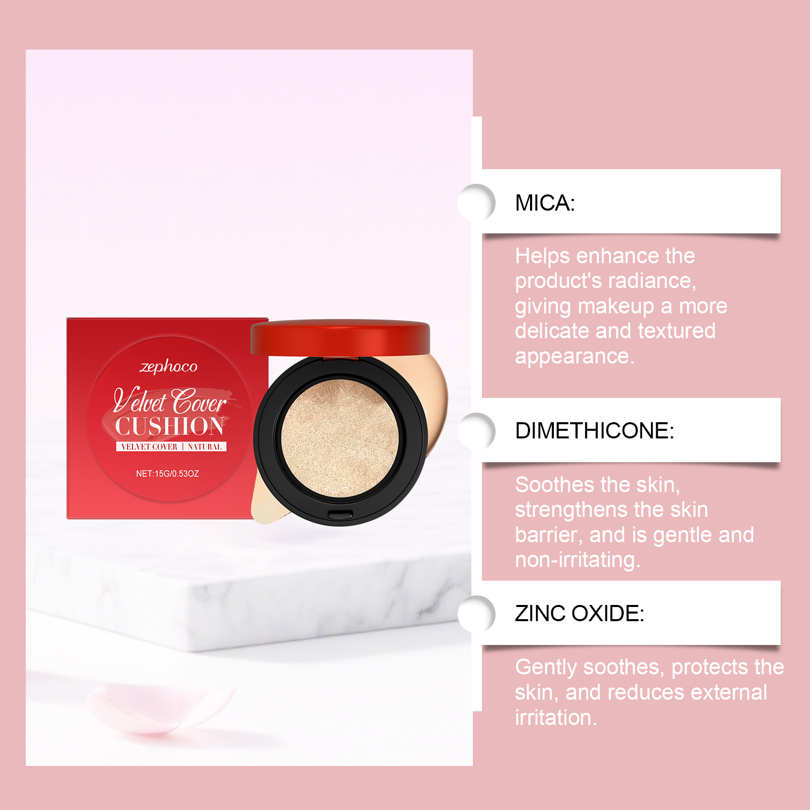 我们的保湿遮瑕气垫,由聚二甲基硅氧烷、二氧化钛精心调配而成。专为轻松掩盖肌肤瑕疵,打造无瑕完美底妆设计。使用方法极为便捷:1.用自带的粉扑轻轻按压气垫,蘸取适量的粉底液。2.将粉扑上的粉底轻拍于面部,从面部中心向外轻轻按压,使脸部呈现均匀状态。3.底妆完成后,可用散粉或定妆喷雾定妆。并且它具备轻盈配方,妆感自然透气,不厚重,持久保持完美妆效,持久不脱妆,耐汗防水,全天保持妆容完美无瑕。