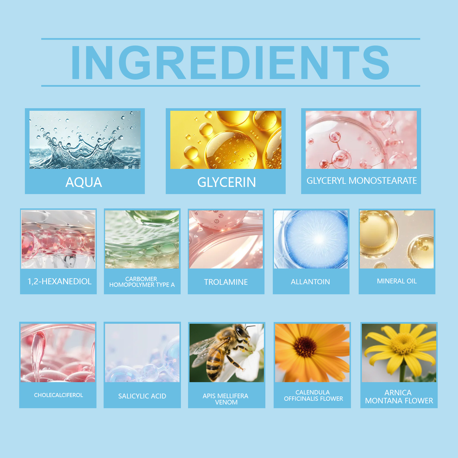 我们的蜂毒皮肤护理霜,由甘油、矿油、甘油硬脂酸酯精心调配而成。专为舒缓肌肤,改善肌肤不适,减少皮肤问题,滋养肌肤设计。使用方法极为便捷:将产品涂抹涂抹在受影响的区域,轻轻按摩至吸收。并且它可以支持针对常见肌肤问题的护理,促进肌肤瑕疵恢复,焕现健康肌肤光彩。
