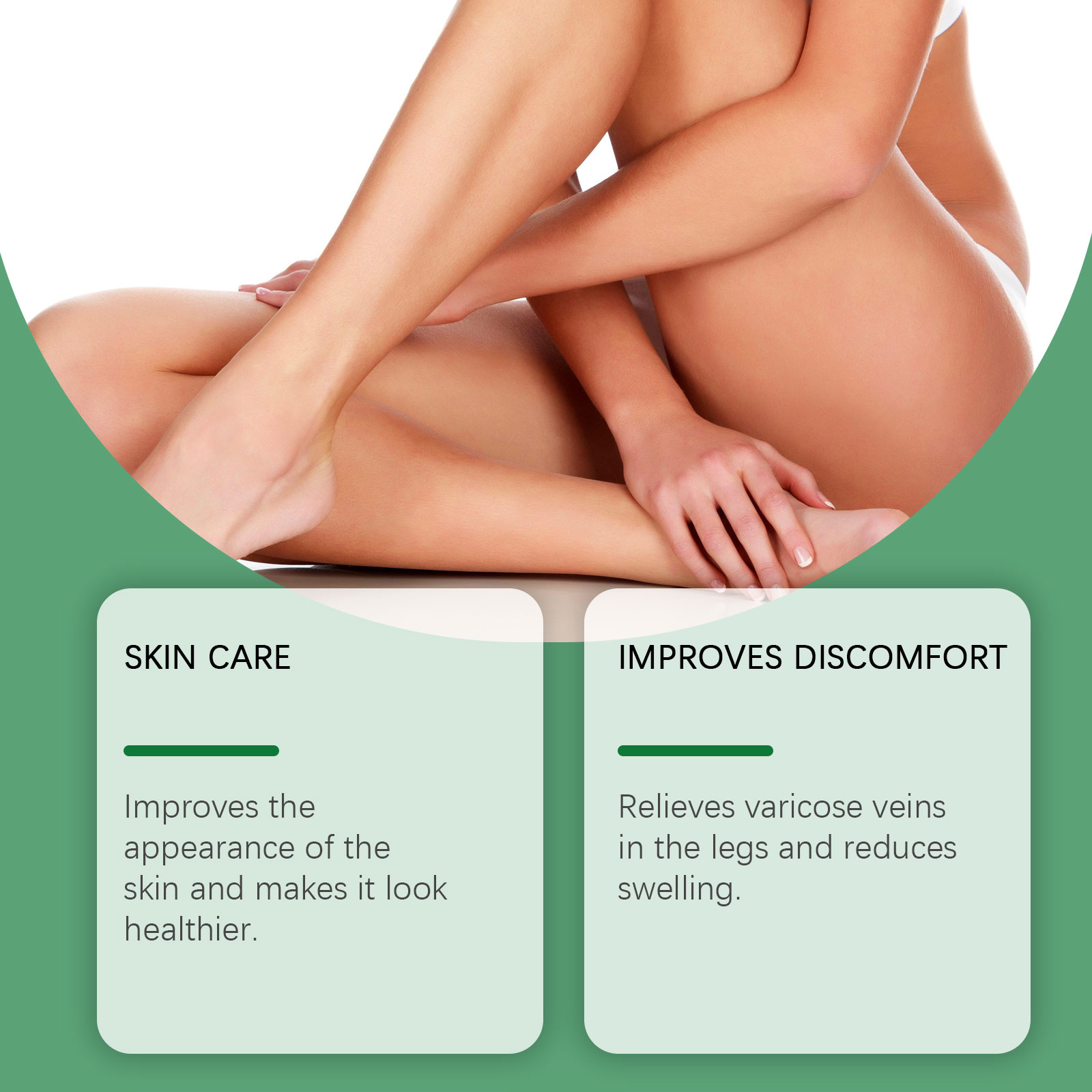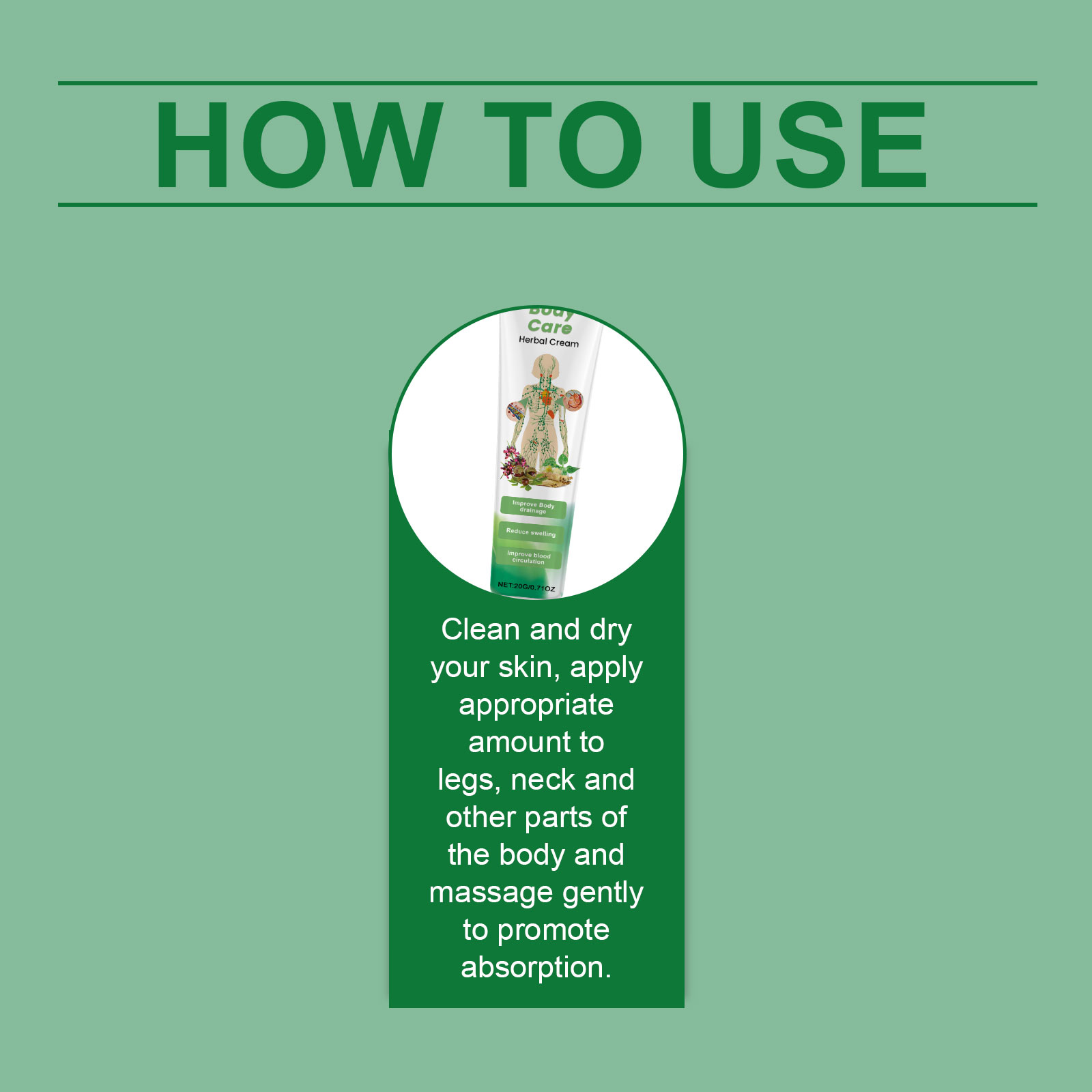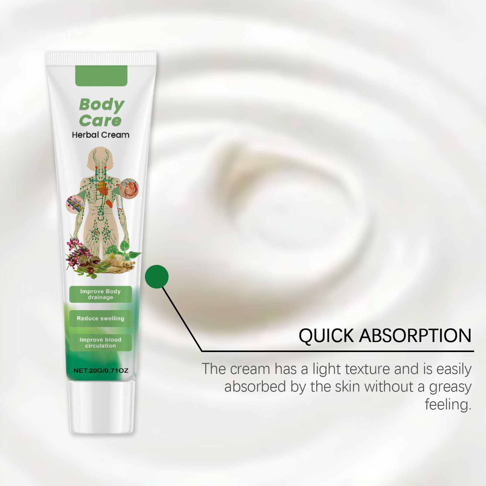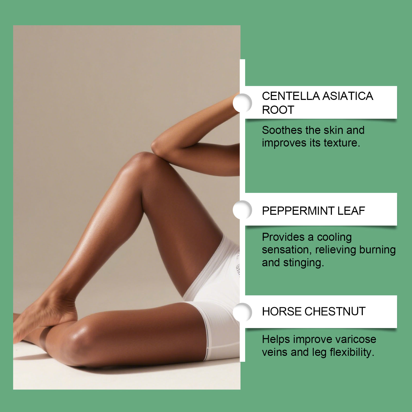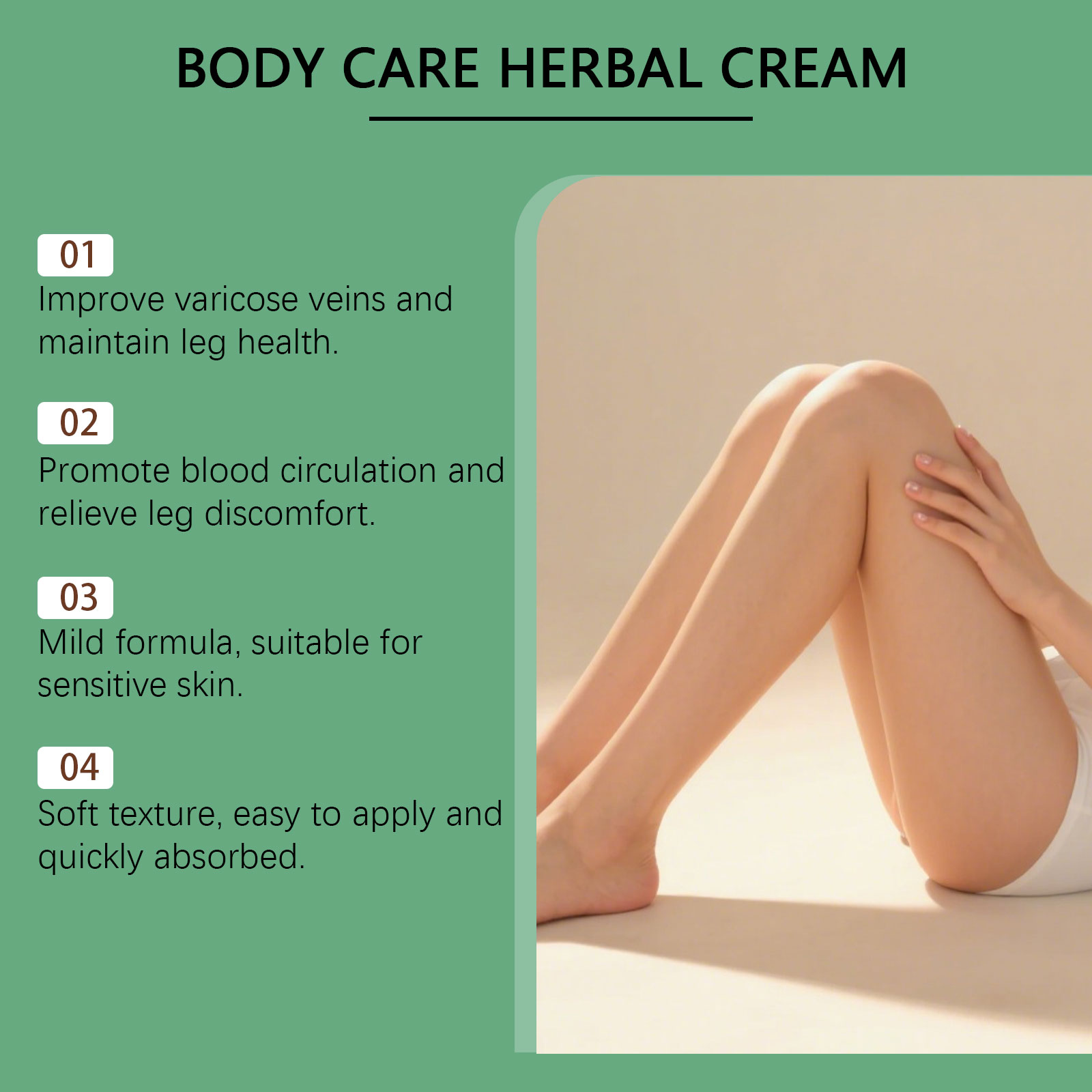 我们的草本护理霜,由薄荷叶、七叶树精心调配而成。专为缓解腿部静脉曲张并减少肿胀设计。使用方法极为便捷:清洁并擦干皮肤,取适量涂抹于腿部、颈部和其他身体部位,并轻轻按摩,以促进吸收。并且可以舒缓肌肤并改善其质地。