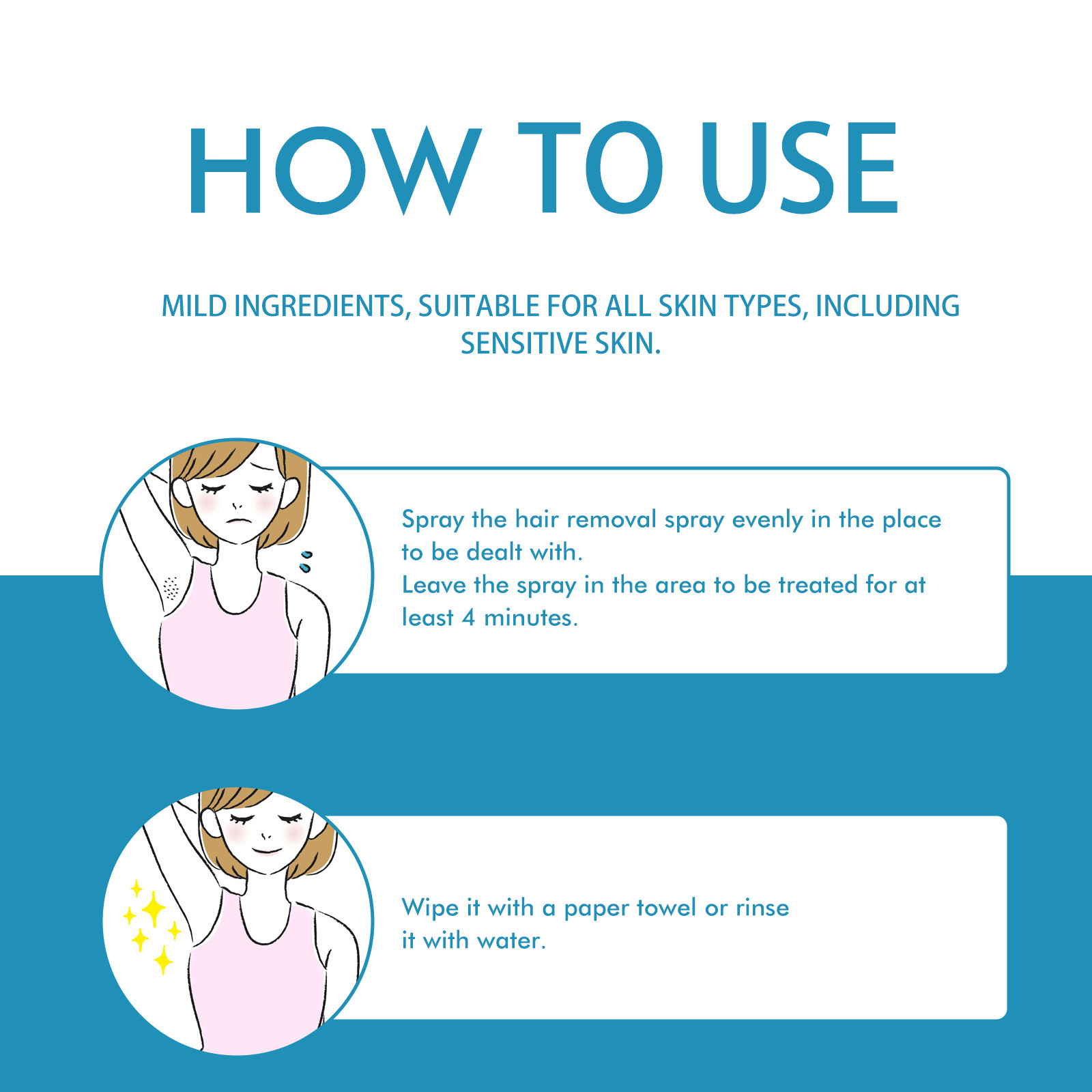 我们的脱毛喷雾含有甘油、尿囊素、库拉索芦荟叶提取物。它可以深层脱毛,温和不伤皮肤,延缓毛发生长,使皮肤光滑干净。它的使用方法很简单:将脱毛喷雾均匀地喷在要处理的地方,将喷雾剂留在待处理的区域4分钟,再用纸巾擦一擦或用水冲洗干净即可。可以在较短的时间内有效地去除毛发,使皮肤光滑。