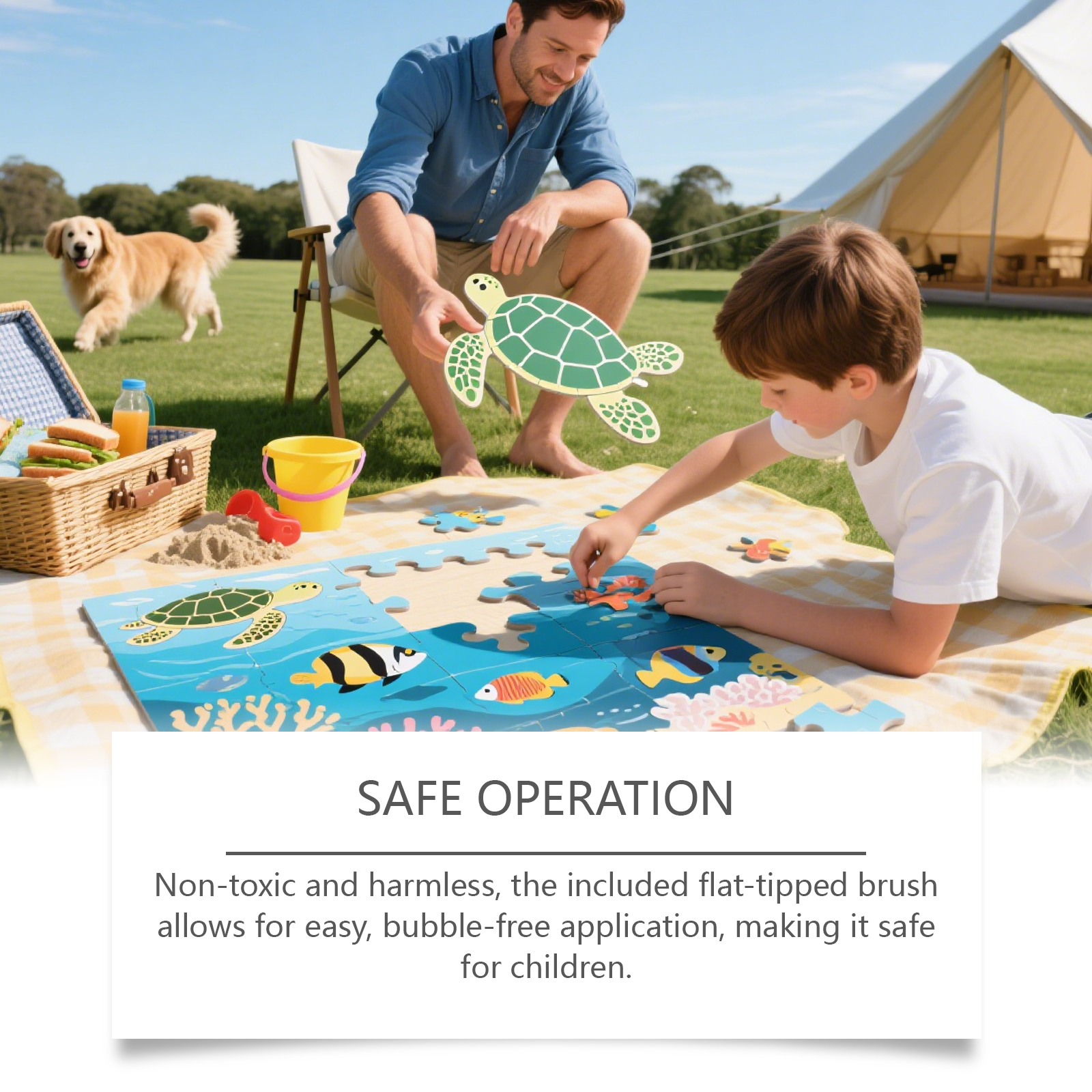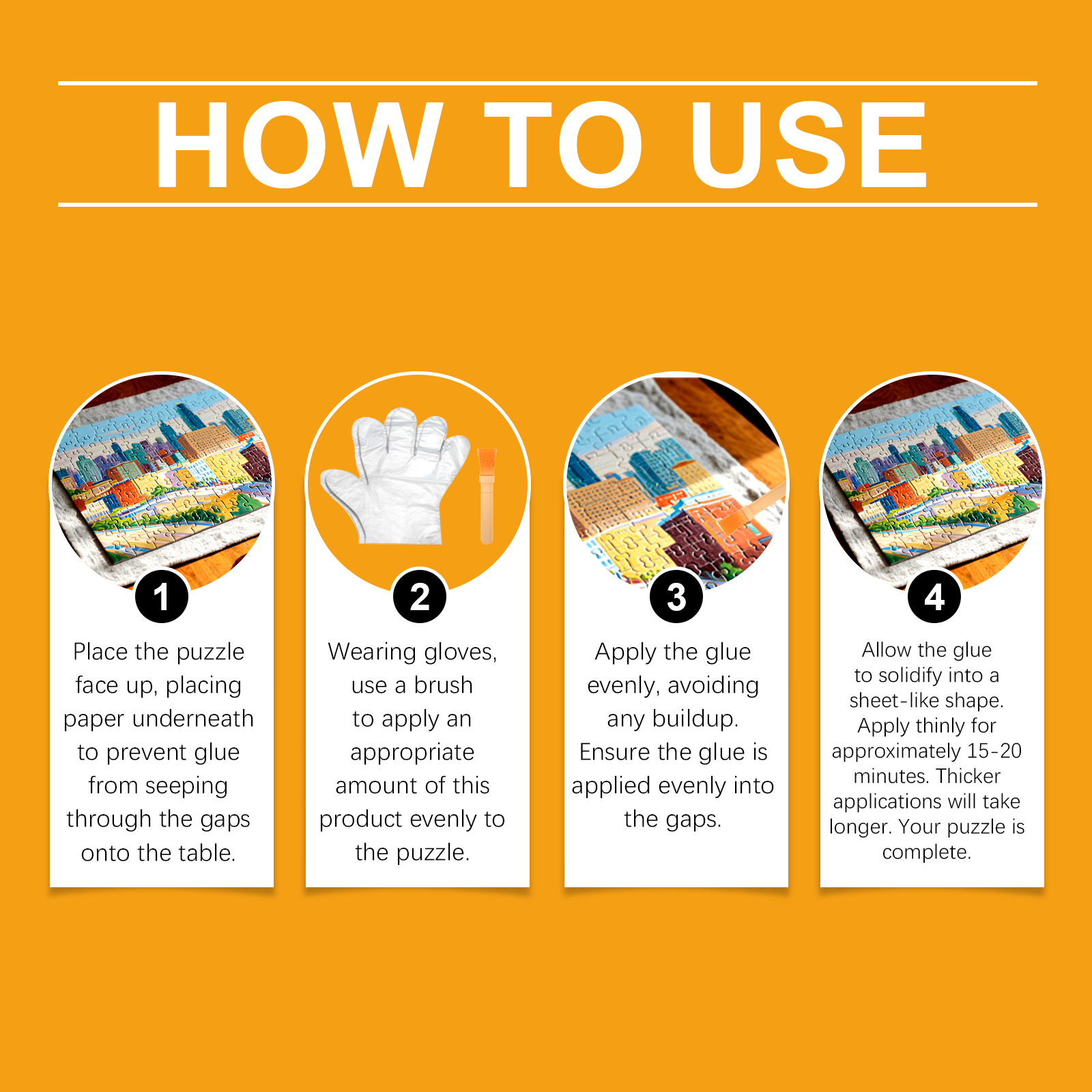 我们的拼图胶水,由氢化蓖麻油、水溶性聚乙烯醇蜡精心调配而成。专为初始固化和在2小时内完全干燥,确保您的拼图块快速且牢固地固定设计。使用方法极为便捷:将拼图正面朝上放置,下面垫纸以防止胶水从缝隙中渗到桌子上。戴上手套,用刷子将适量的该产品均匀地涂在拼图上。均匀涂抹胶水避免任何堆积。确保胶水均匀地涂在缝隙中。让胶水固化形成片状形态。薄薄地涂抹,大约需要15至20分钟。较厚的涂抹需要更长时间,此时你的拼图就完成了。并且无毒且无害,附带的扁平尖端刷头,可实现轻松、无气泡的应用,确保儿童使用安全。