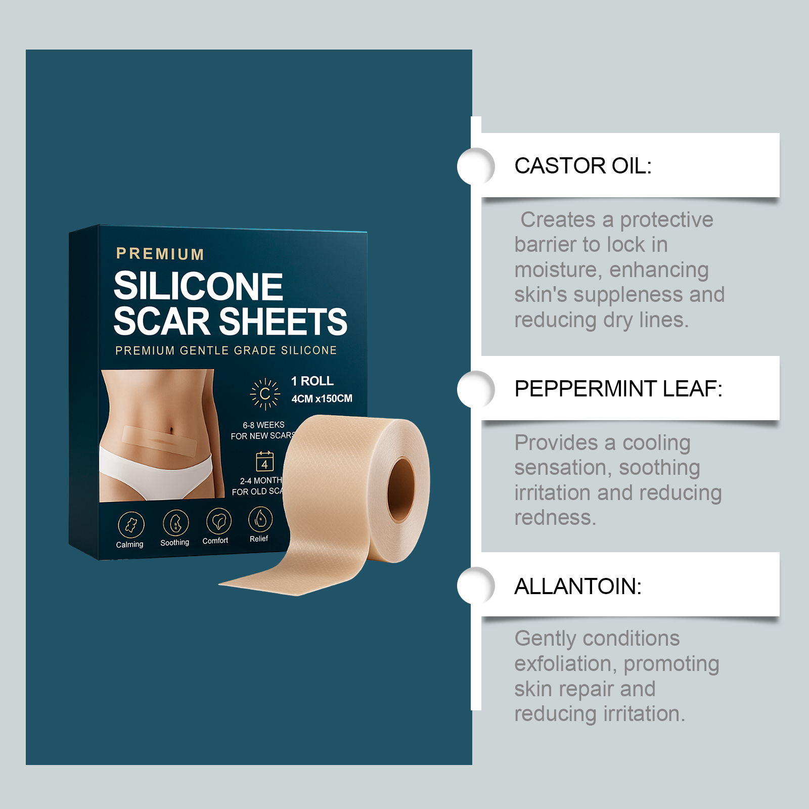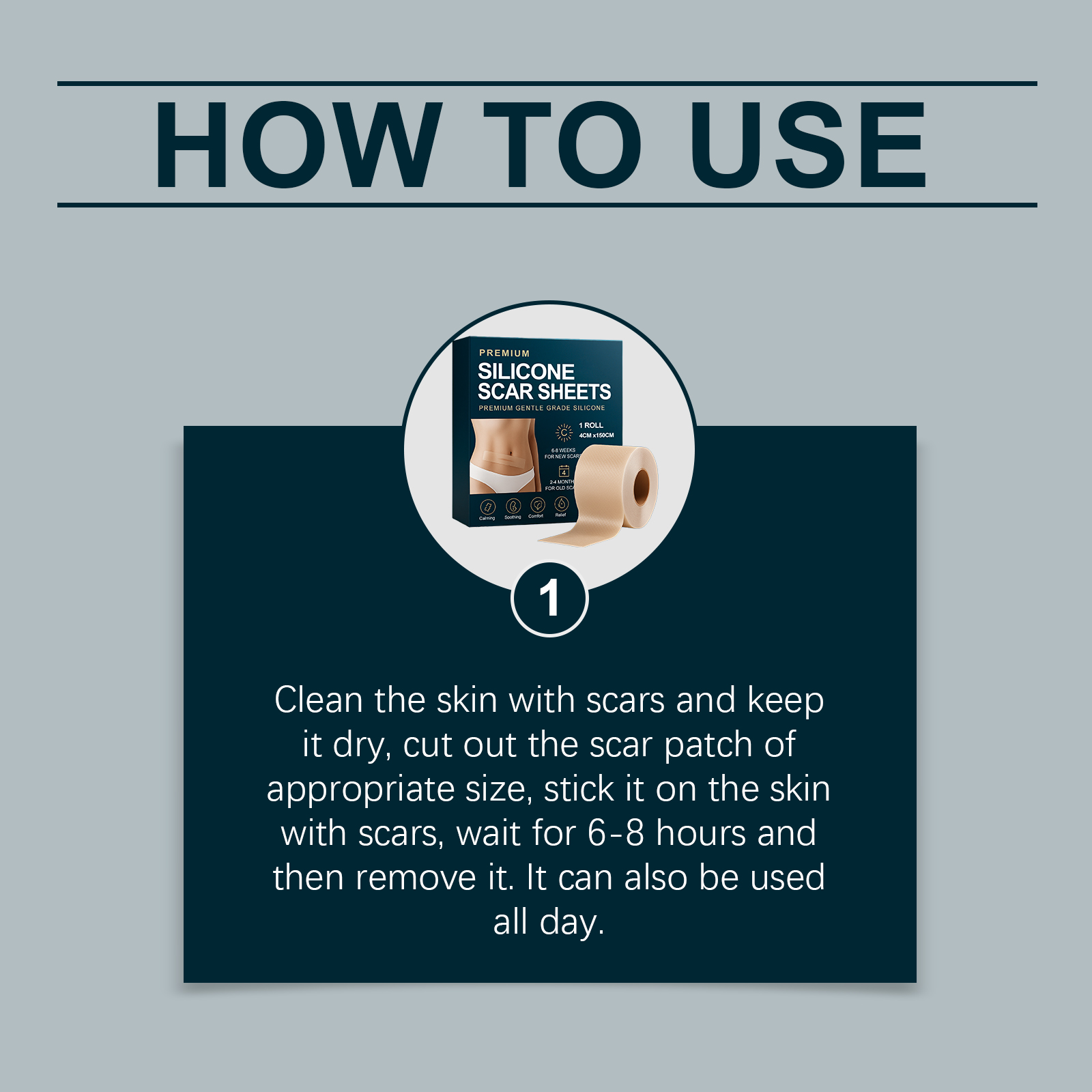 我们的皮肤护理贴片,由甘油、羟乙基纤维素精心调配而成。专为改善疤痕外观,辅助淡化疤痕痕迹,锁住肌肤水分设计。使用方法极为便捷:清洁有疤痕的肌肤并保持干燥,裁剪出大小合适的疤痕贴,将疤痕贴贴在疤痕处肌肤,等待6-8小时后取下即可,也可全天使用。并且它可以防止皮肤折叠,抚平肌肤细纹,保护疤痕免受外部刺激,减少肌肤发红和不适。