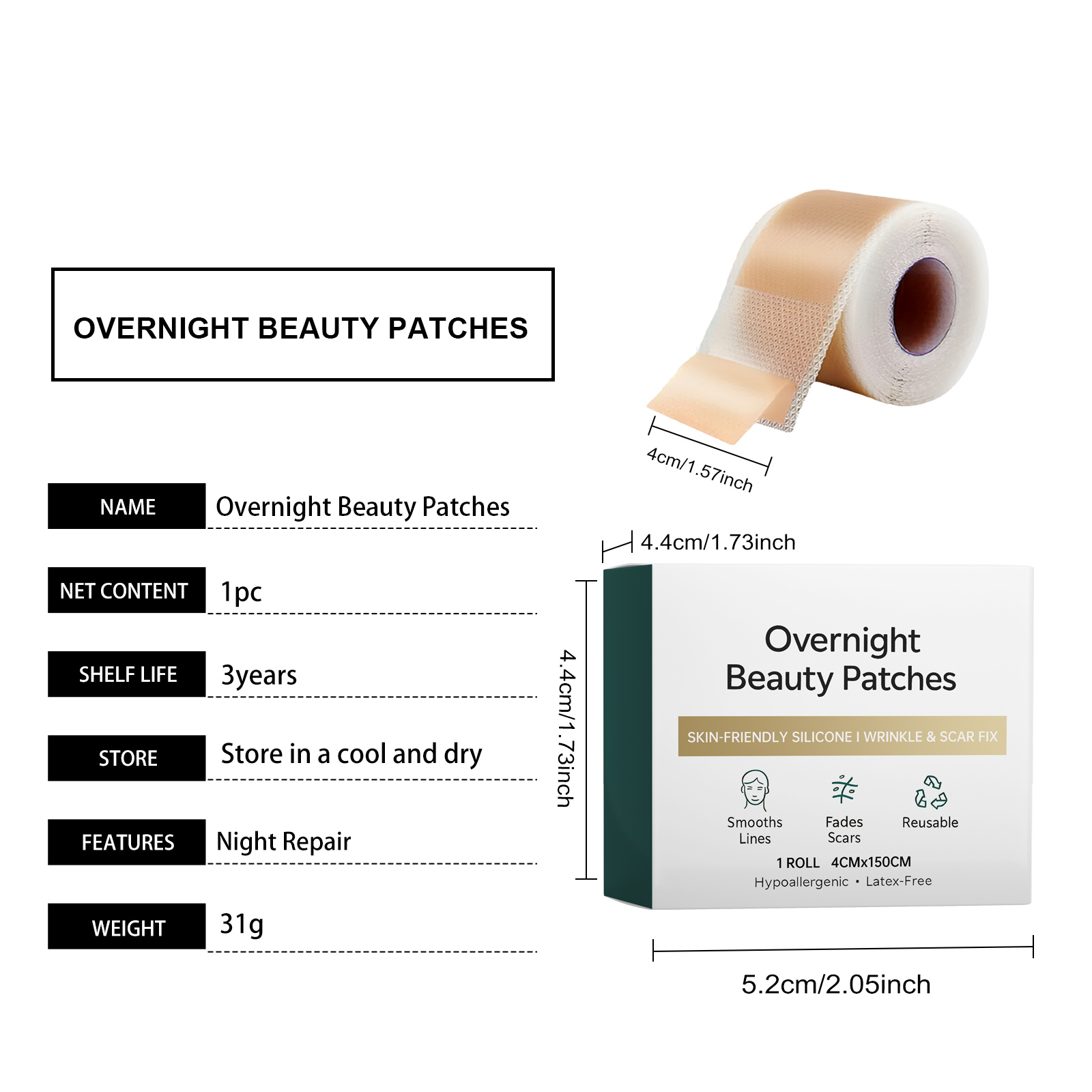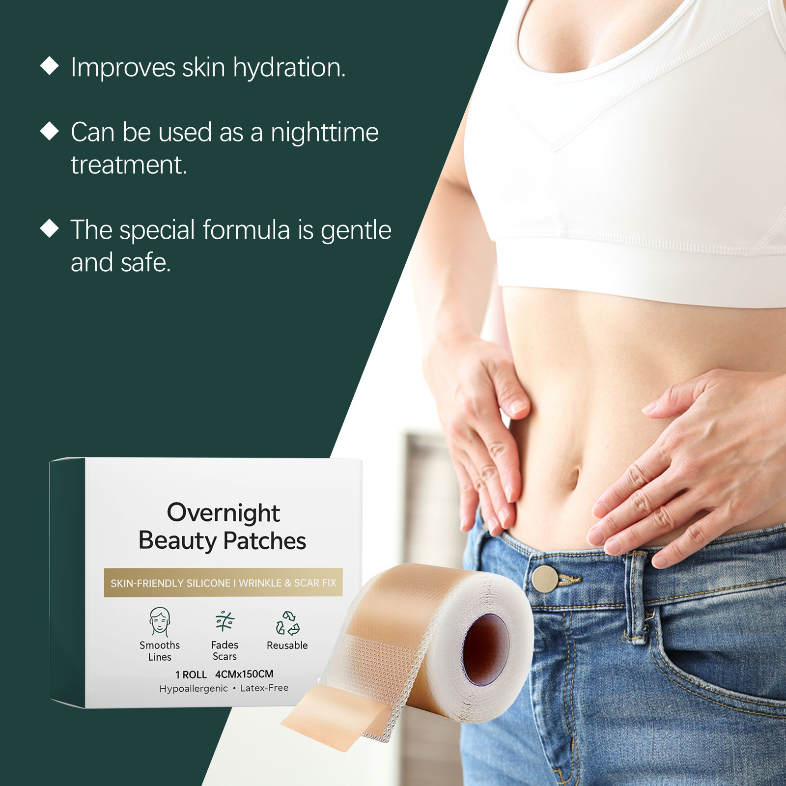 我们的皮肤护理贴,由甘油、羟乙基纤维素精心调配而成。专为改善疤痕组织的水合作用,淡化、软化疤痕设计。使用方法极为便捷:1.在使用前进行皮肤护理并保持滋润。2.根据需要剪裁至适合的尺寸。3.将贴片贴在疤痕或皱纹处,轻轻按压贴片四周,确保贴合。4.贴合12到24小时后撕掉即可。并且它可以抚平肌肤细纹,为有疤痕的肌肤提供护理。